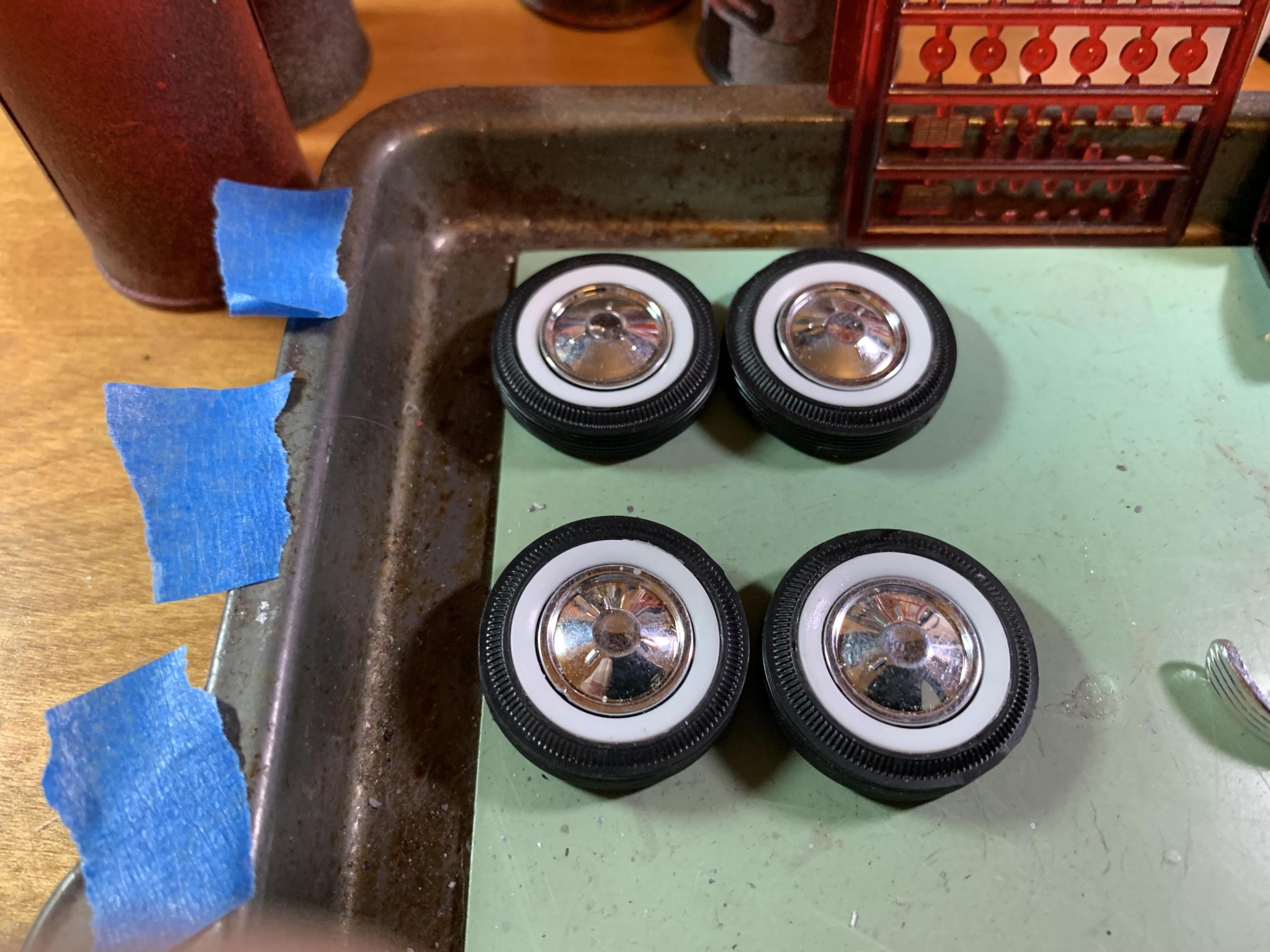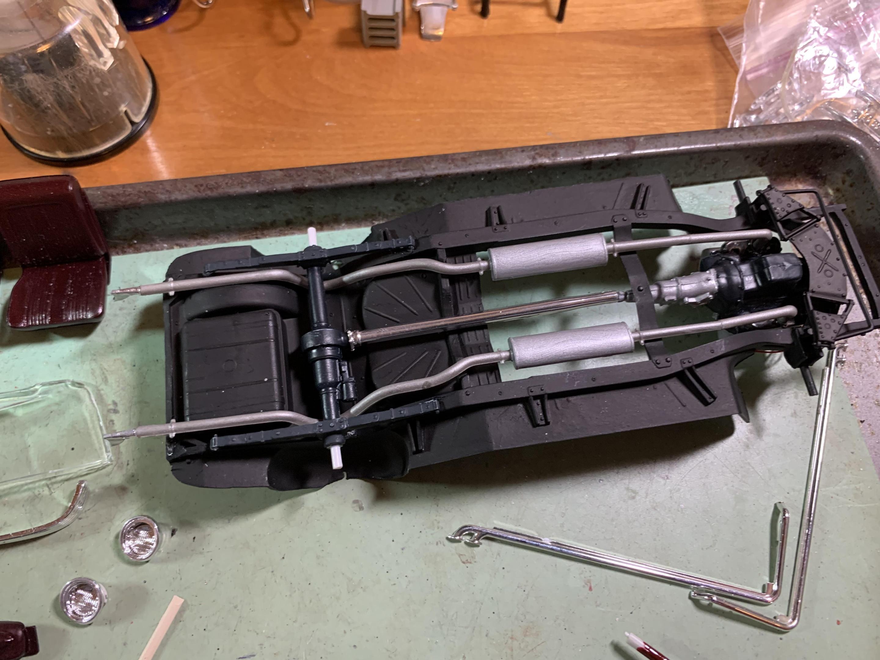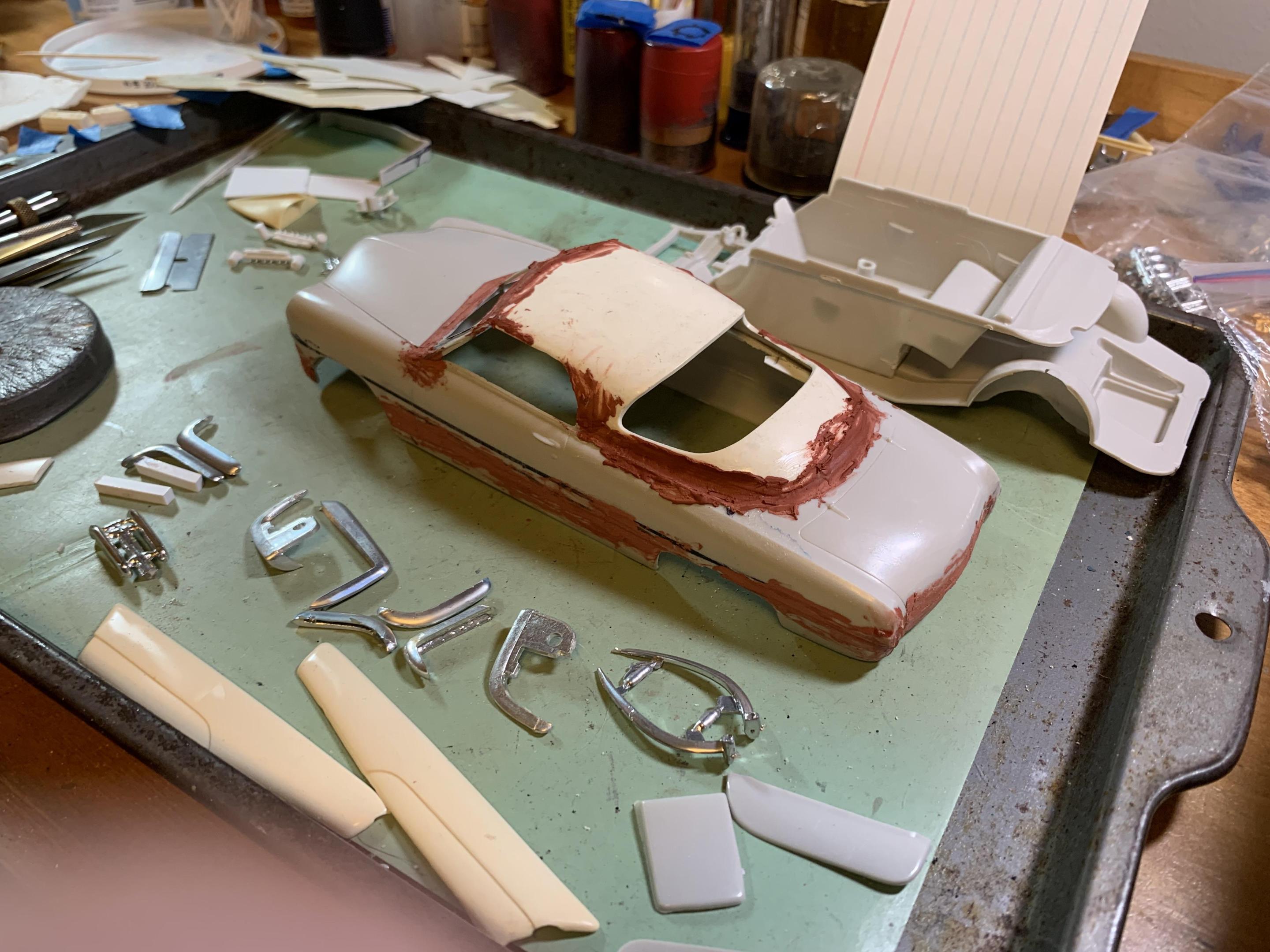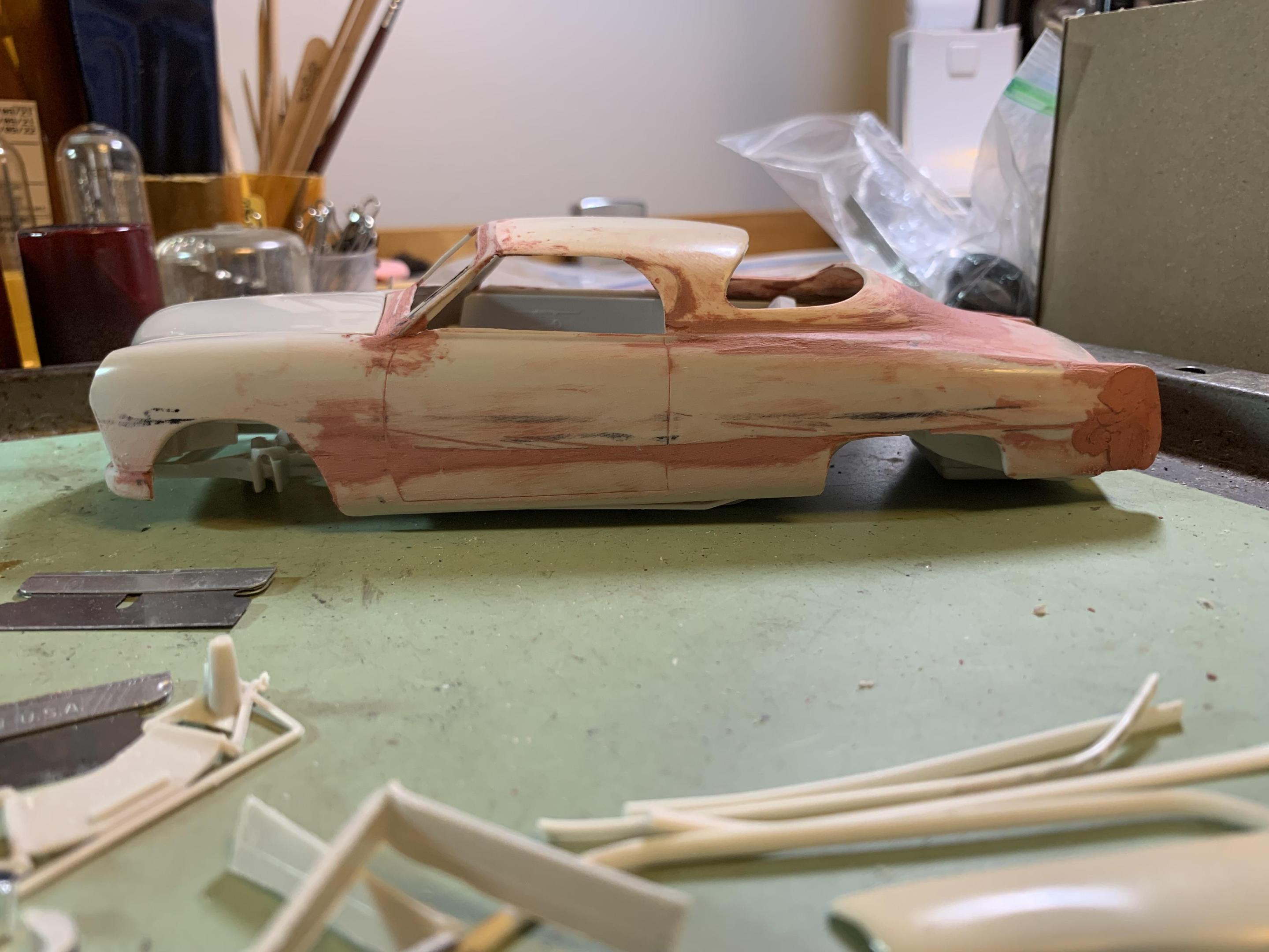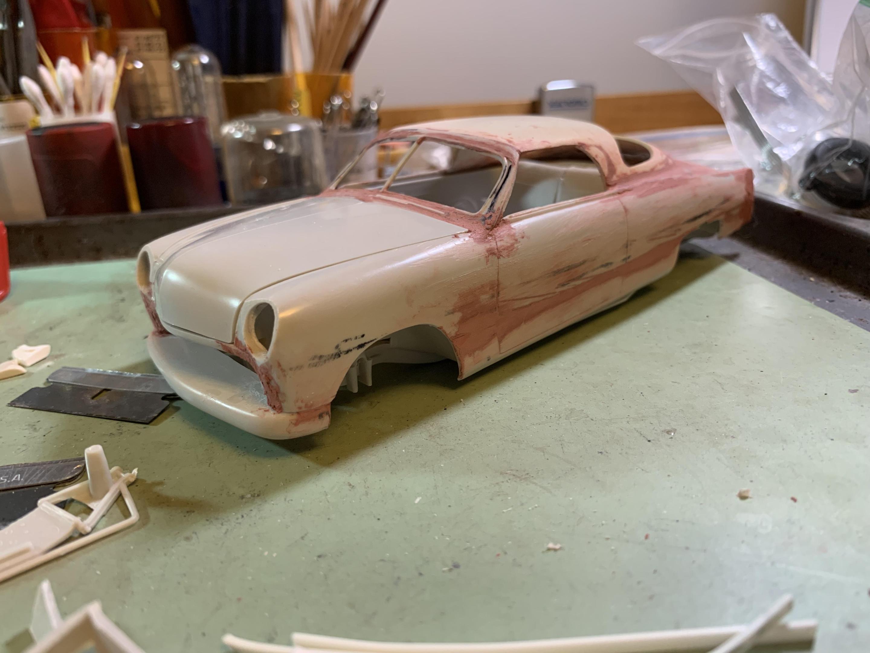 More progress, of a sort- the primer I used seems to not like drying and hardening- still sort of rubbery, and really clogs the sanding stick. First time for re-scribing panel lines. Decided to divide the rear window opening reminiscent of 49 Mercury, using 0.10" half round stock. Got a lot of chassis work done including installing the fishtail exhaust tips. Still need to fiddle with the rear suspension- not sitting low enough- already reversed the arch of the springs (shades of torching springs back in the 40's and 50's)- and need to add shocks. Started laying in the tuck "n" roll upholstery- we shall see if this stays, I'm not yet thrilled with the outcome- definitely will need more paint to pull it together. The 53 Studebaker wheel covers now have chrome trim rings and brake backs. Mocked up the Avanti headlight buckets and DeSoto bumper from Revel 49 Mercury to be used as the front grille. More pix when I get more done!