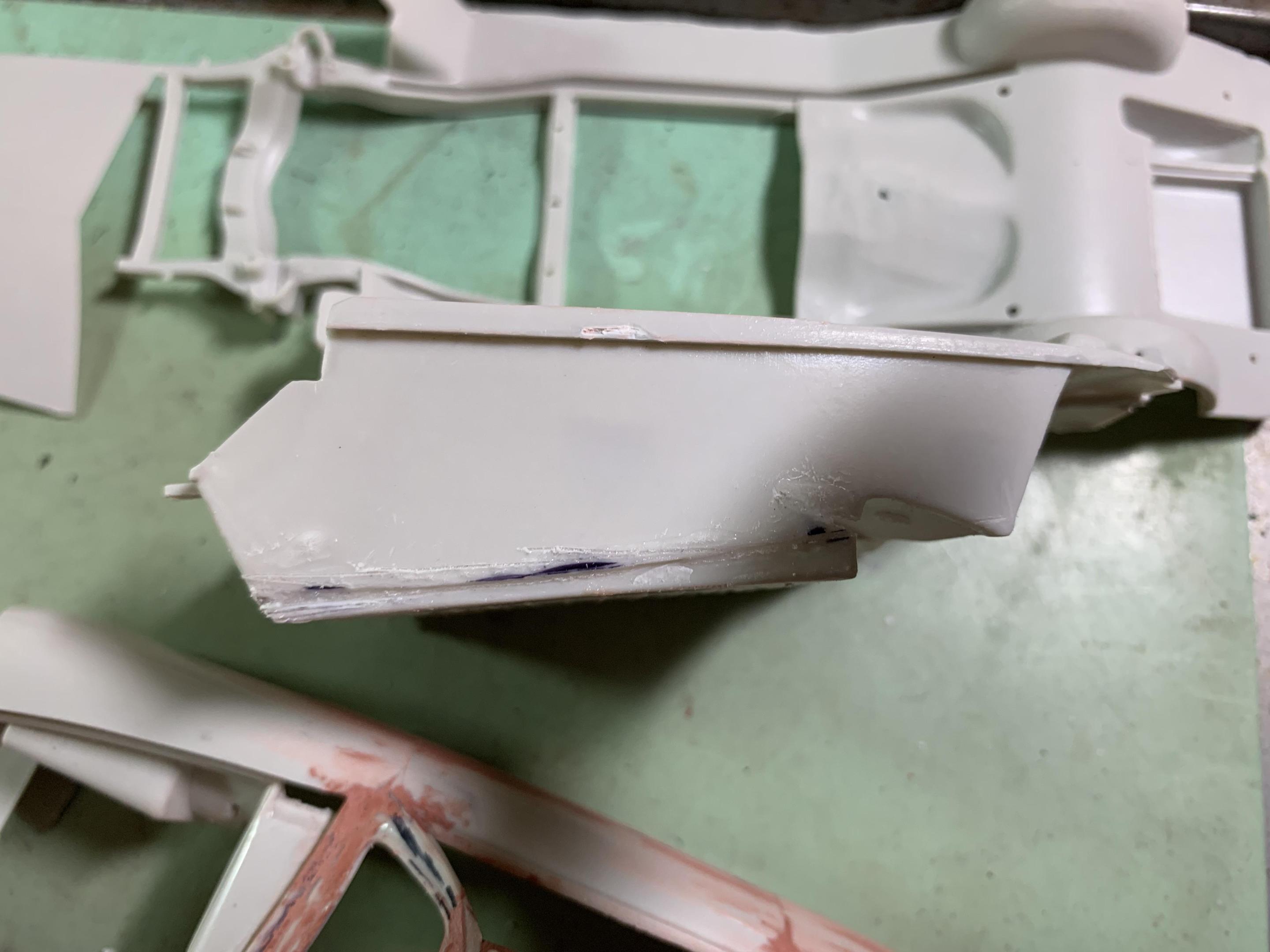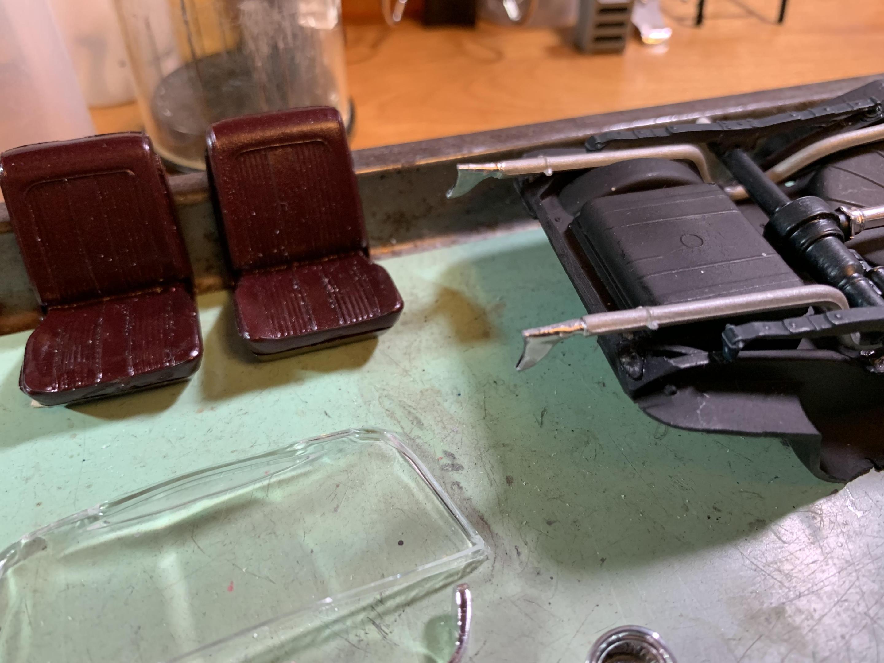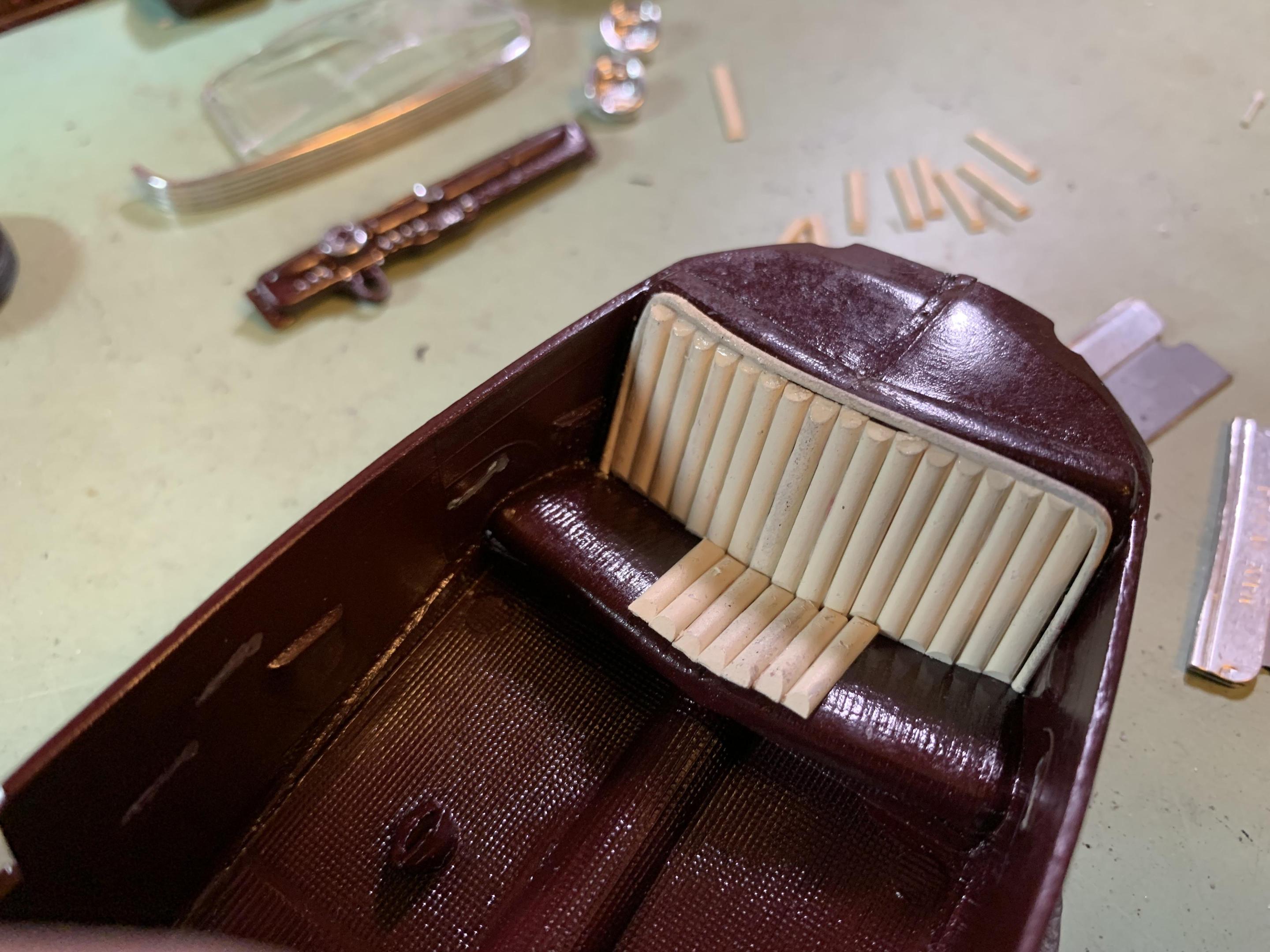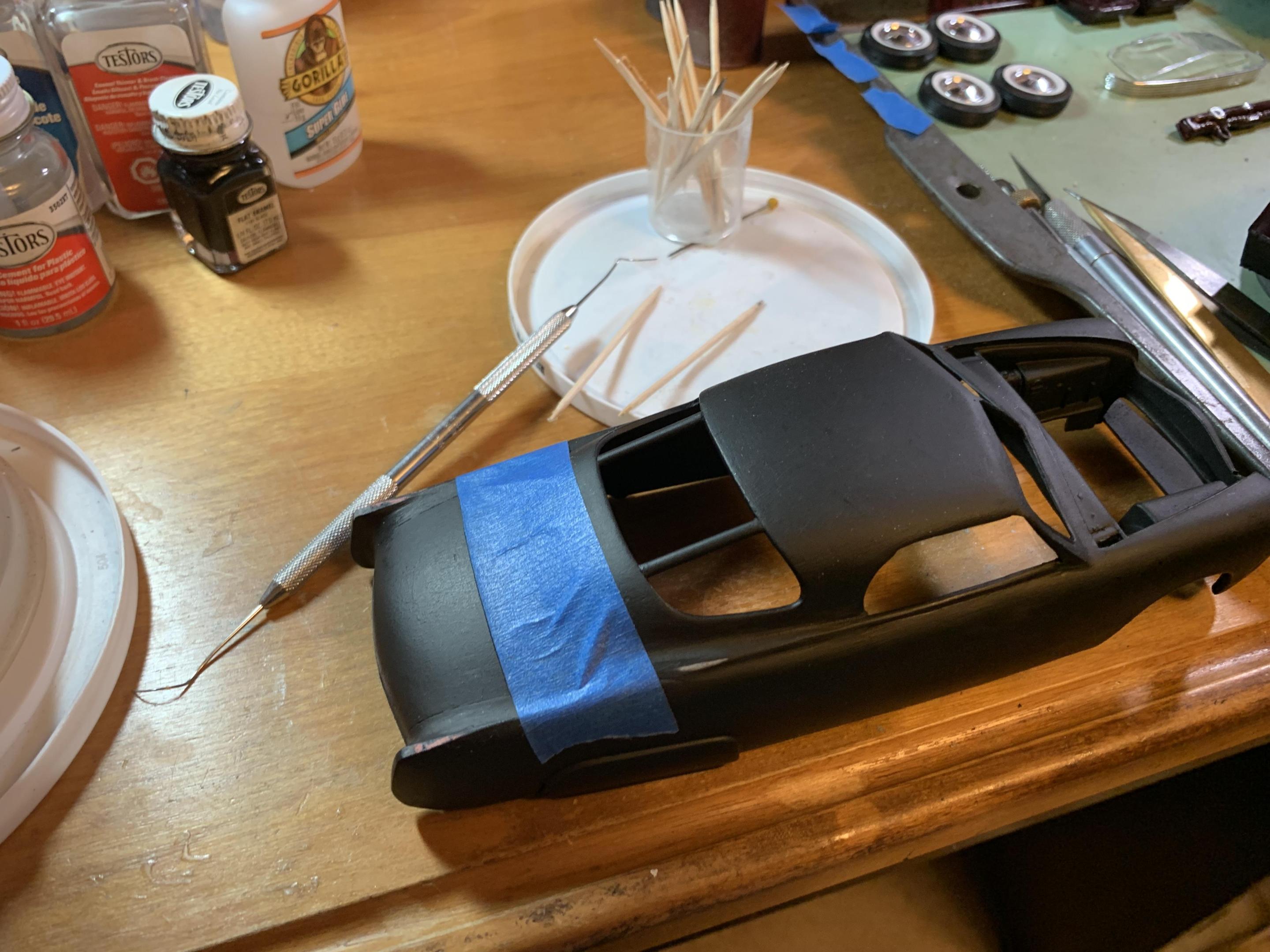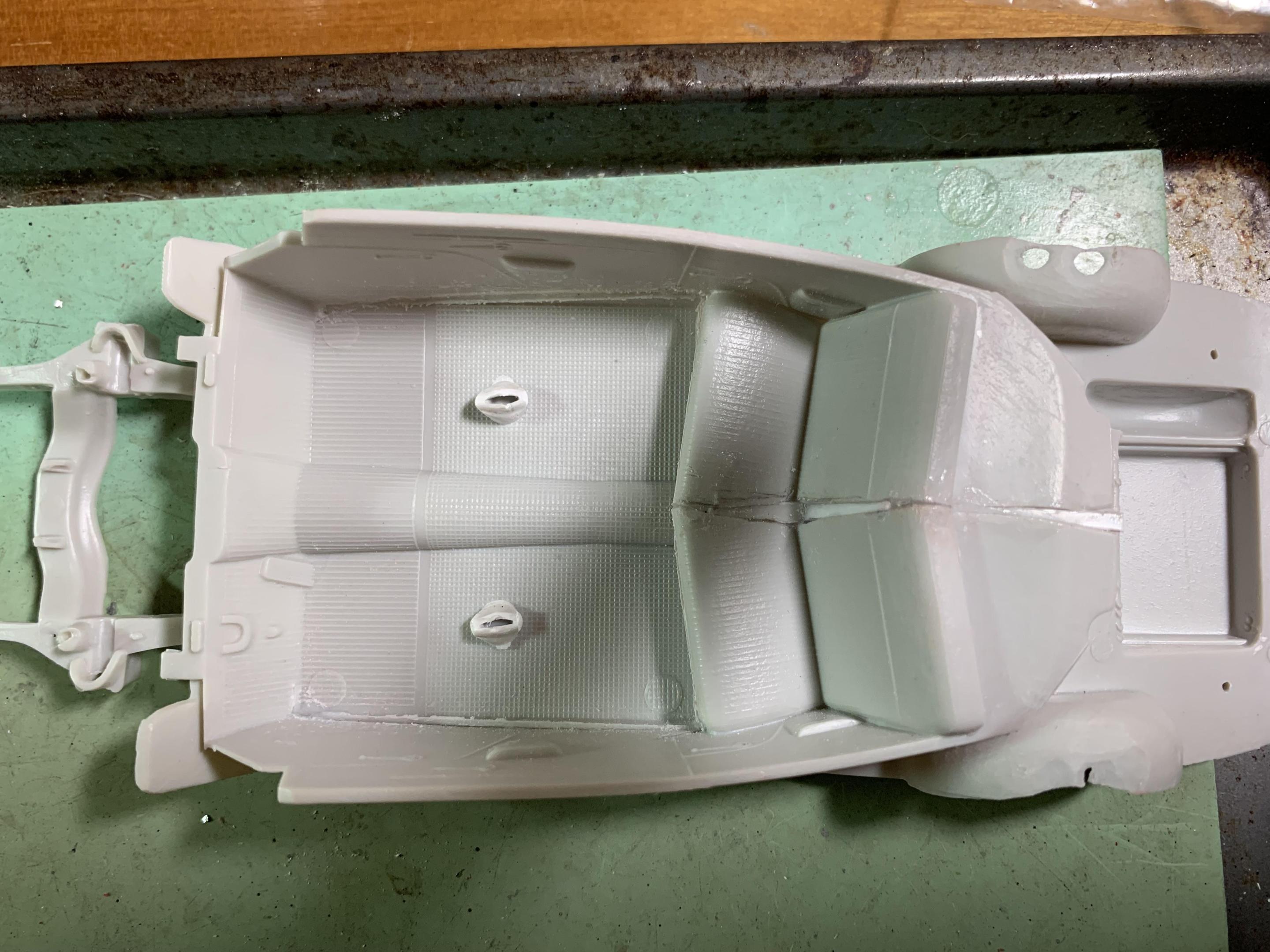Well, things have not gone to plan, so alternatives are being tried. The tuck "n" roll upholstery did not work at all- I did not anticipate as much curvature to the seat- and the half round did not want to bend to conform. Also the "blazing black". which I thought would be a metallic loaded black, seems to dry rather flat, with no metallic visible, but becomes a reasonable gloss black after gloss coat is applied. Definitely disappointing. The attempt to scribe panel lines was also a dismal failure- so that will wait for a project with less putty. Well, onward through the fog!
