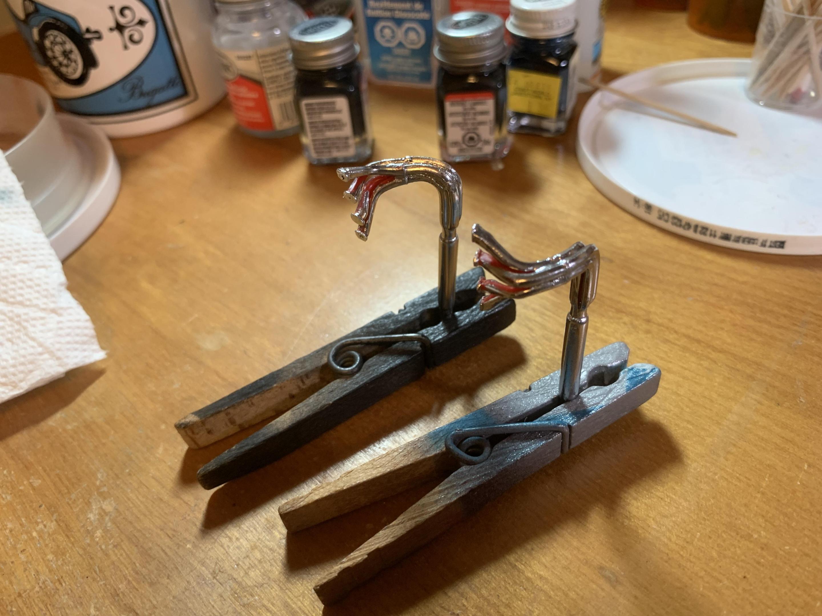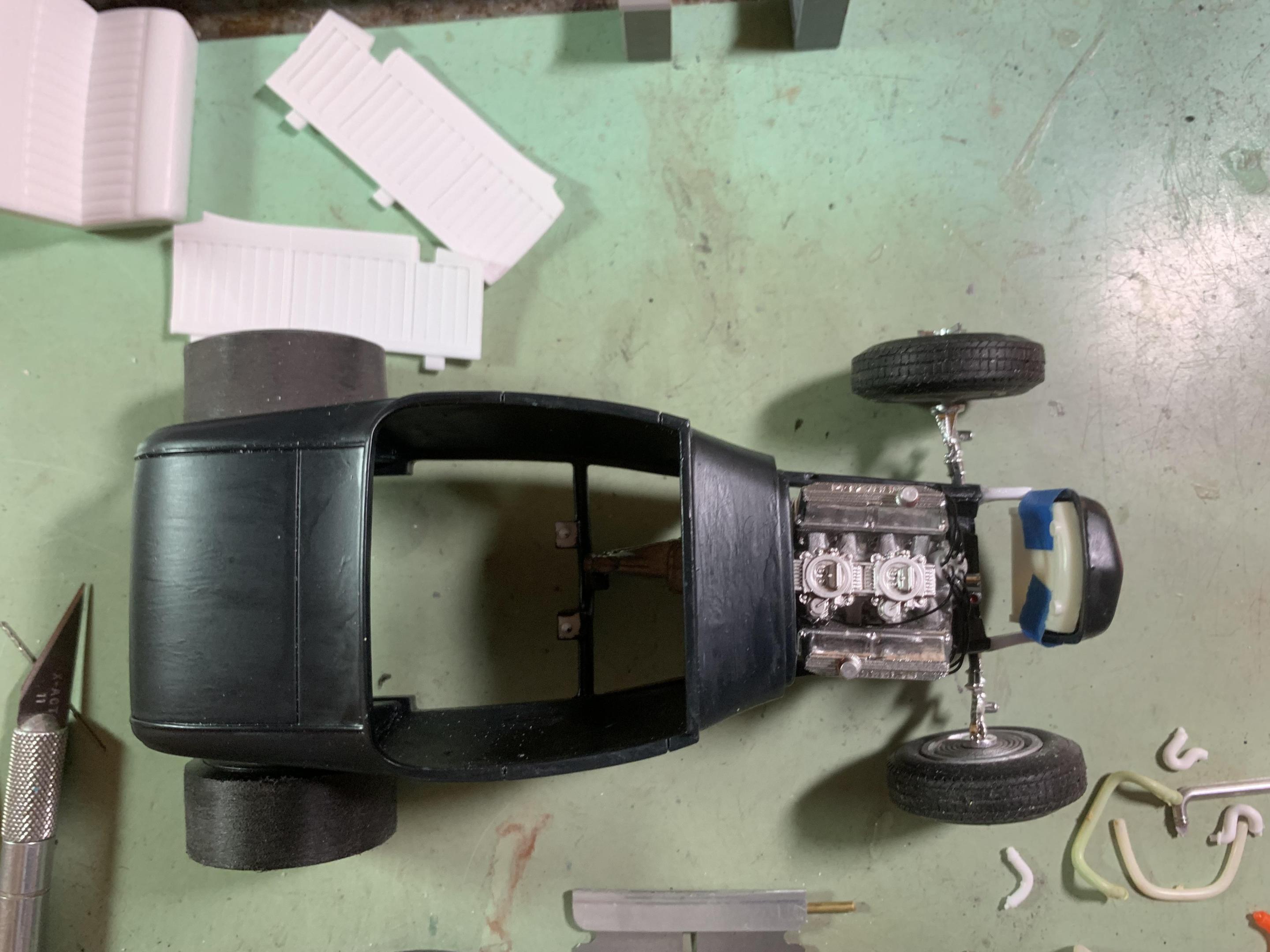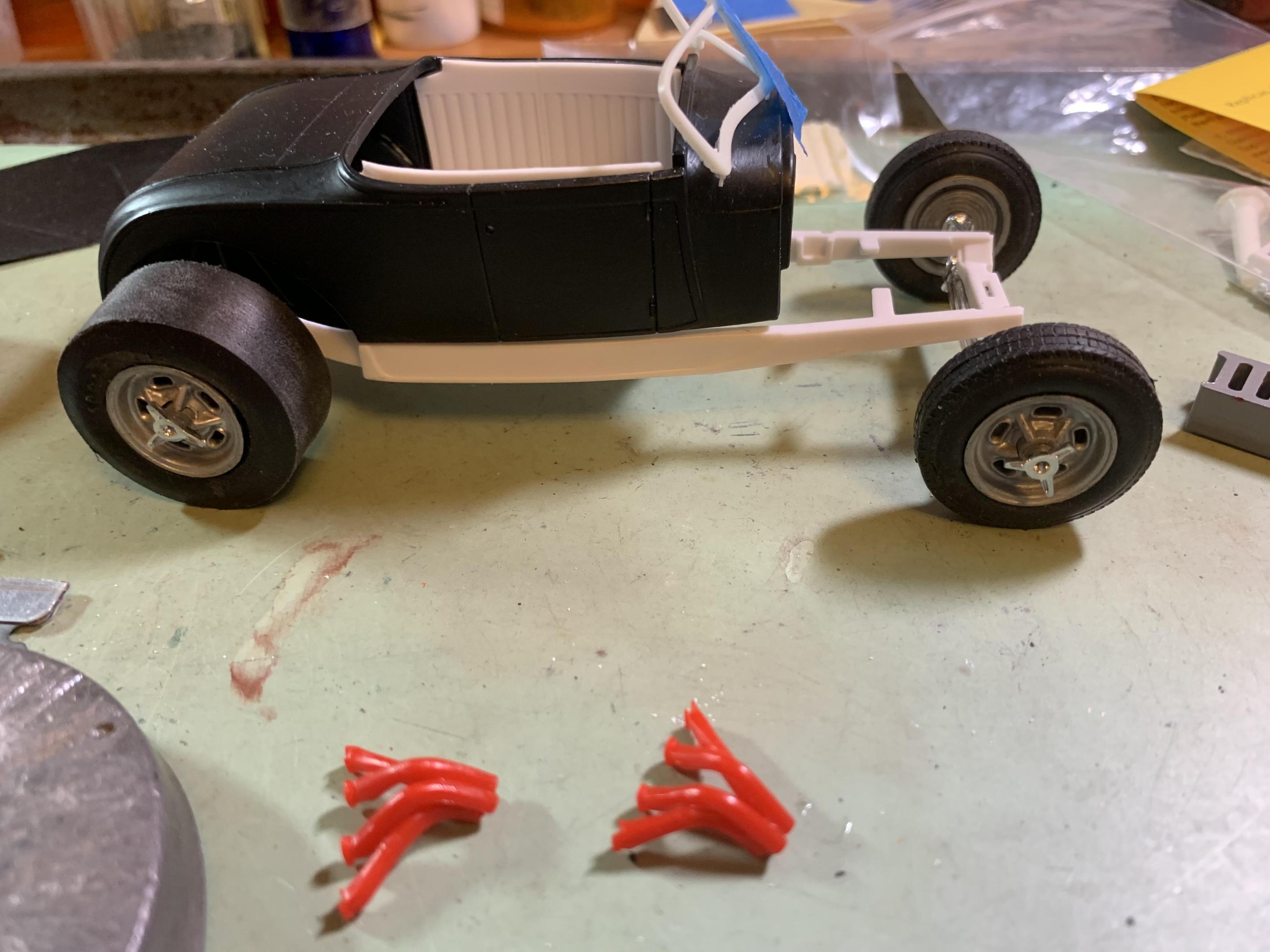 Thanks much, Kit- always a Ford in a Ford! Getting the floor and side panels painted, and glued the rear end in place- working on the tube shocks now- cleanup and then a trial fit to see about final mounting. Also completed the Molotowing of the headers- don't know if I'm brave (or stupid enough) to try a little heat discoloration.............. Working on the engine's front end- things weren't square and my initial idea of hard pipes to the radiator wasn't working- going to try soft rubber tubing from a set of Betsy's ear buds which died- she gives me all kinds of stuff which might be useful, including jewelry wire and other stuff- nice to have a very supportive wife- but after all, she was sanding wood spoke wheels on a family project car when she was six!