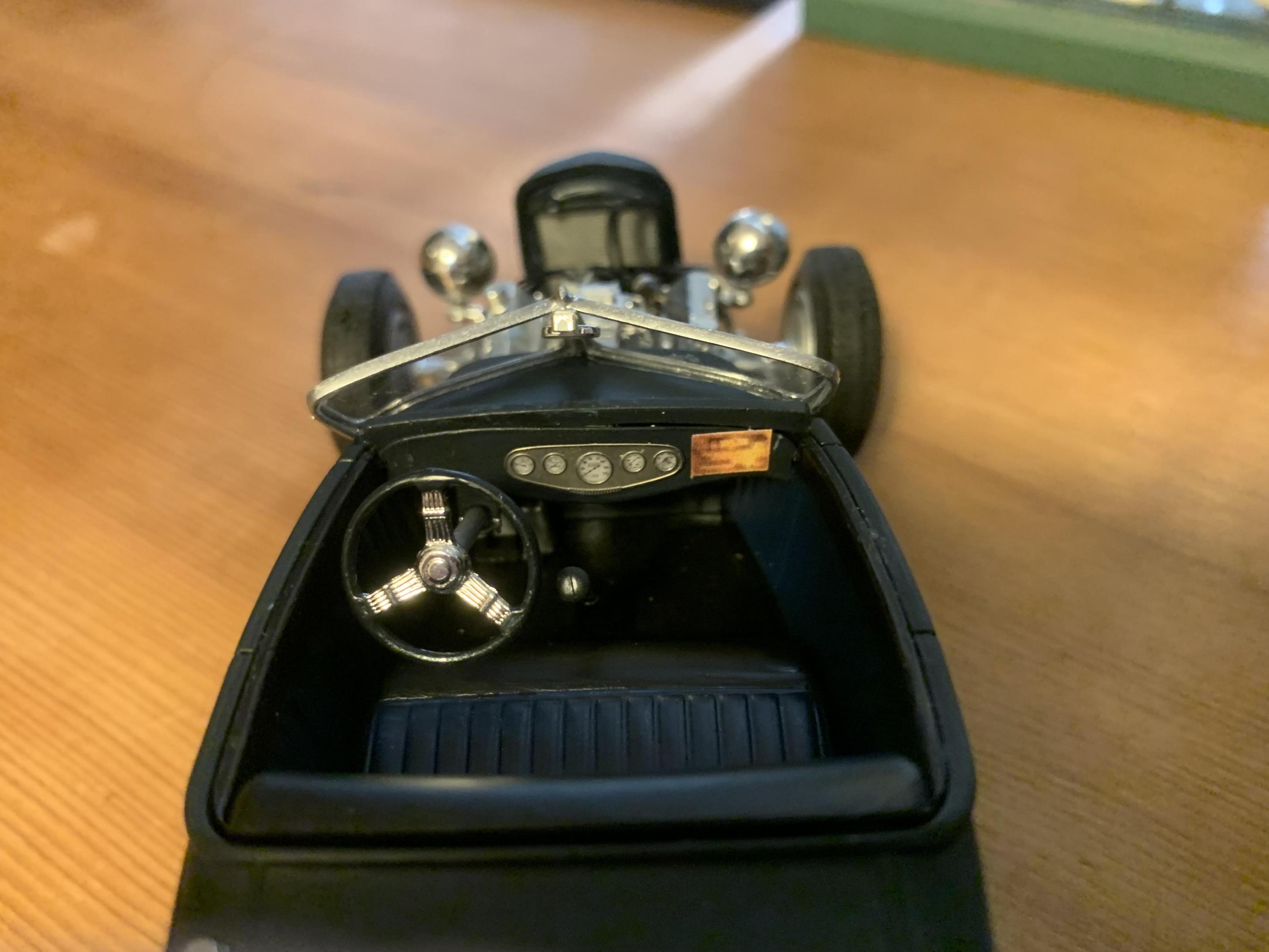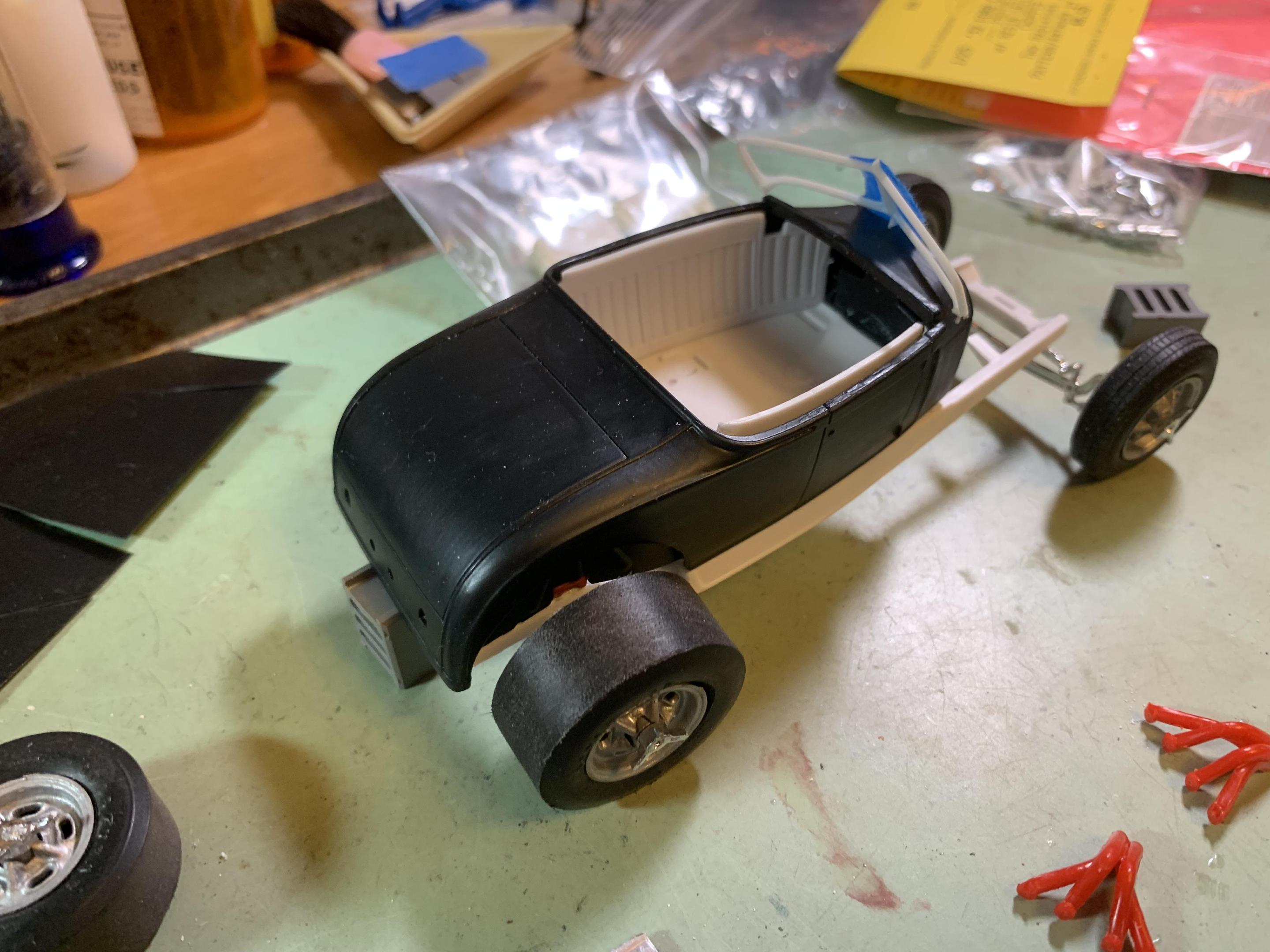 Start of a new project- Revell's Model A but with a 427 Ford instead of the nailhead. Front end will be lower by raising the front crossmember spring perch and possibly removing a leaf in the front spring. Color is Testors gunmetal- very dark slatey blue which will be dull coated after a little sanding. Frame an bottom of floor pans will be the same. Also using a chopped Deuce grille from Replicas and Miniatures. -