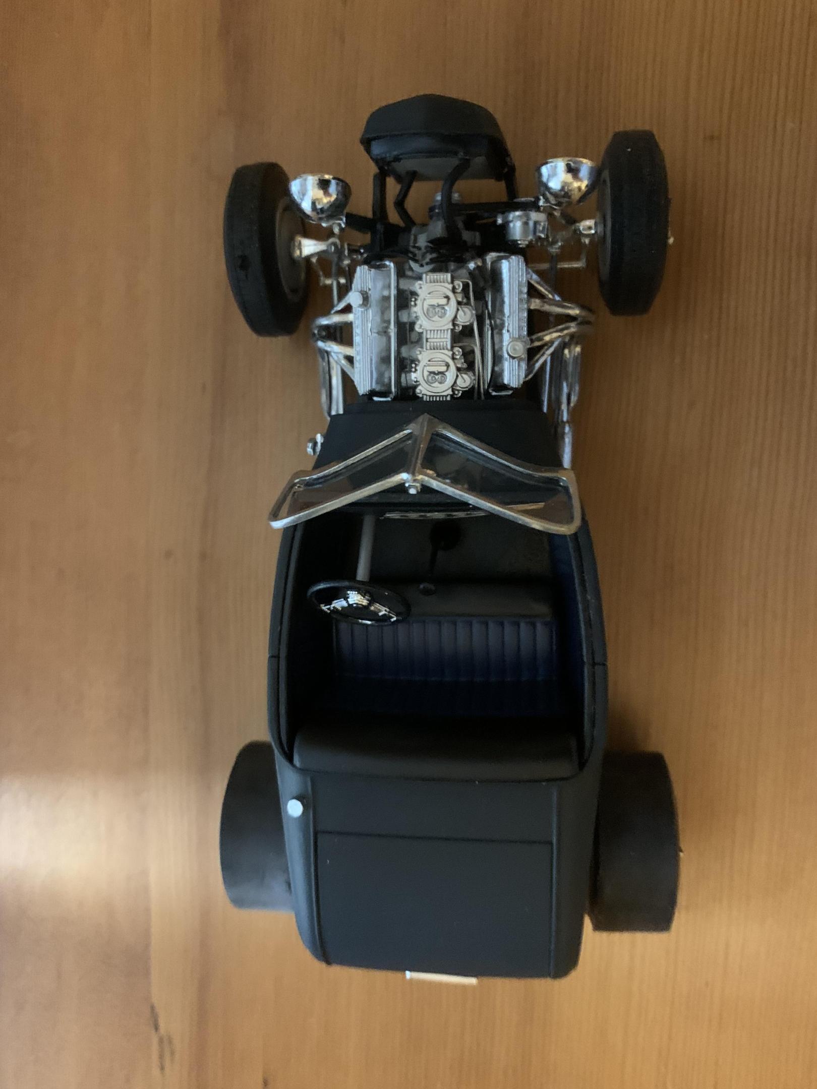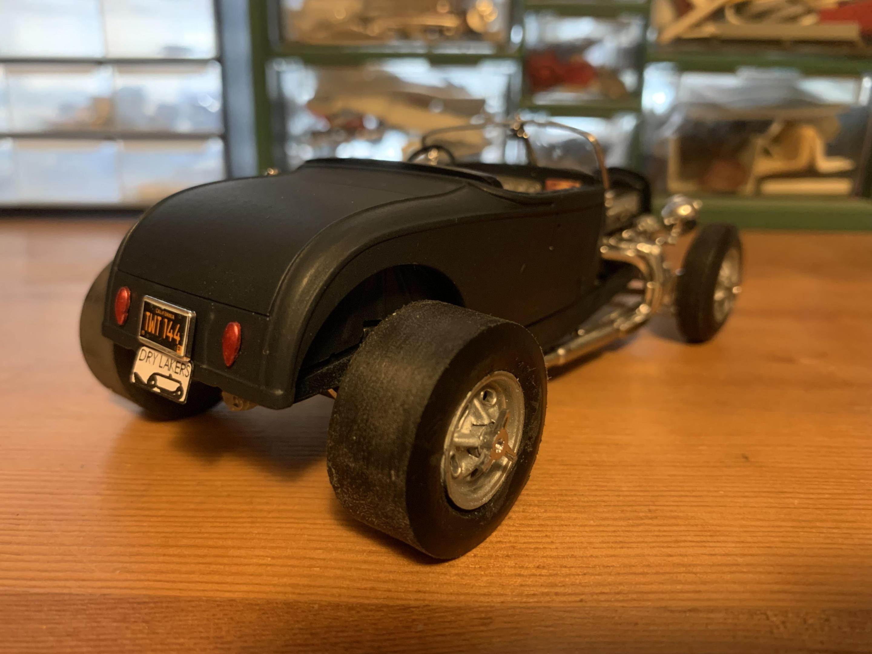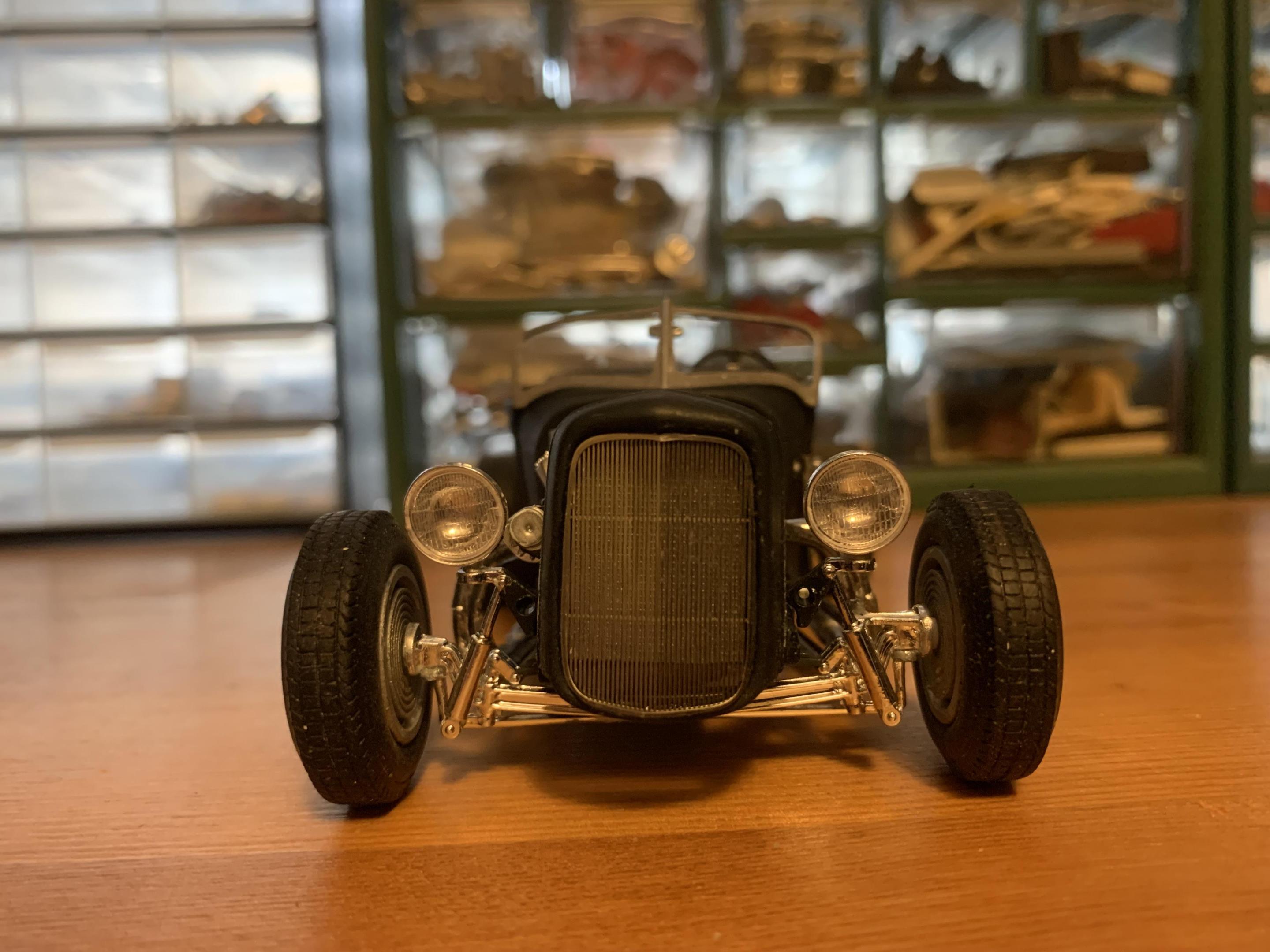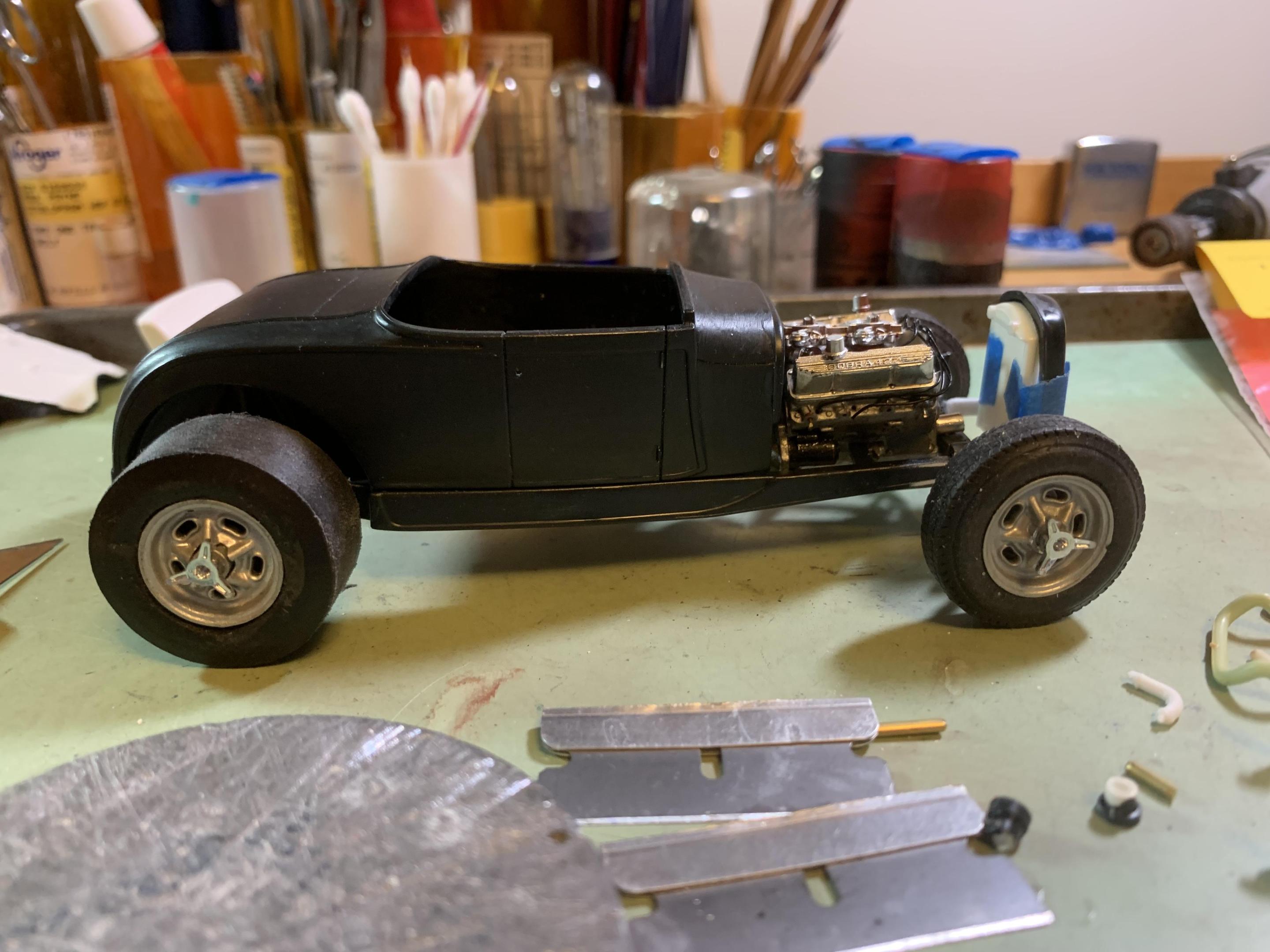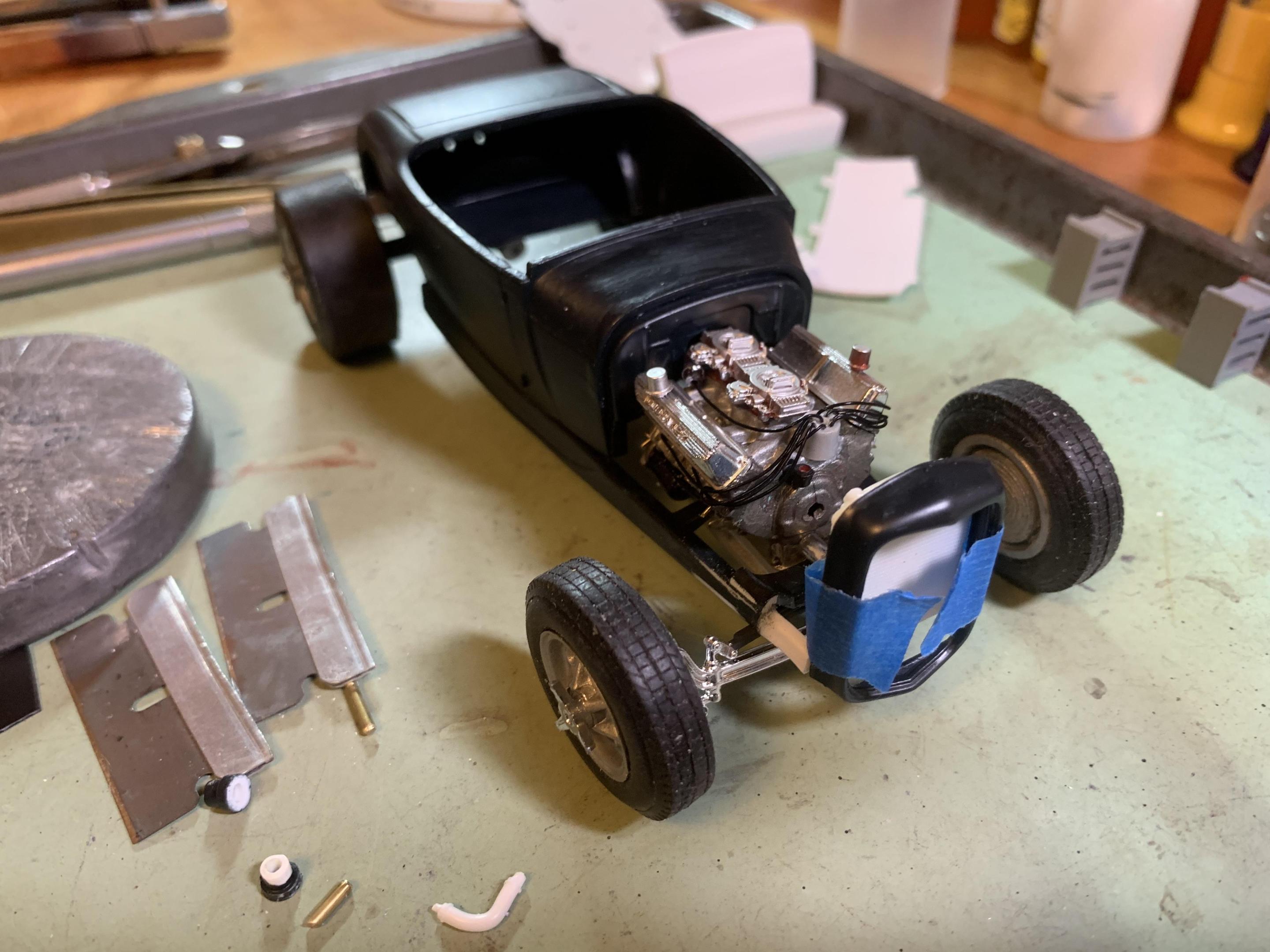 Starting one of my Revell 29 Model A's. Decided to use a Ford 427 side oiler I have had lying around. Interesting fit challenges since the water pump and pulleys are longer than the nail head in the kit. The paint is not black primer, it's actually Testors gunmetal, which is a very dark slatey blue. It will be dull coated after some sanding to even it out. Thinking of black and sea blue for the interior, and a Hallock V windshield from Replicas and Miniatures. Also plan on using the Cobra headers which were stripped, filled, and sanded and are in process for Molotow chrome. The chassis has a Model A rear spring cross member grafted in and the front spring cross member was raised. I like the stance- the oil pan hangs low enough that we need some clearance so not too low, and definitely level. The wheels are ancient- got them in a box of parts and no idea what they are from- molded in metallic blue plastic with the old style brake drums molded to the backs.