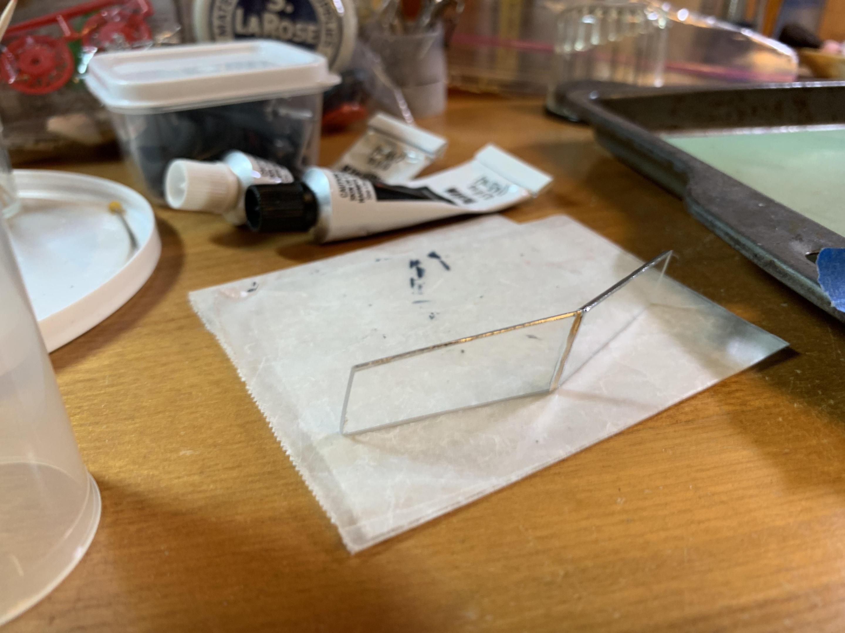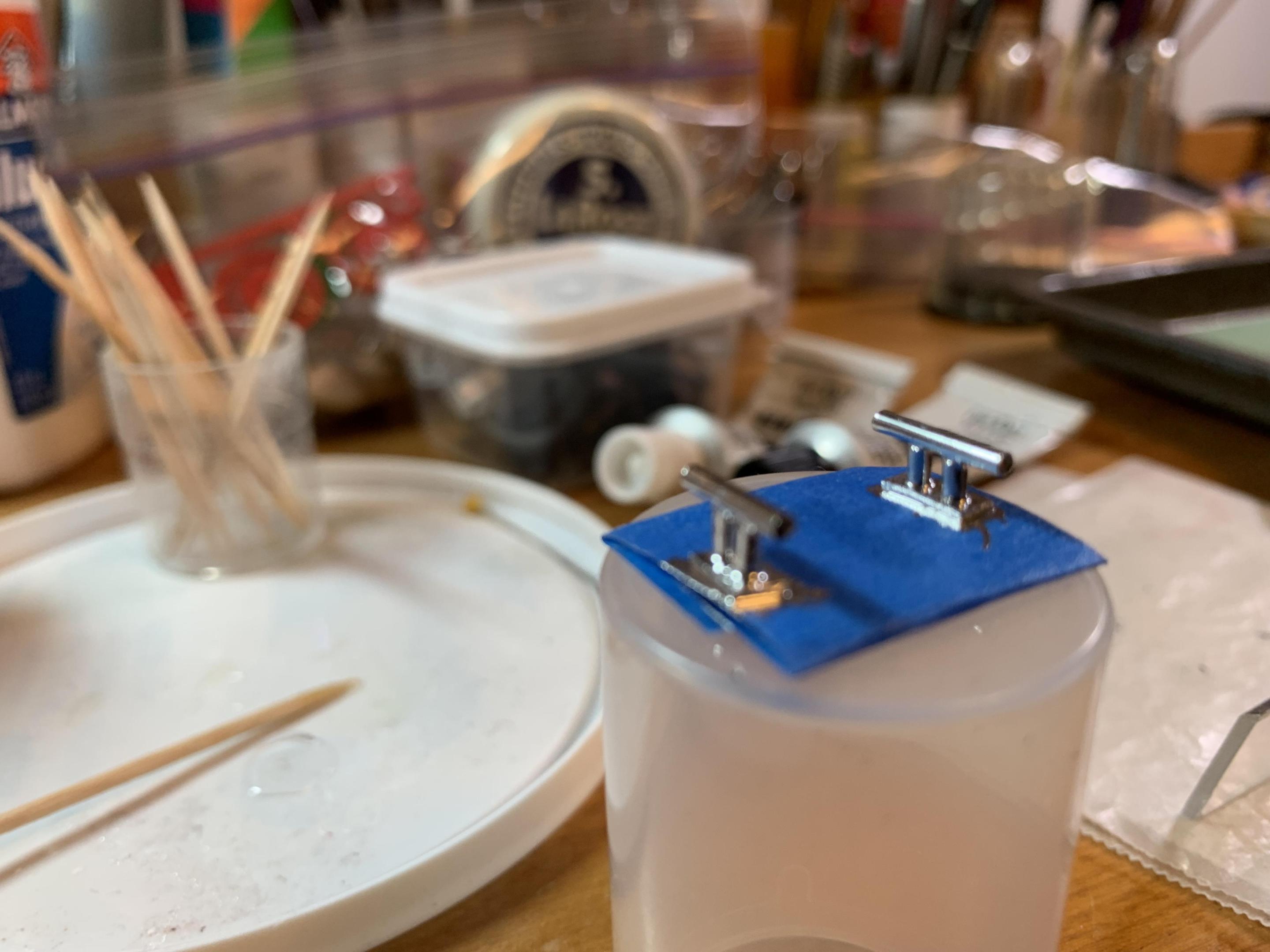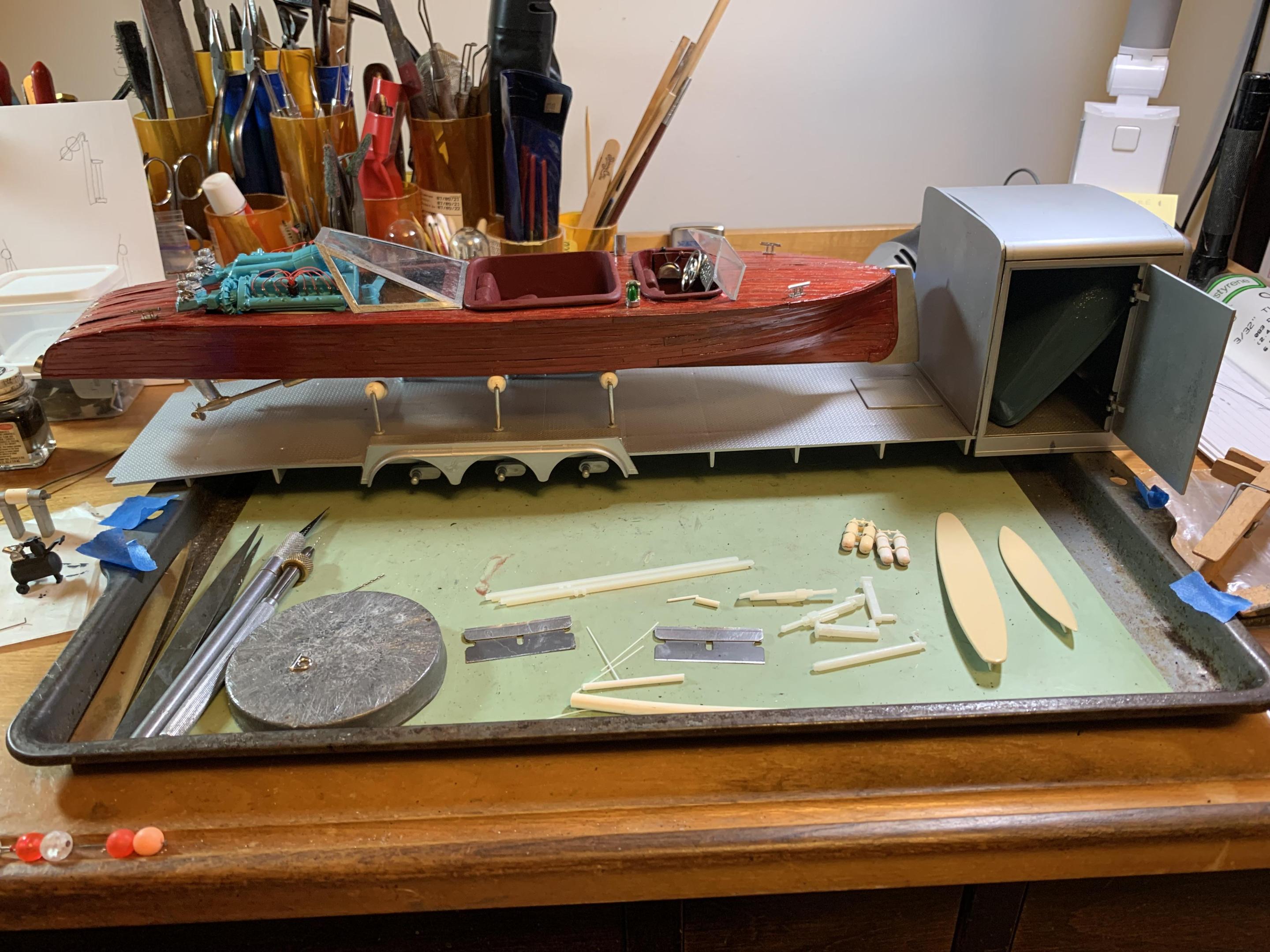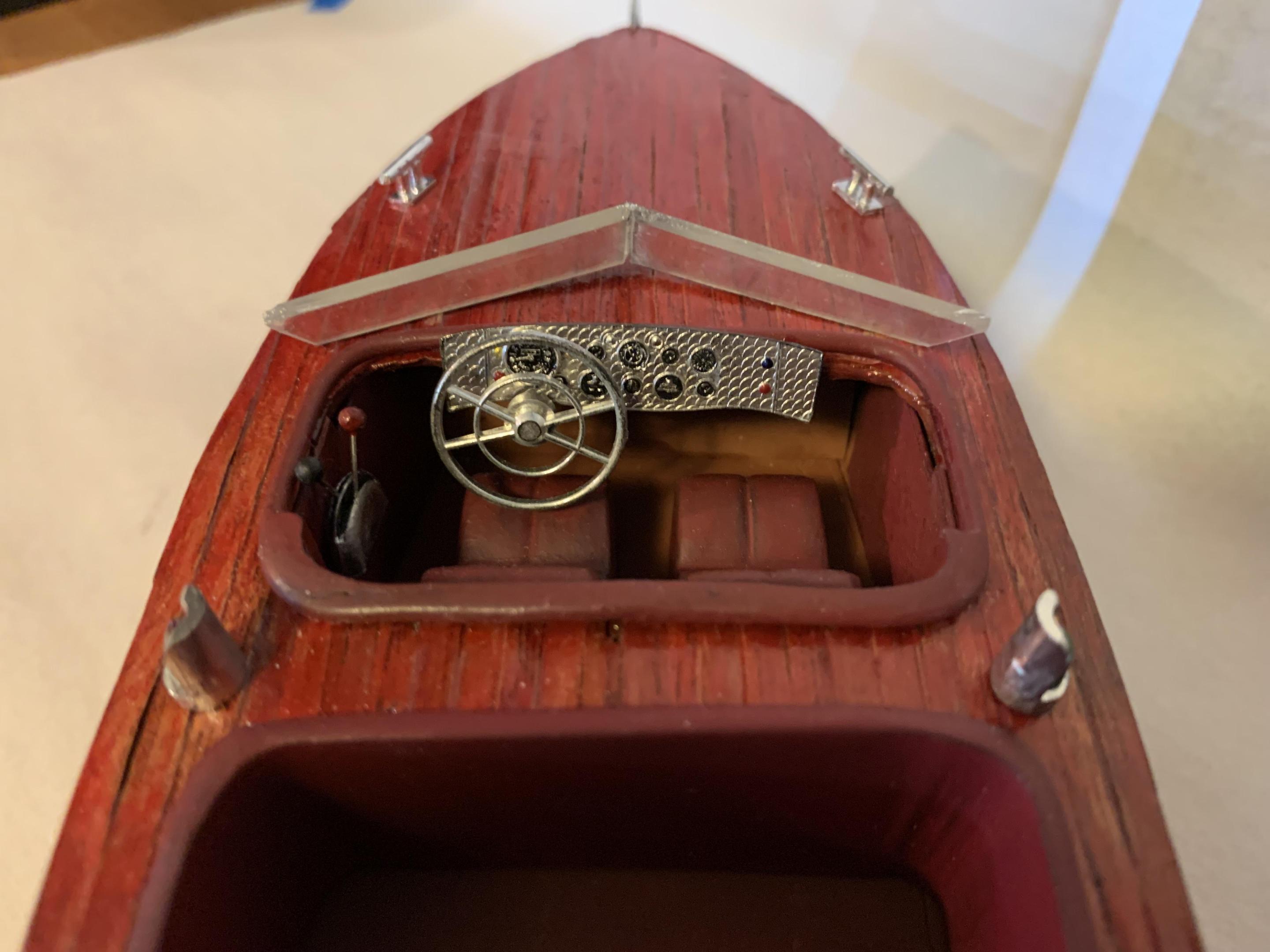 Progress! Built, painted, and installed the control levers for the forward, neutral, and reverse gear box (seen in the engine windscreen pix). Was able to get a nice windshield built, now in the process of applying Molotow chrome (pic shows the windshield upside down). Also am fabricating deck mooring cleats from rod stock, got two of them Molotowed as well. Cut out the "glass" for the engine windscreen and cut the openings in the lower section. These are ordinary card stock, folded to shape. Upper section yet to be cut, will sandwich the transparent stock between them after giving both a Molotow bath! -
