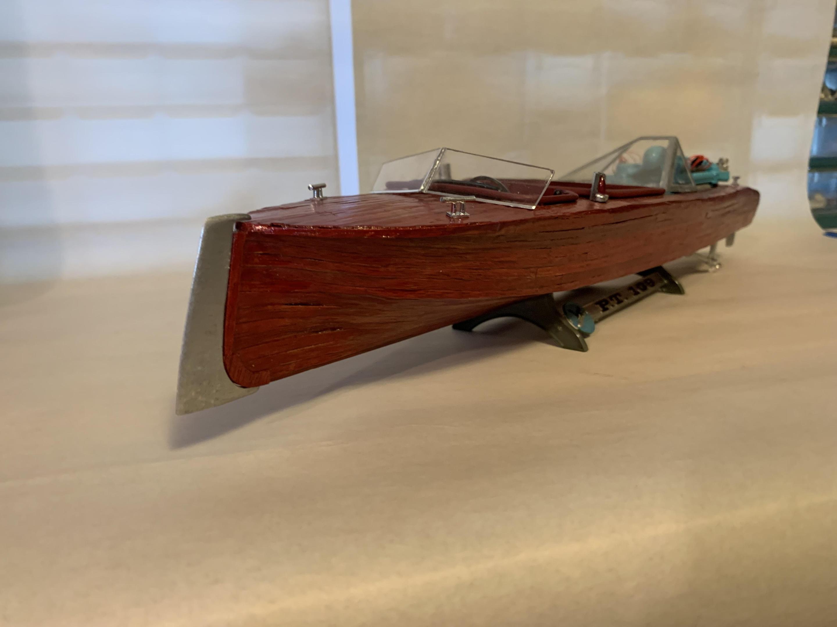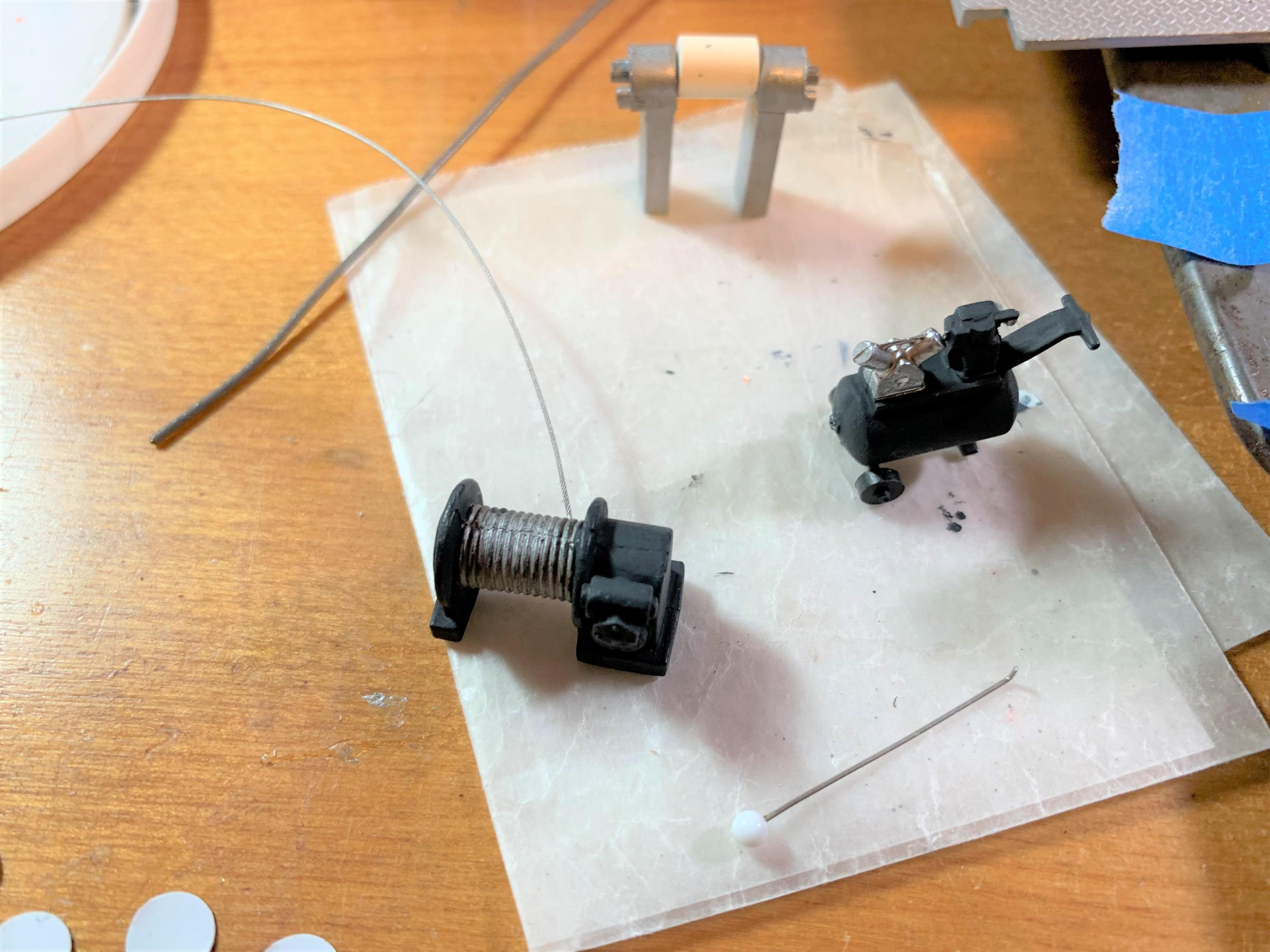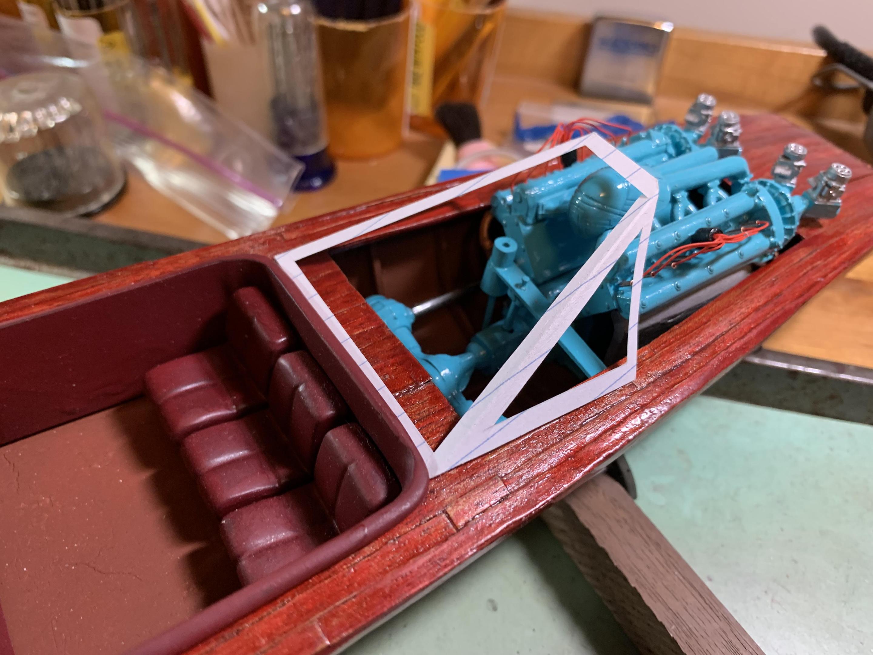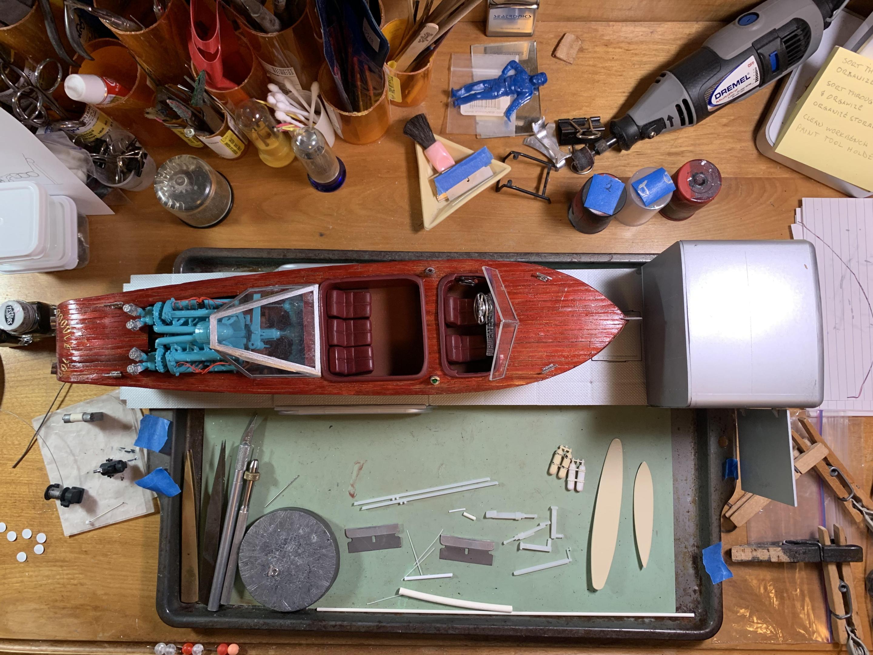 Progress! Built, painted, and installed the control levers for the forward, neutral, and reverse gear box (seen in the engine windscreen pix). Was able to get a nice windshield built, now in the process of applying Molotow chrome (pic shows the windshield upside down). Also am fabricating deck mooring cleats from rod stock, got two of them Molotowed as well. Cut out the "glass" for the engine windscreen and cut the openings in the lower section. These are ordinary card stock, folded to shape. Upper section yet to be cut, will sandwich the transparent stock between them after giving both a Molotow bath! -