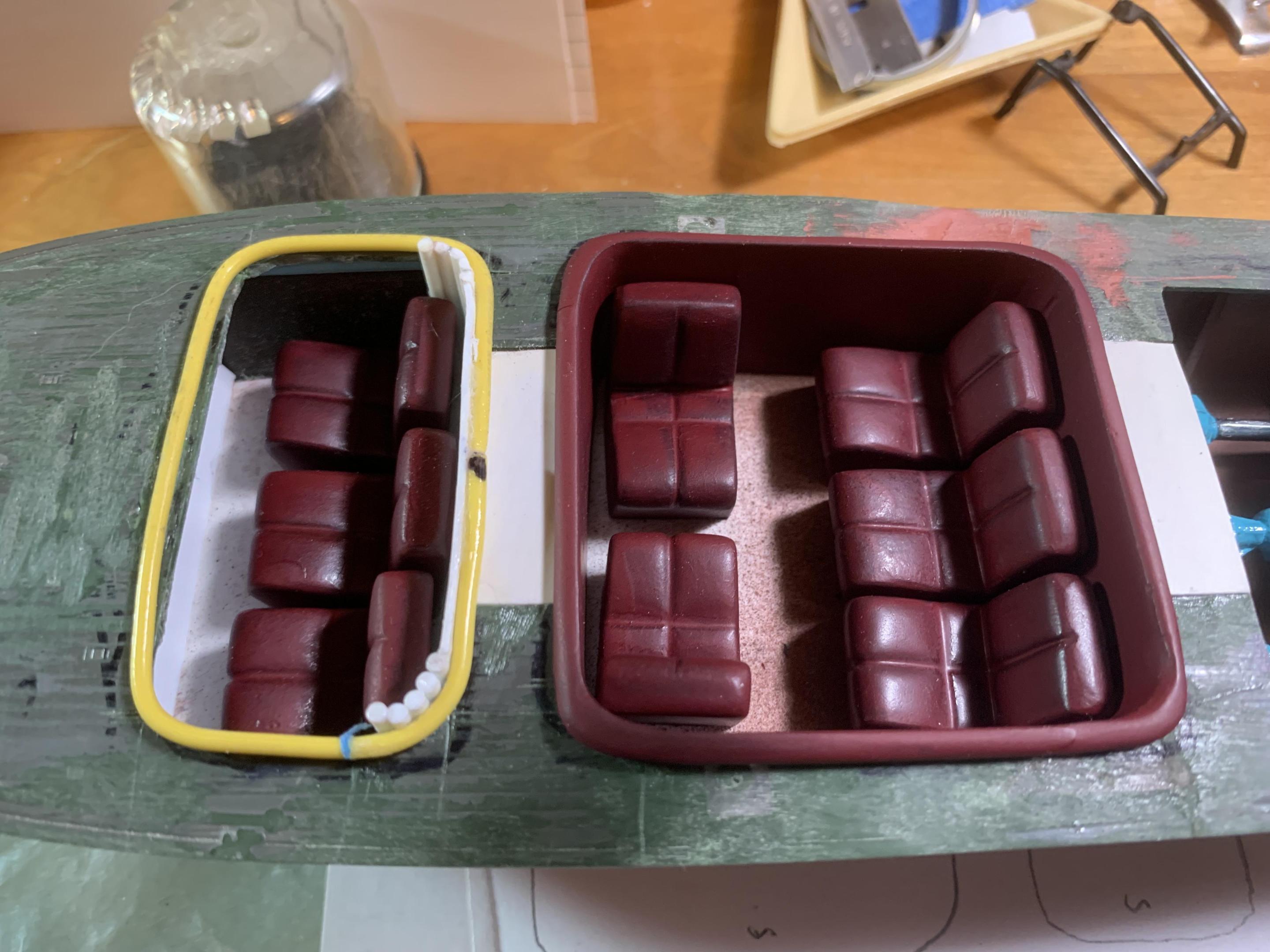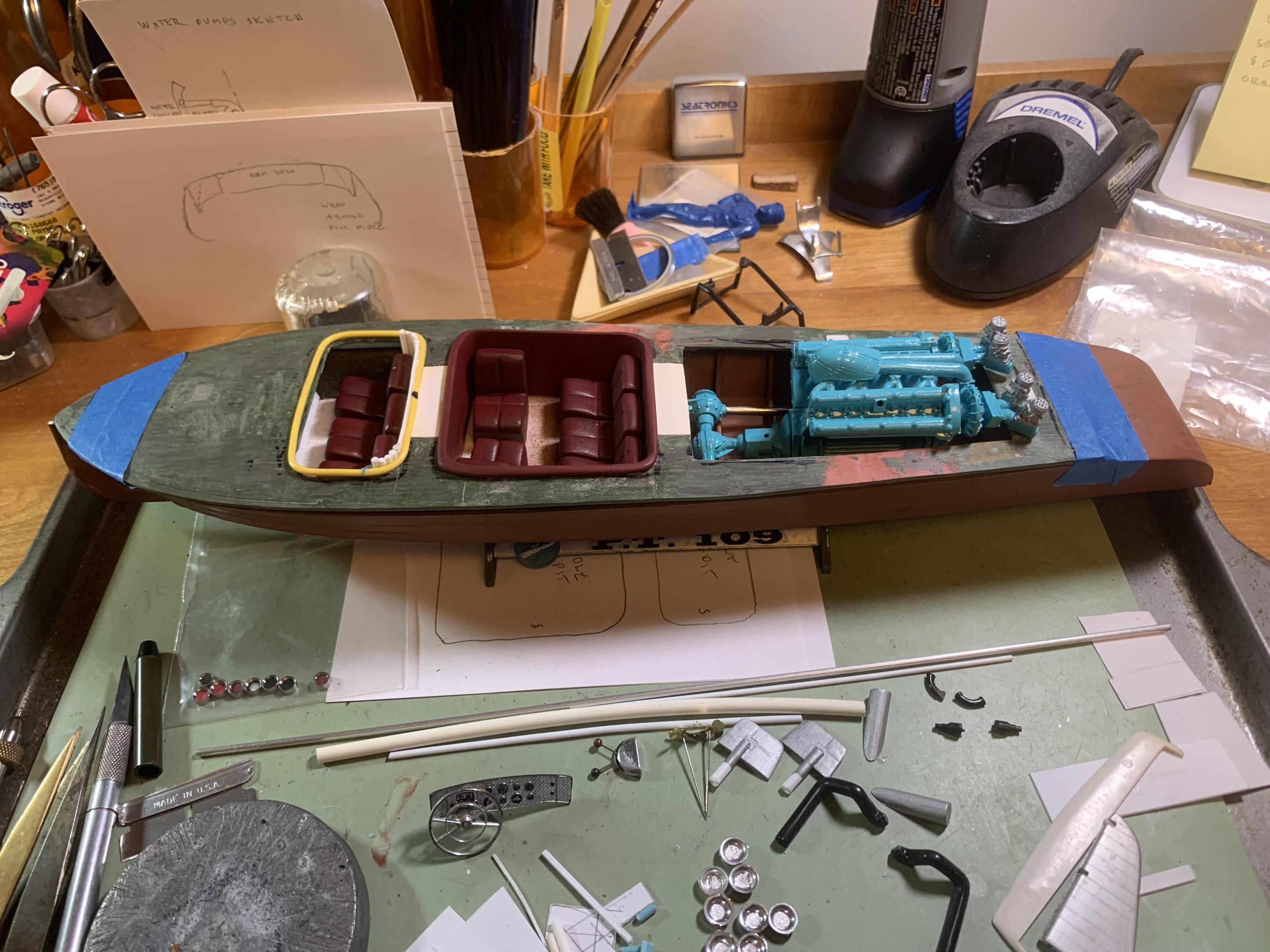 Well, we have been moving right along......... here are some mock up photos showing the seats and cockpit surrounds- the front one is made from heavy insulated wire superglued to the edge of the cockpit- this will be blended, sanded, and painted to match the center one-also the engine is coming along- got the induction system together and working on the water jacketed exhaust system and soon hope to glue the deck to the hull and start the planking...................................... more to come when I get it done. -