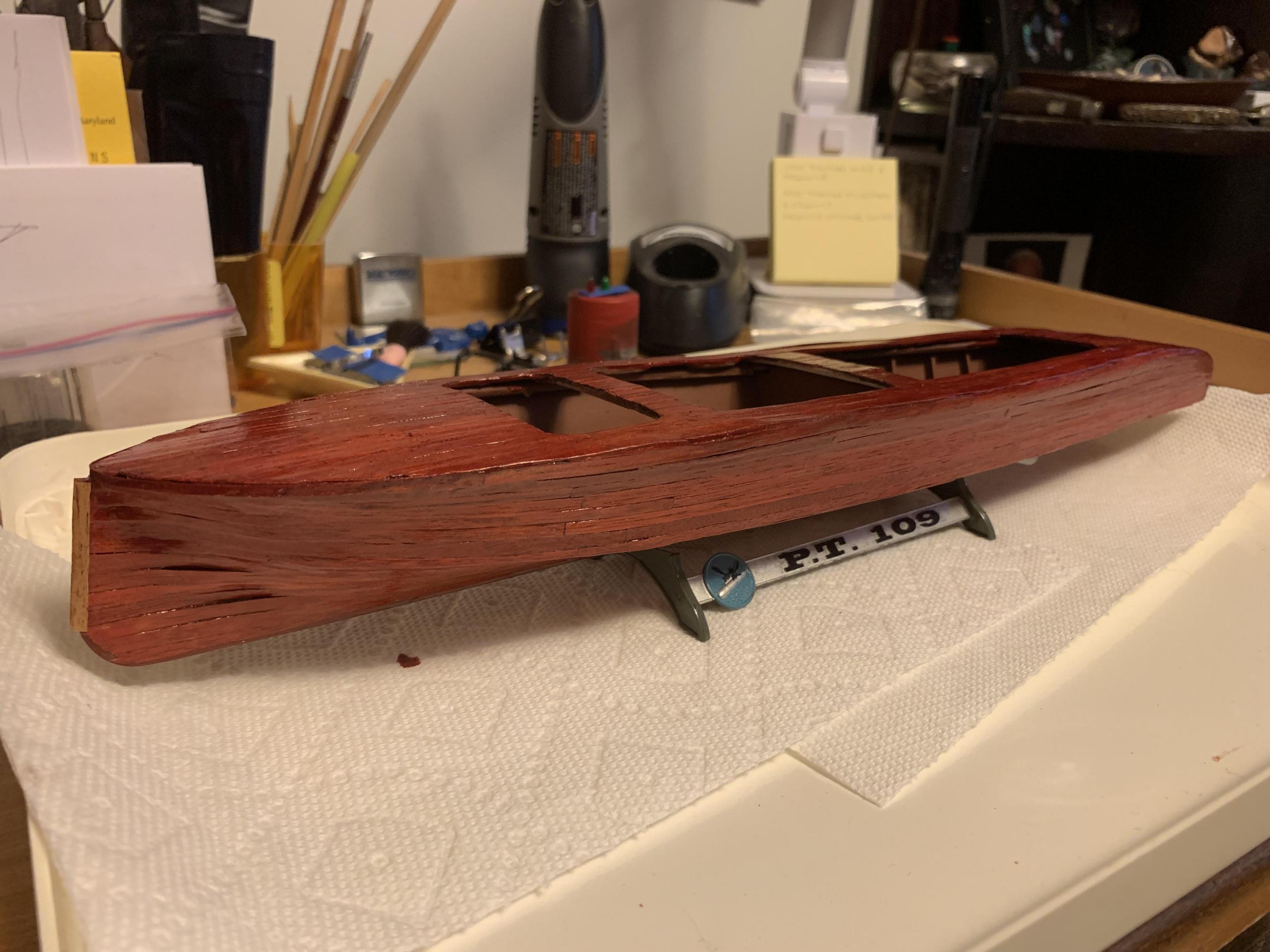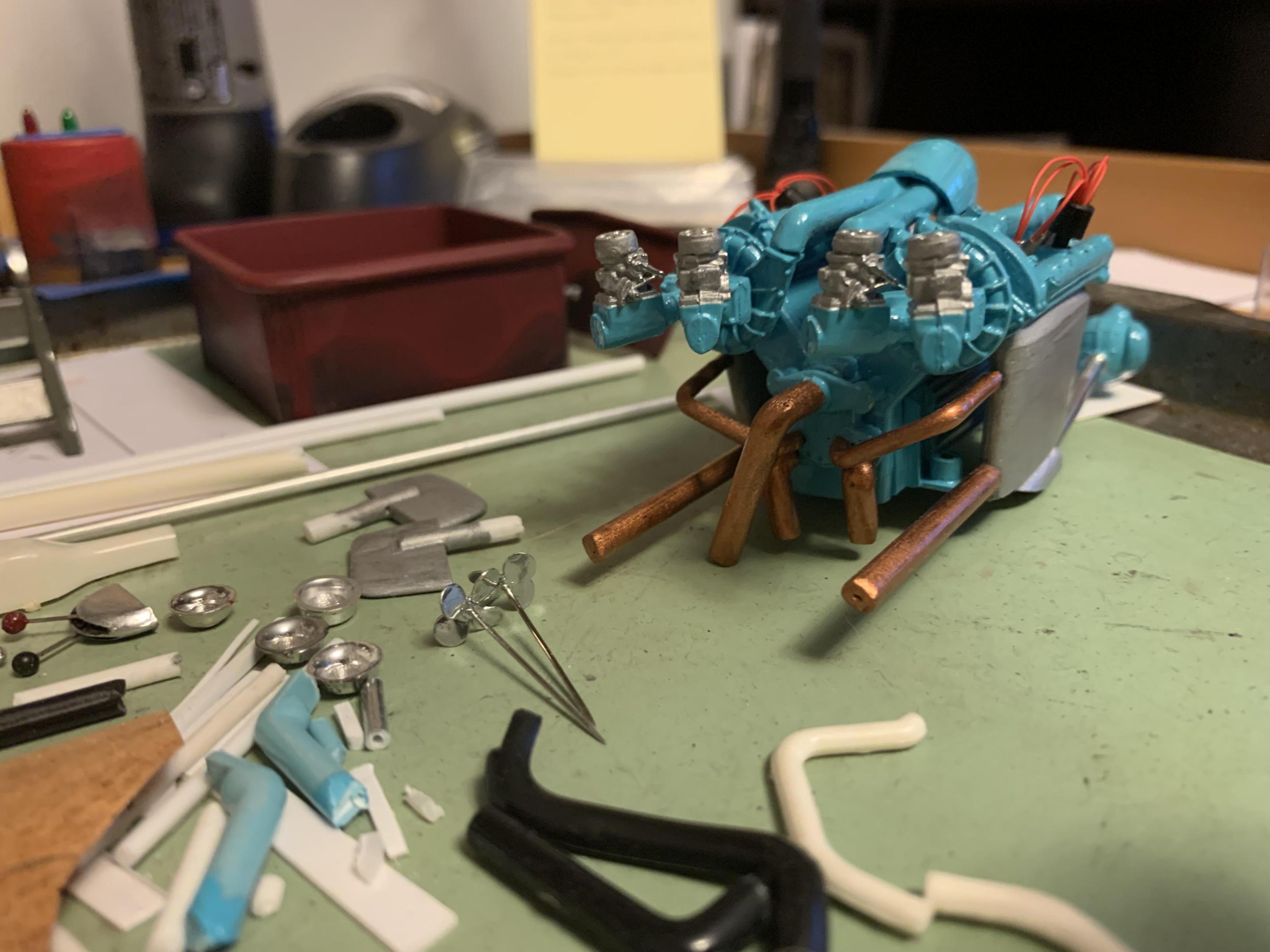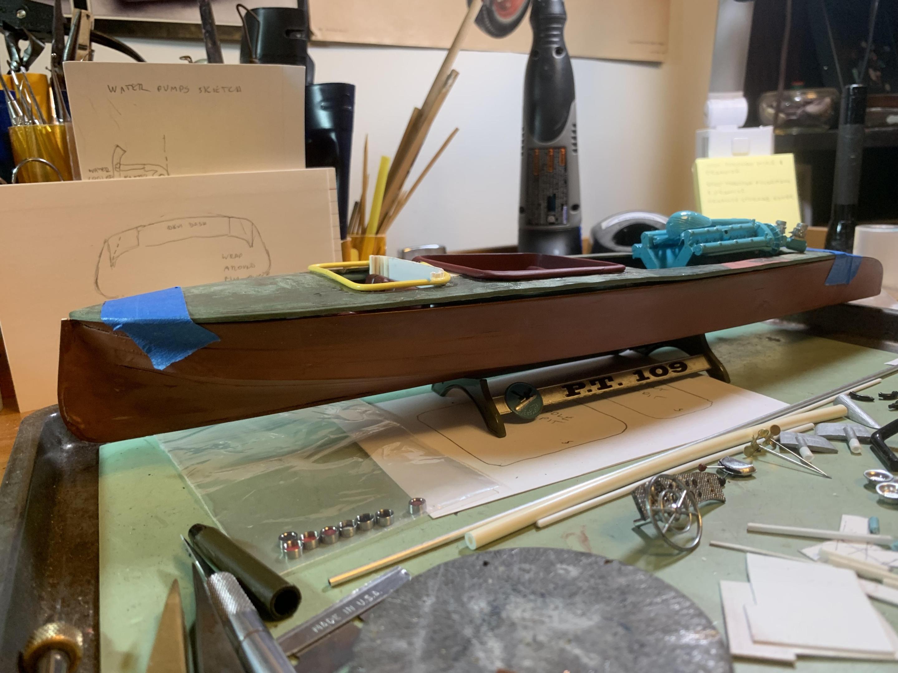 Got all the hull and deck planking done, also a coat of stain using Testors stop light red which is transparent. Have a little more work to do, stain that, let everything dry, then start spraying clear coat. Also included a pic of the cooling plumbing on the engine- just a little more to add. I have also started making the windscreen, which will have a center section, a section on either side, then two side pieces- then make another one for the second cockpit. Also designing a windscreen of sorts for the engine compartment- more when I get more done! -