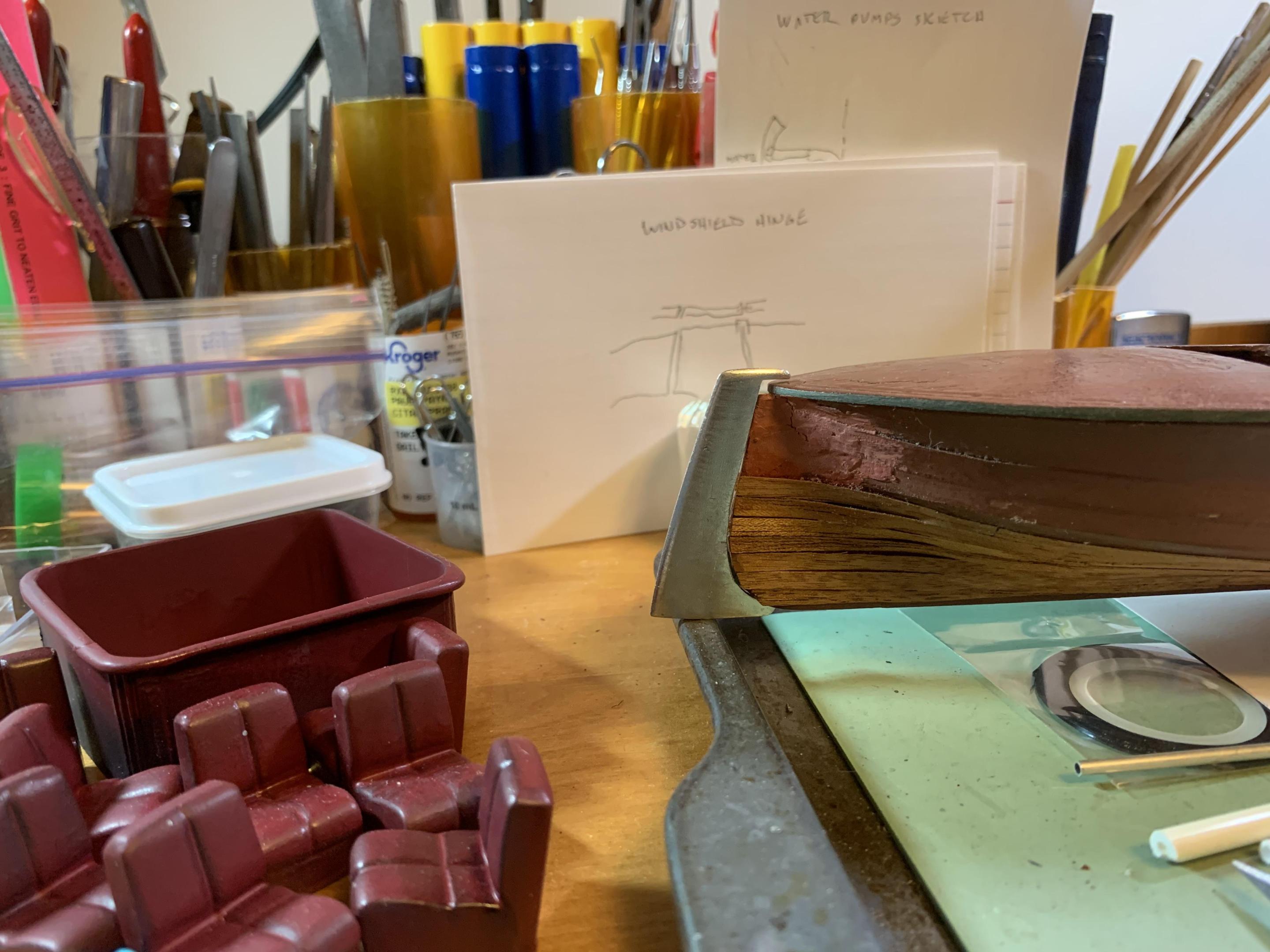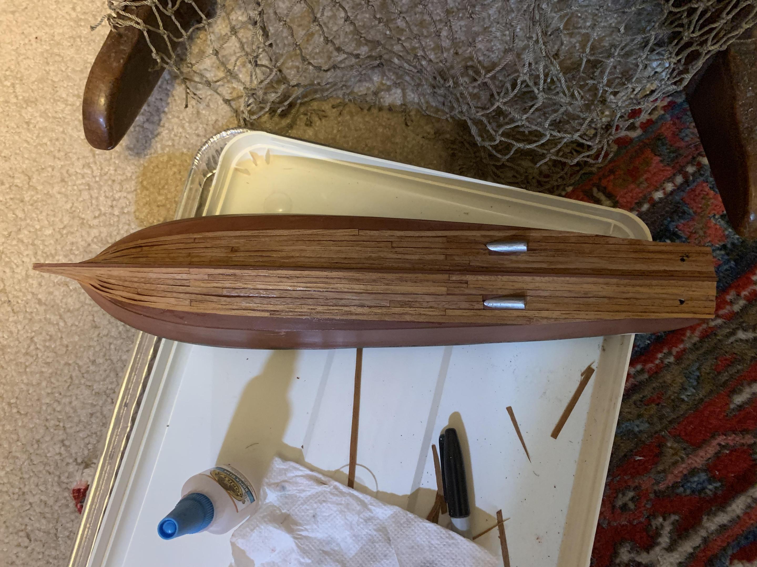 David, It will be a little tight- I will get some figures put together and try the fit. Thanks, Tim, I have been putting several hours a day in to git 'er done! Hope to have hull and deck planking done today and then start brushing on the clear sealer- after that I'm going to use Testors stop light red as a stain, then more clear, then more sanding-tested the stop light red on a clear coated scrap piece and the wood grain still shows through. -