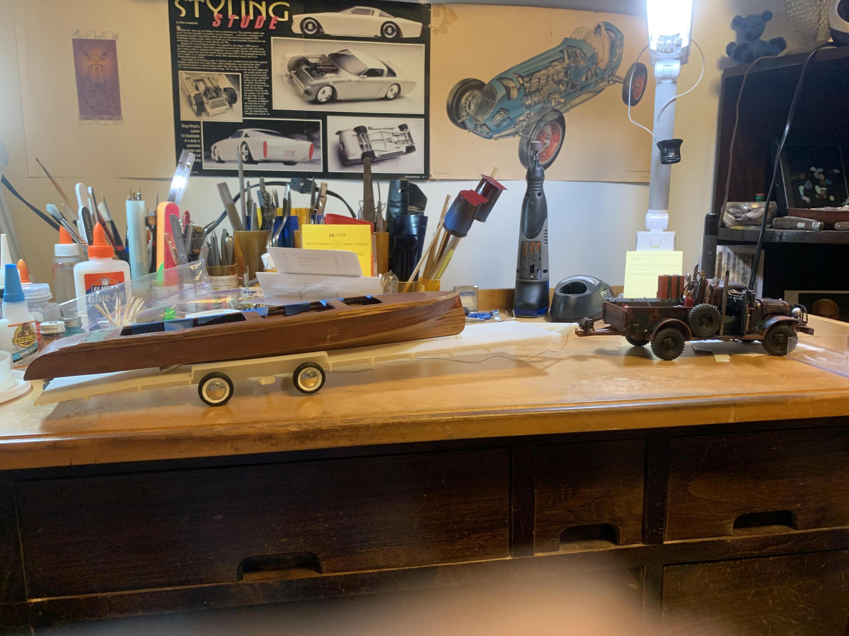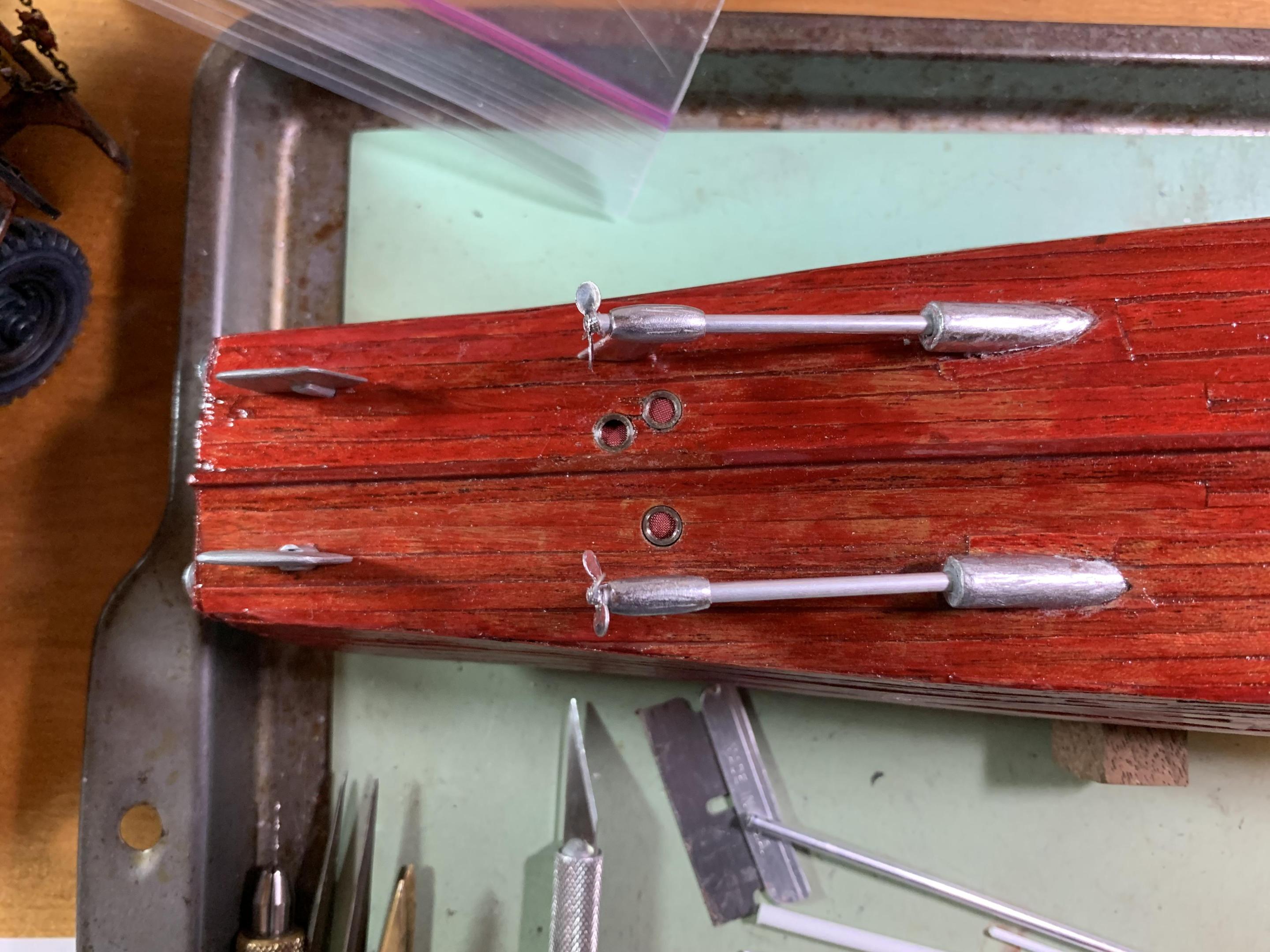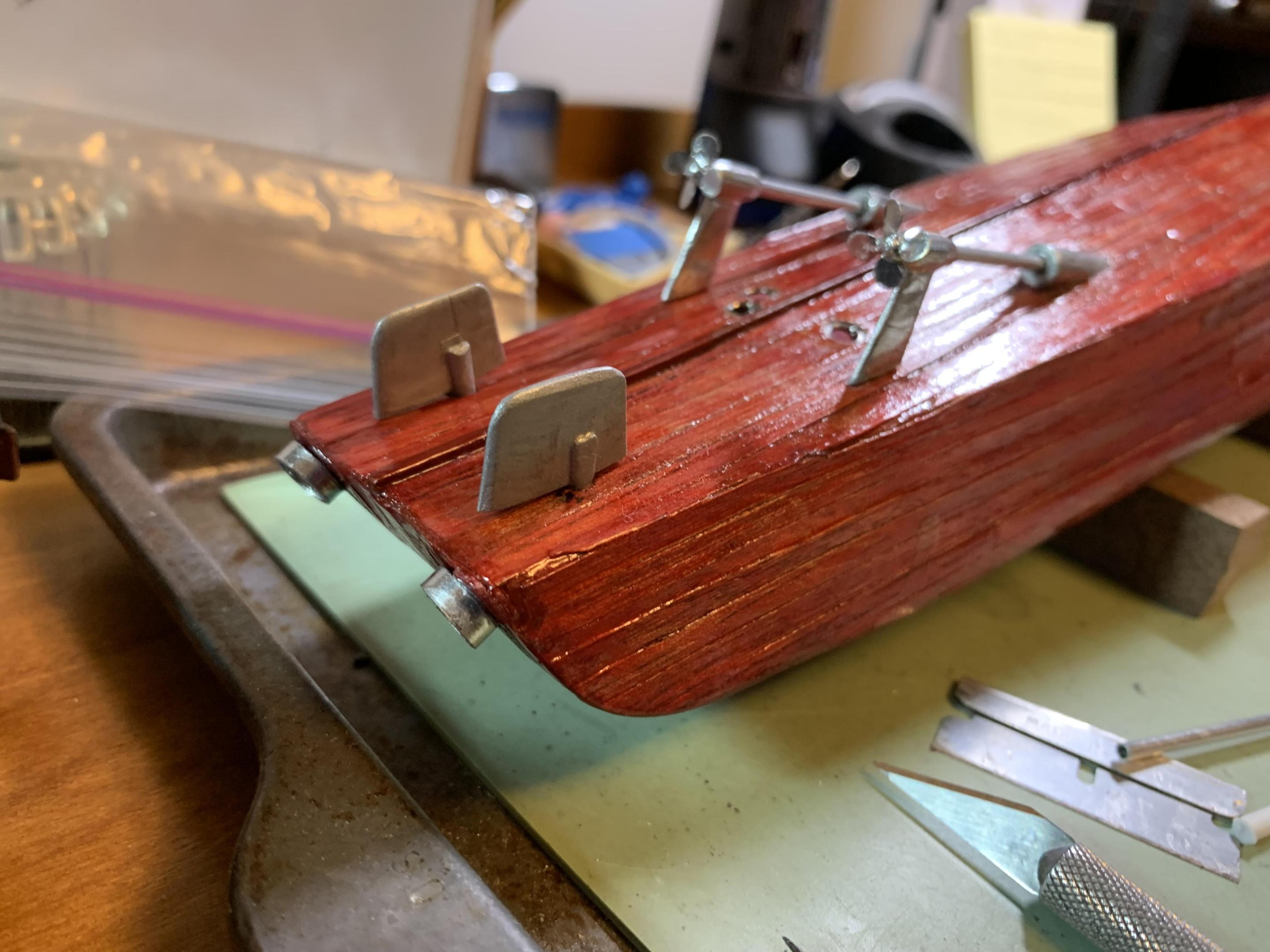 Progress! Got the external cooling water and engine exhaust ports, rudders, cooling water intake ports, and prop shafts and supports installed! Next big project is the dual windscreens and the engine wind diverter. Also making progress on the trailer- pix soon! -