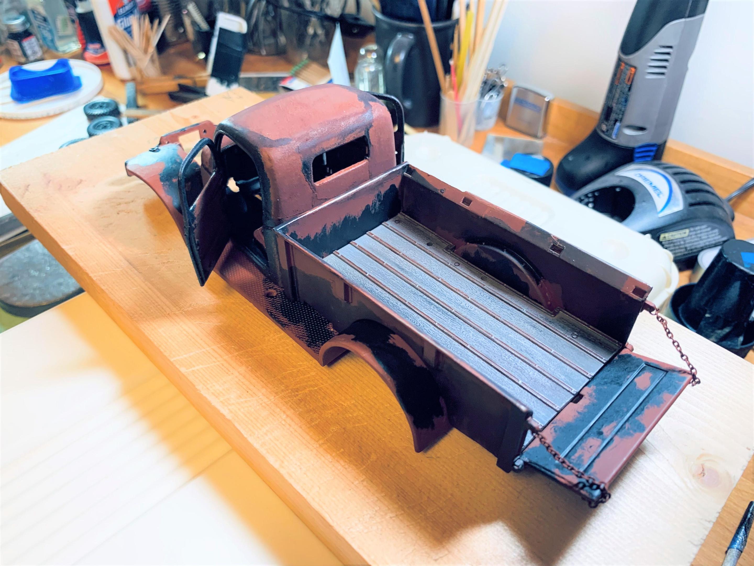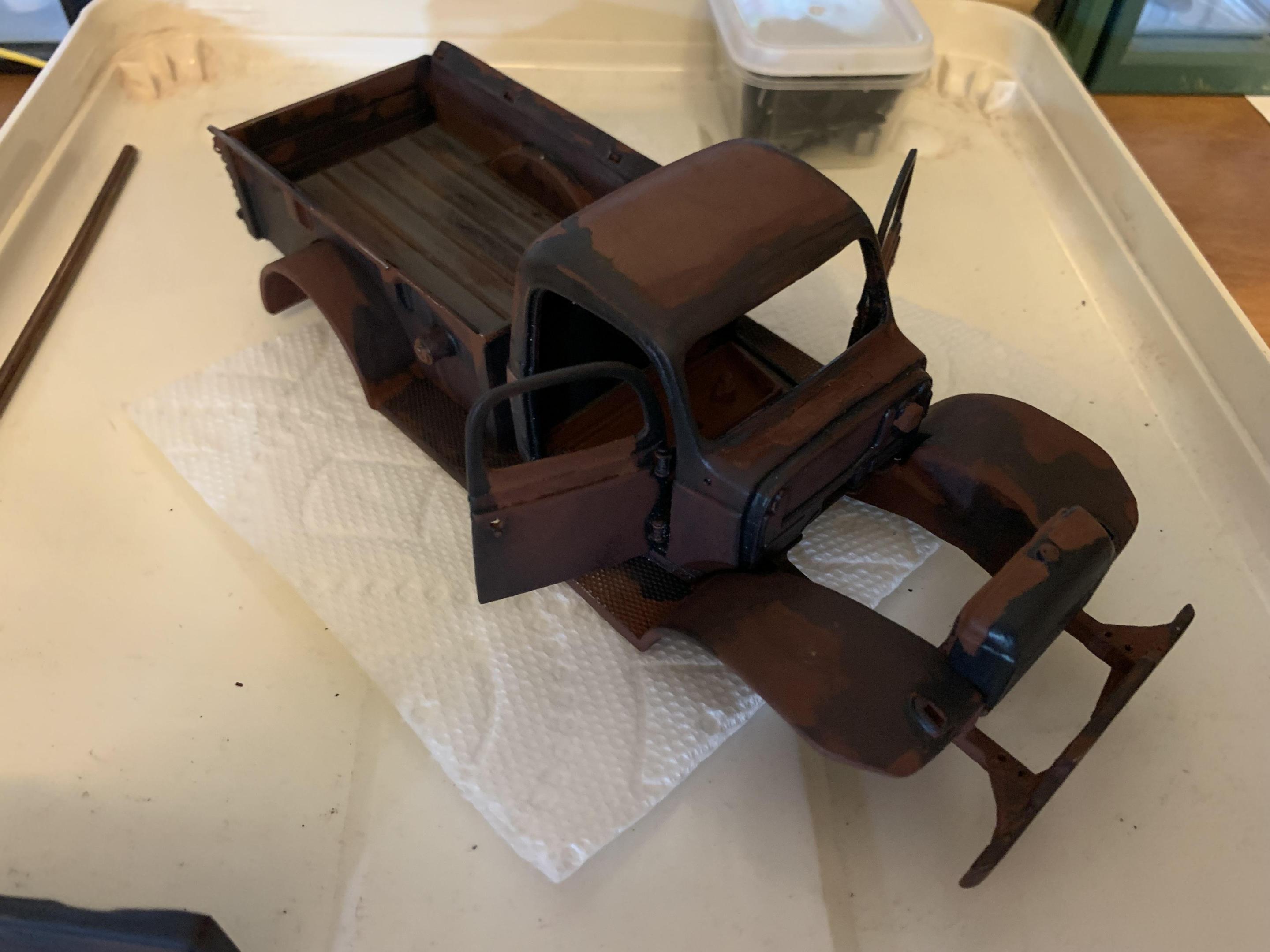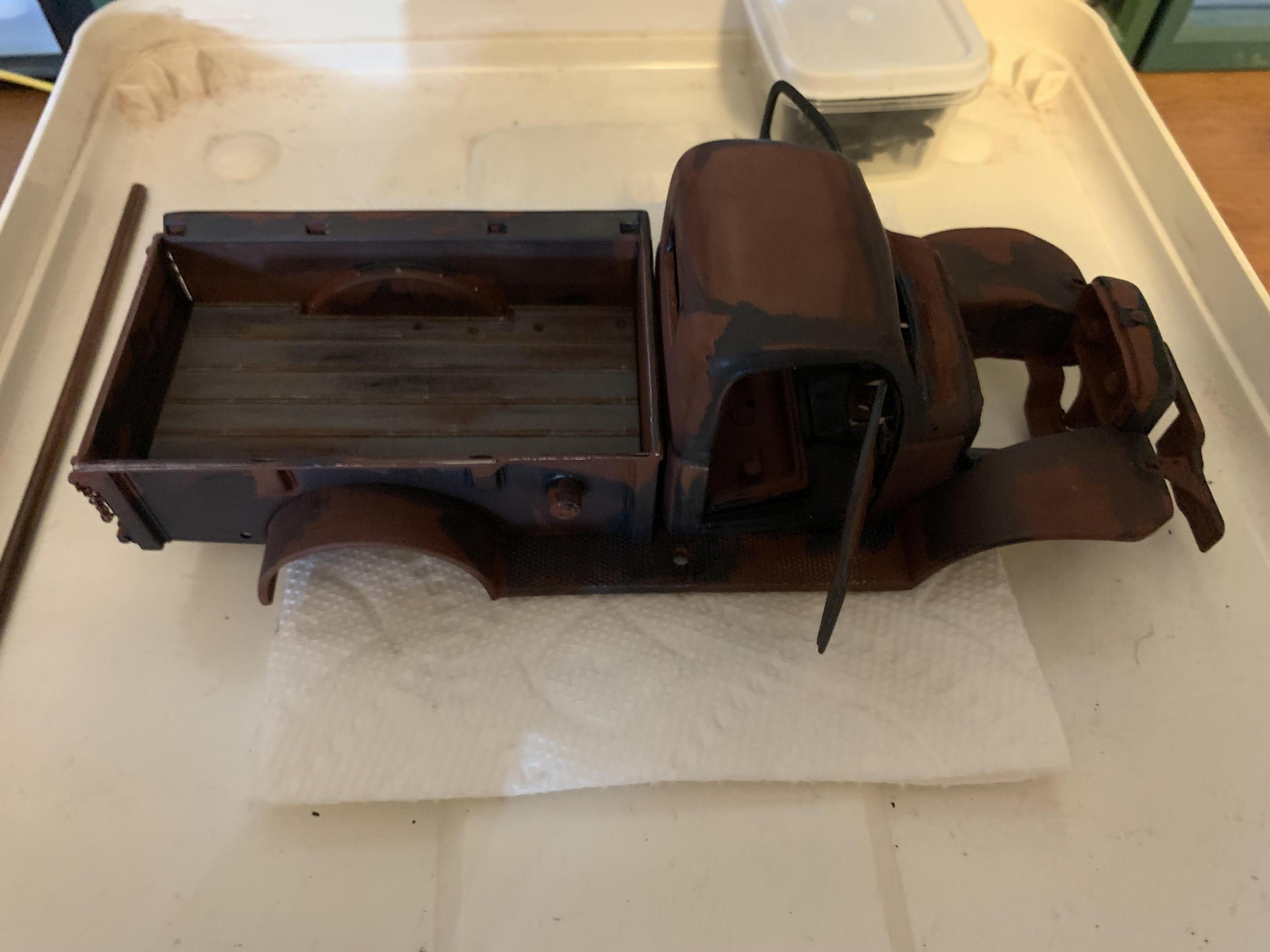 Although I am still finishing up another project, I decided to start weathering the Power Wagon. Initially I had decided on a lighter blue, but started to really like the darker blue of Testors gunmetal- this is a deep slatey blue somewhat like gun bluing. I had started by priming with red oxide primer (good old hot rod red), then masked off some areas with the torn edges of the masking tape defining the rust and paint line. Then I brushed on the blue and peeled off the tape. Eventually I just began to freehand the blue, with about the same result. I tried some sanding as well as leaving the blue alone. Then I started rubbing on some pastels right from the stick (an old set Betsy gave me). My skin oil helped the pastel to sink in, as well as the porosity of the paint. The bed was molded in black plastic with decent wood grain, so I painted it flat grey. I used some pastel and dry brushed steel and some wash from Testors rust and rubber mixed together. Lots more to do, but getting the feel of different things- tried brushing some powdered pastel with a brush on the engine but nothing much stuck. I will try a Q-tip rubbed on my nose for a little oil, then pick up the pastel powder and try it again. Please feel free to comment and make suggestions- this one is wide open as a grungy muscular old workhorse can be! -