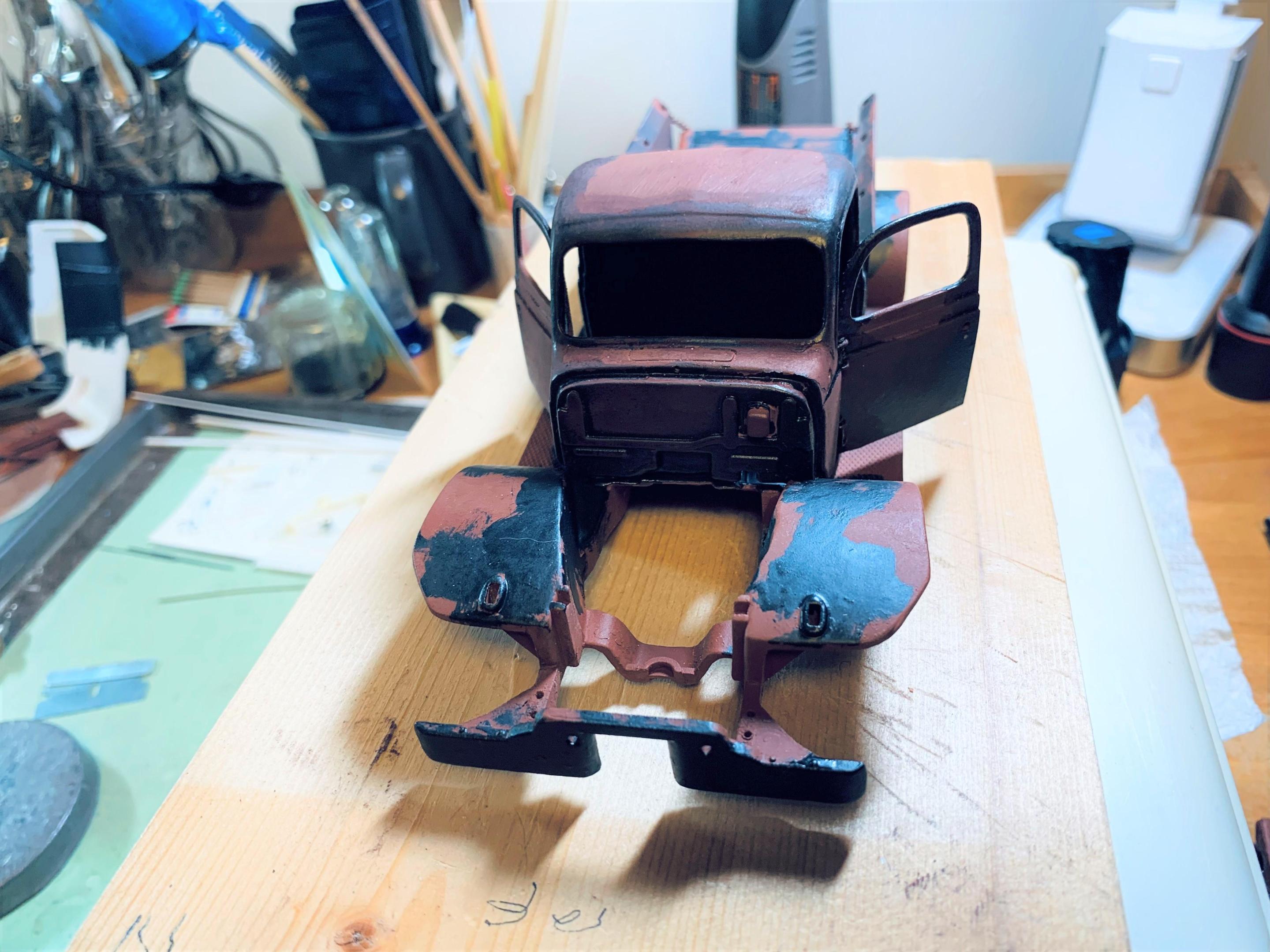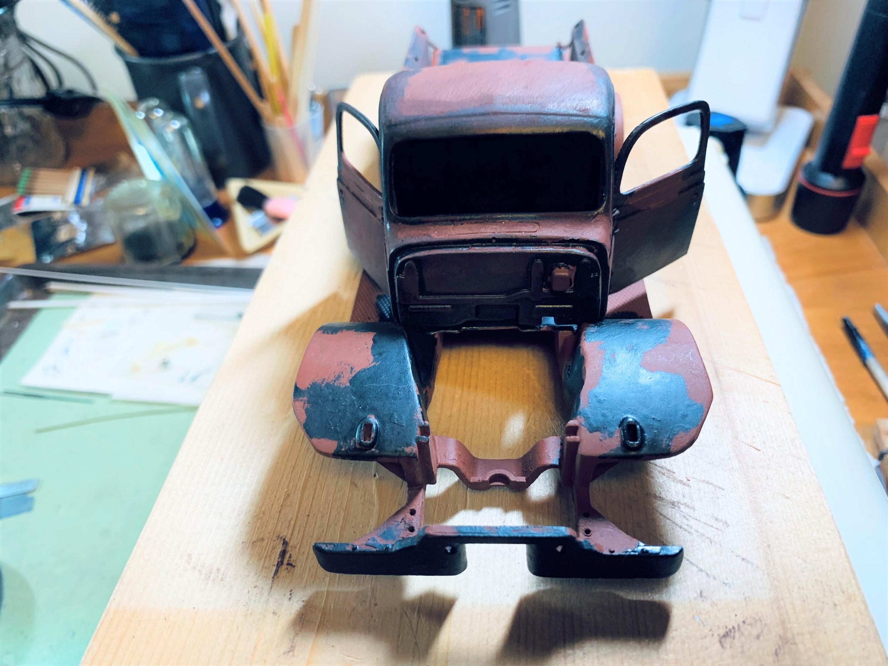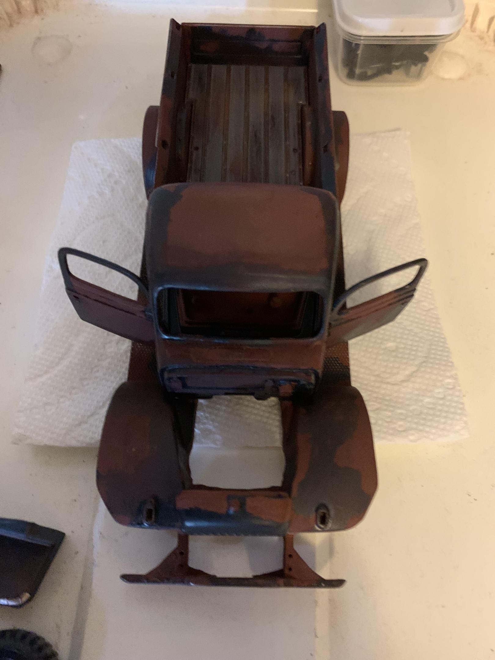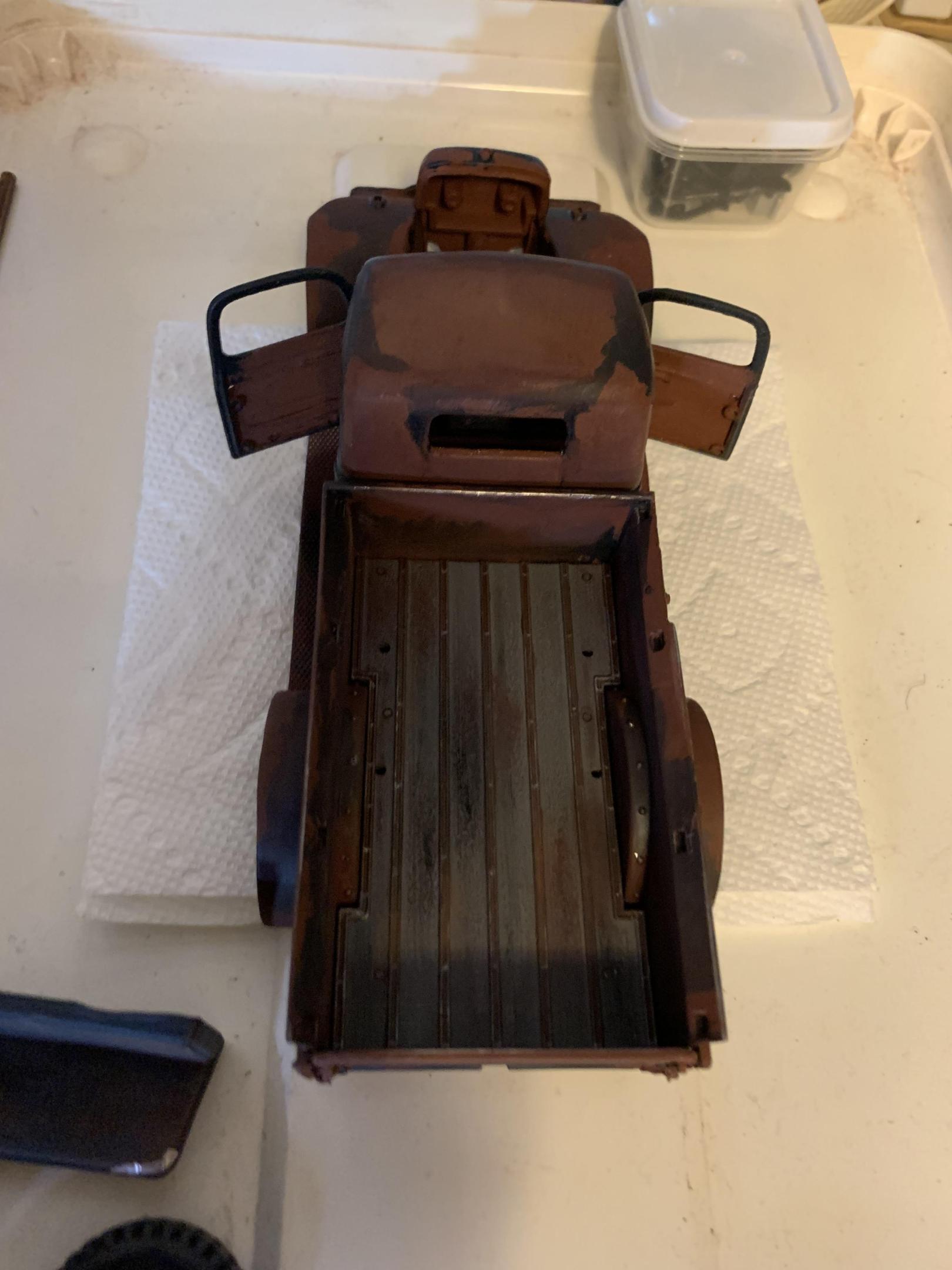 Although I am still finishing up another project, I decided to start weathering the Power Wagon. Initially I had decided on a lighter blue, but started to really like the darker blue of Testors gunmetal- this is a deep slatey blue somewhat like gun bluing. I had started by priming with red oxide primer (good old hot rod red), then masked off some areas with the torn edges of the masking tape defining the rust and paint line. Then I brushed on the blue and peeled off the tape. Eventually I just began to freehand the blue, with about the same result. I tried some sanding as well as leaving the blue alone. Then I started rubbing on some pastels right from the stick (an old set Betsy gave me). My skin oil helped the pastel to sink in, as well as the porosity of the paint. The bed was molded in black plastic with decent wood grain, so I painted it flat grey. I used some pastel and dry brushed steel and some wash from Testors rust and rubber mixed together. Lots more to do, but getting the feel of different things- tried brushing some powdered pastel with a brush on the engine but nothing much stuck. I will try a Q-tip rubbed on my nose for a little oil, then pick up the pastel powder and try it again. Please feel free to comment and make suggestions- this one is wide open as a grungy muscular old workhorse can be! -