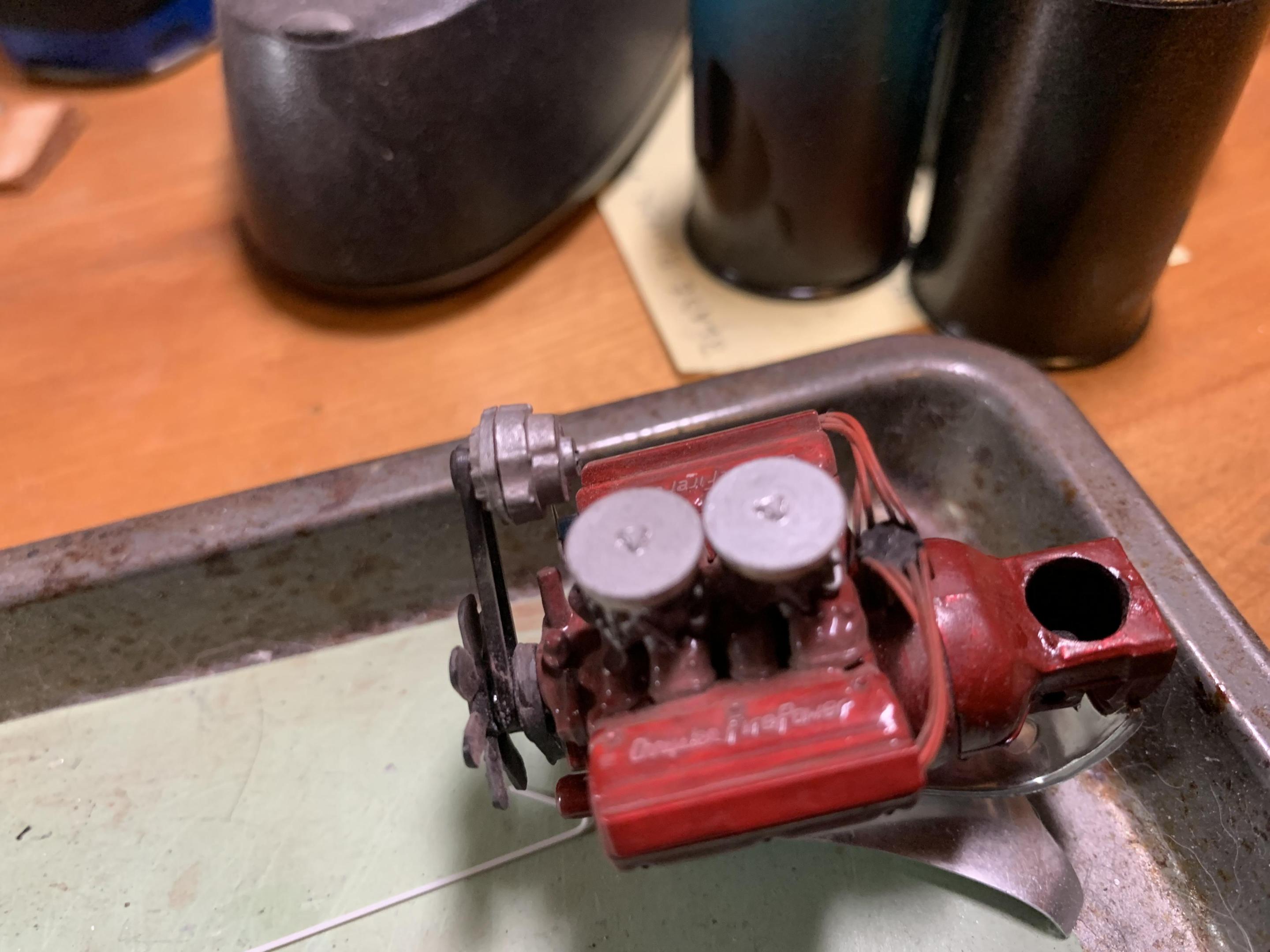 Got a lot of weathering done- still more to do, of course. Will need to grind more in the engine compartment to make the hemi fit, and also grind inside the grille to adjust the radiator fit (too close to the engine). Used white pastel to weather the tires and did more on the seat. Mostly done with pastel rubbed on the area then worked with my finger (best) or a q-tip (doesn't stick as well). -