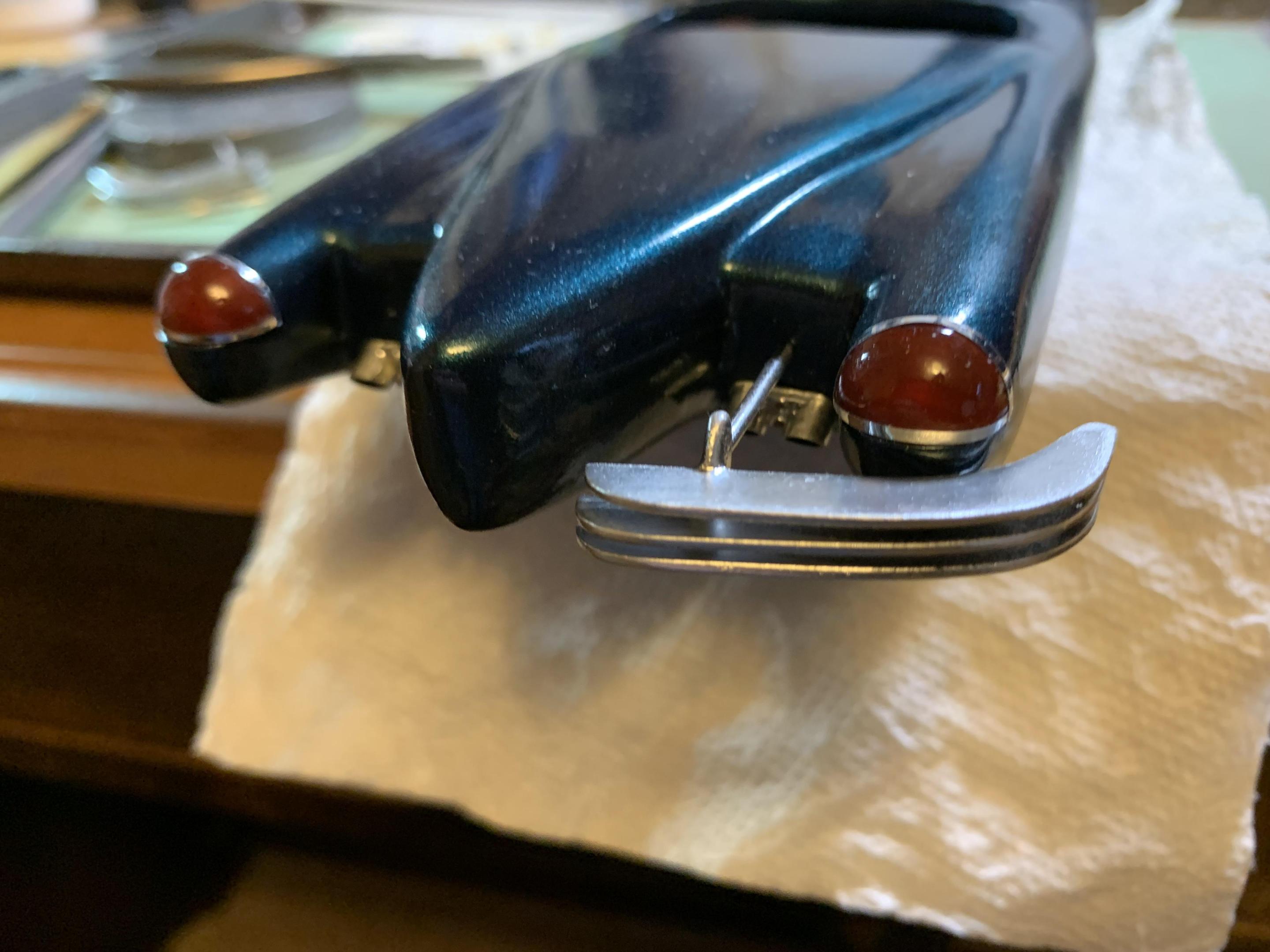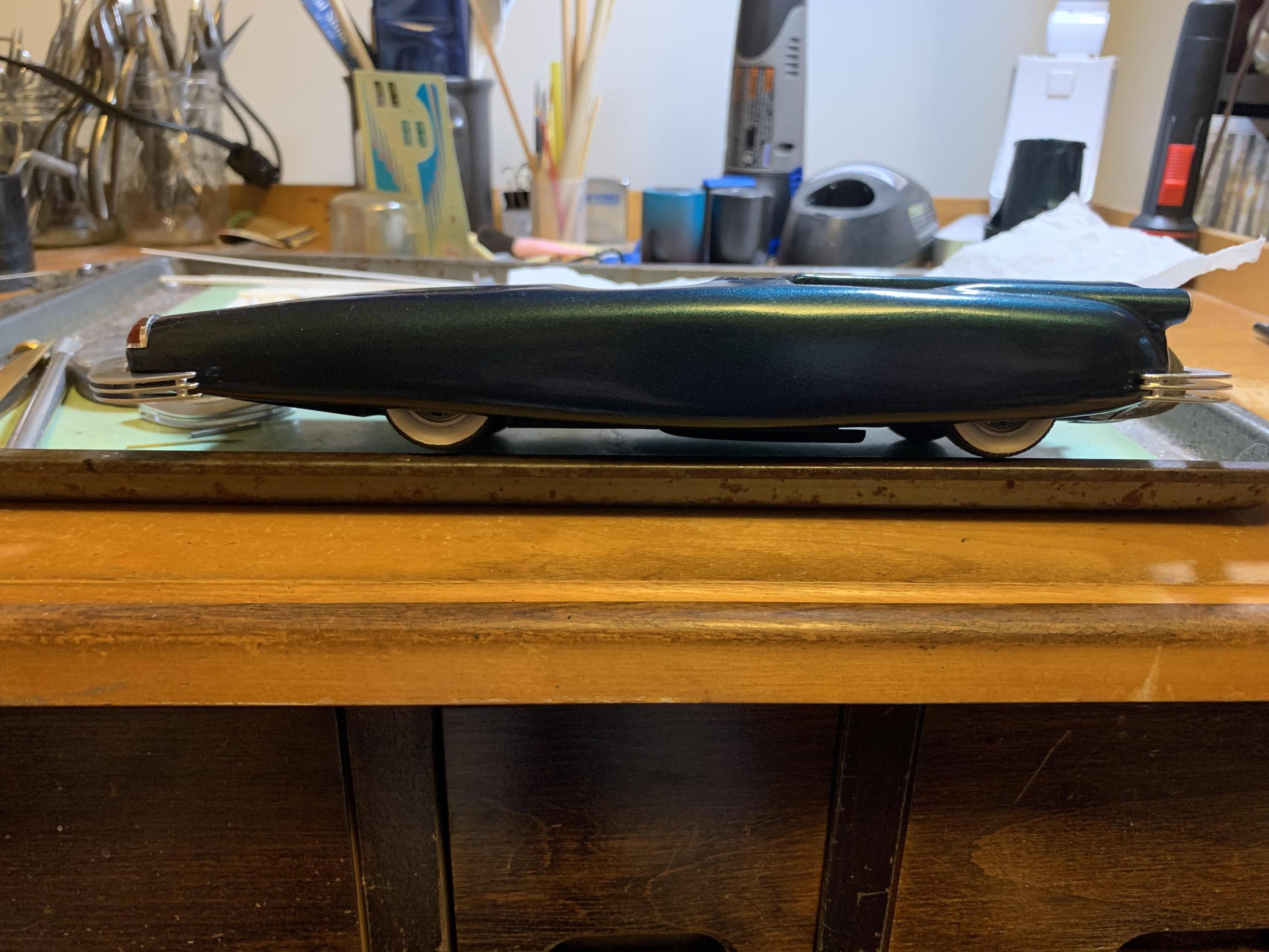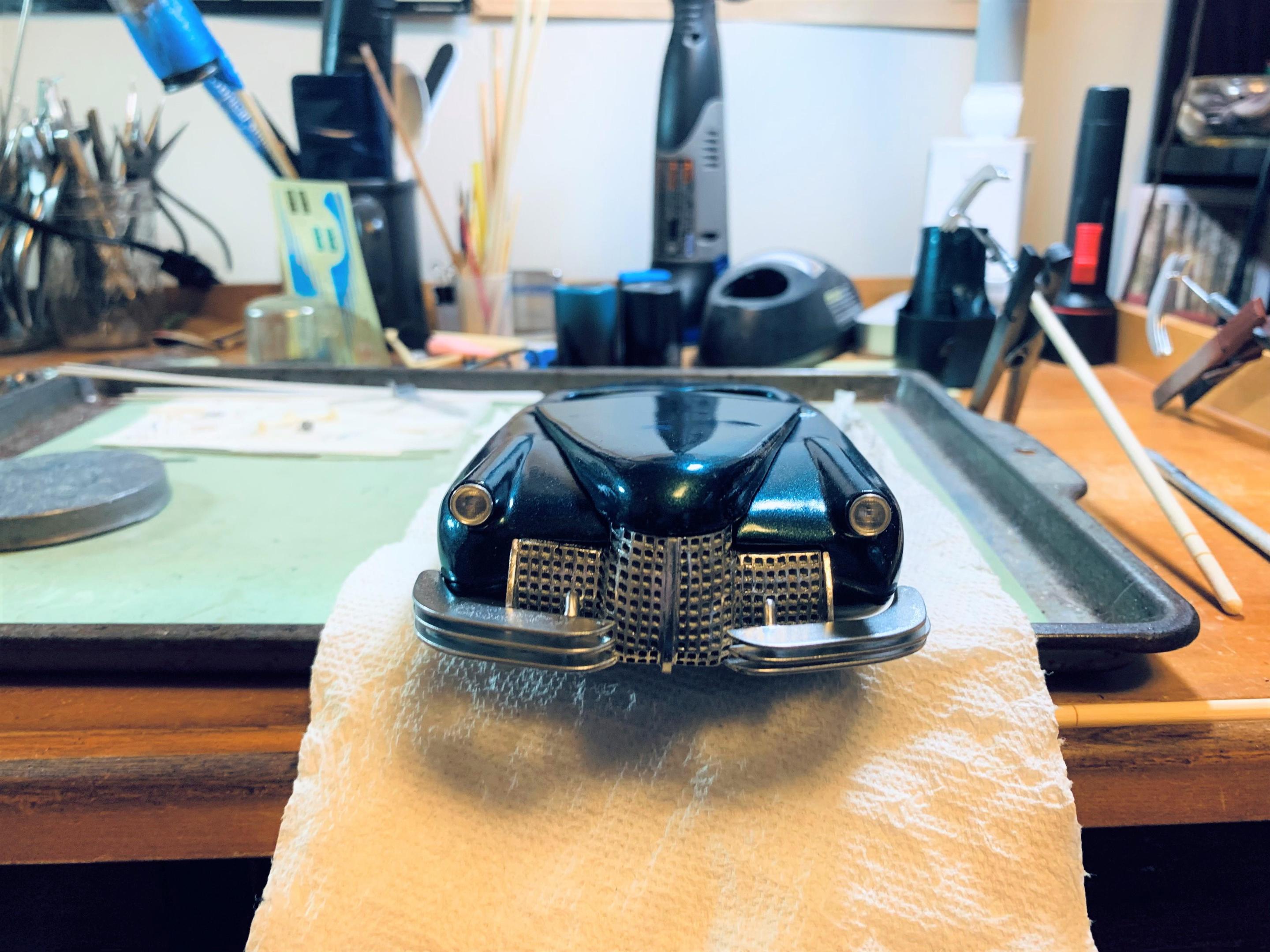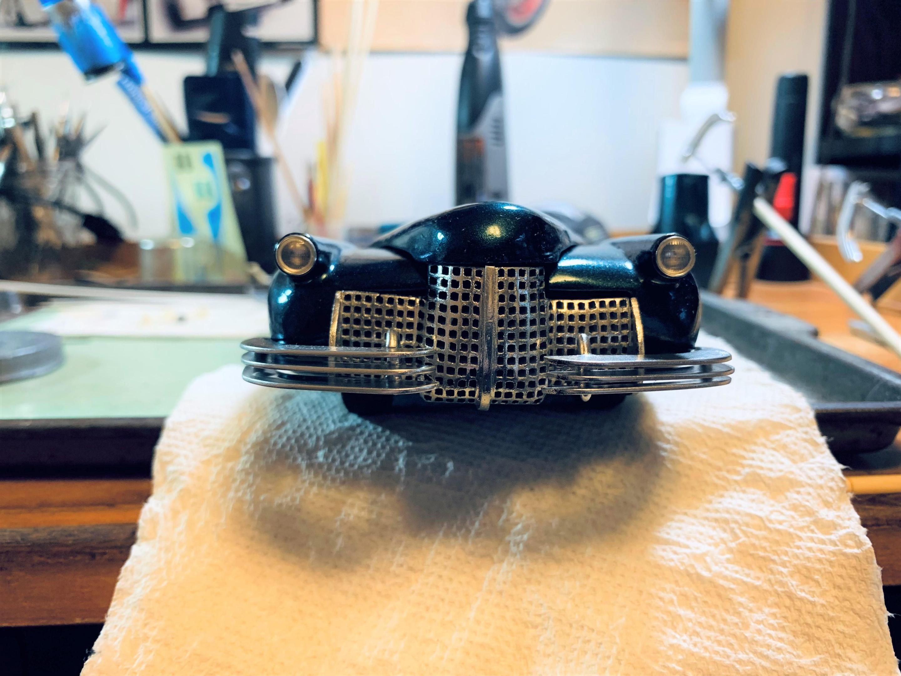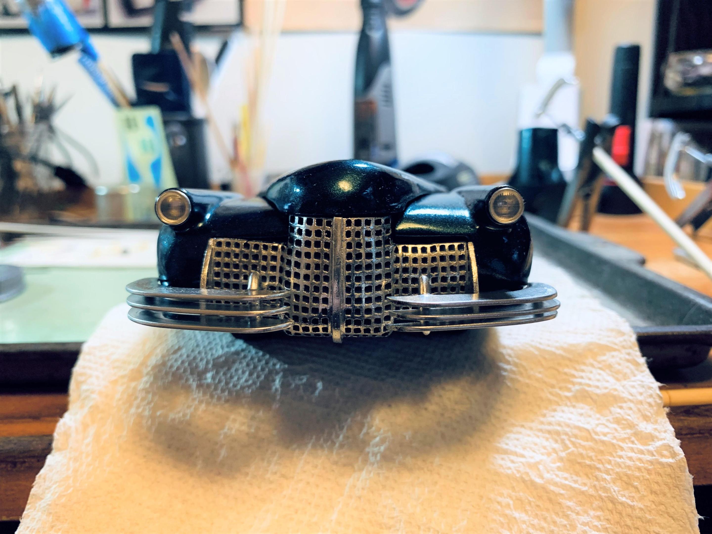 It's been awhile, but I'm still working on it. I finally got a decent coat of paint on the hood, with clear coat. The dashboard and steering wheel have been installed in the body- I test fitted the shifter just for jollies- the console is part of the dashboard and rests on the transmission hump and driveshaft tunnel. I had applied some Molotow to the grille, but a lot of sanding scratches appeared- I sanded everything again and have applied Molotow to one half. When it's dry, I will see if its smooth enough to continue. I filed down the outside of the headlight buckets creating a small lip, then filed a bit on the headlight openings so now I have a nice fit. A little chrome touch up and they will go in. The big project has been the 12 bumper blades- 3 each side, front and rear. I rough shaped 12 pieces, then tried gluing a stack using Elmer's white glue, in order to sand everything to the final contour. Unfortunately, the glue didn't hold, so parts of the stack would come apart. However, I was able to get to the point where I could soak everything apart and do the final shaping using the best piece as a guide. In my stash I located 2 bumper guards of unknown origin. These were white glued together and 3 horizontal notches were filed into them for the bumper blades, then holes were drilled for the brass rod which will be covered with aluminum tube and mounted to the body. I also want to check out finger nail decorating tape, which seems to be available in 0.5mm width, and maybe even narrower. I want to try this for some chrome accent strips as well as door and panel lines.