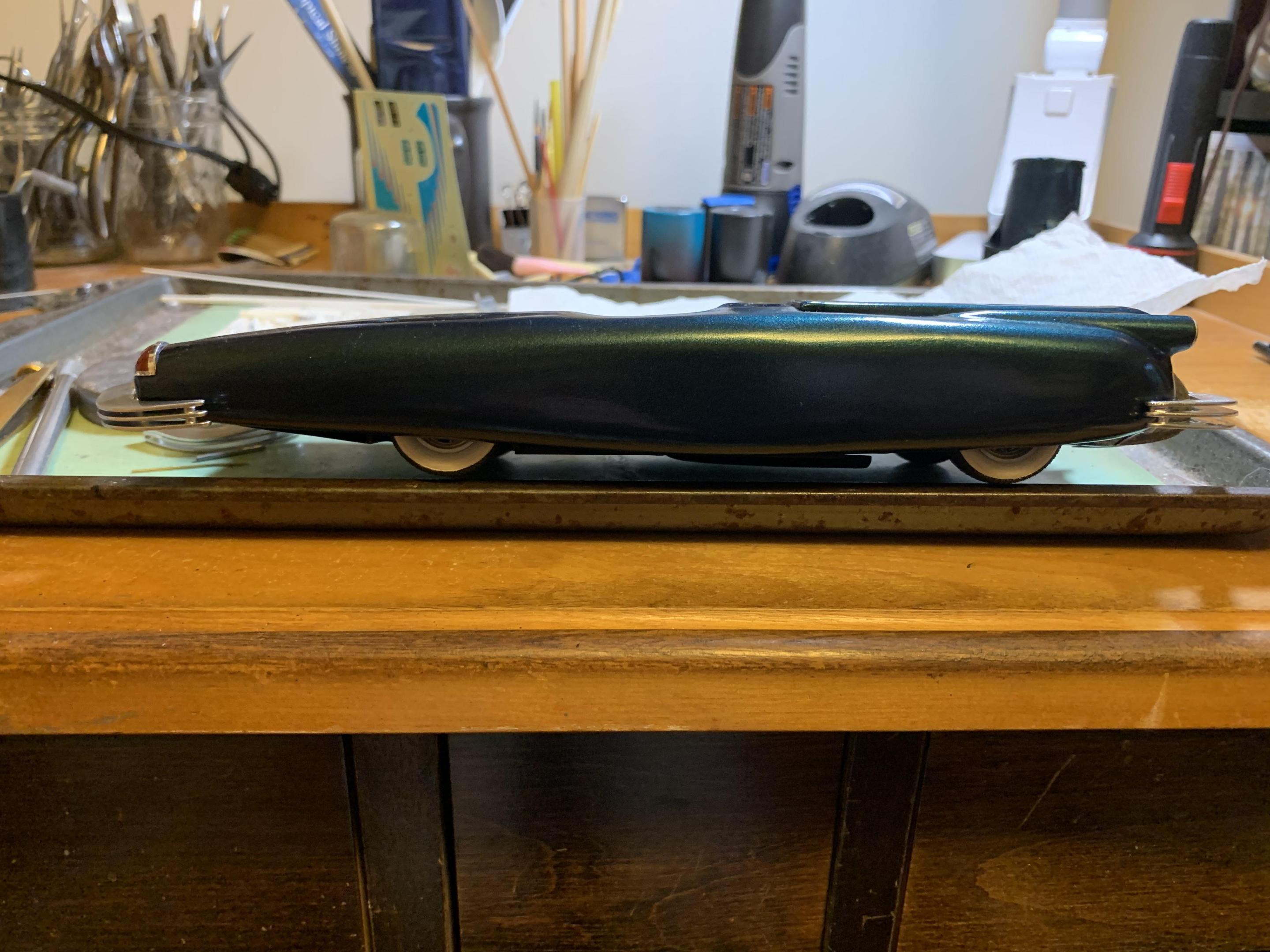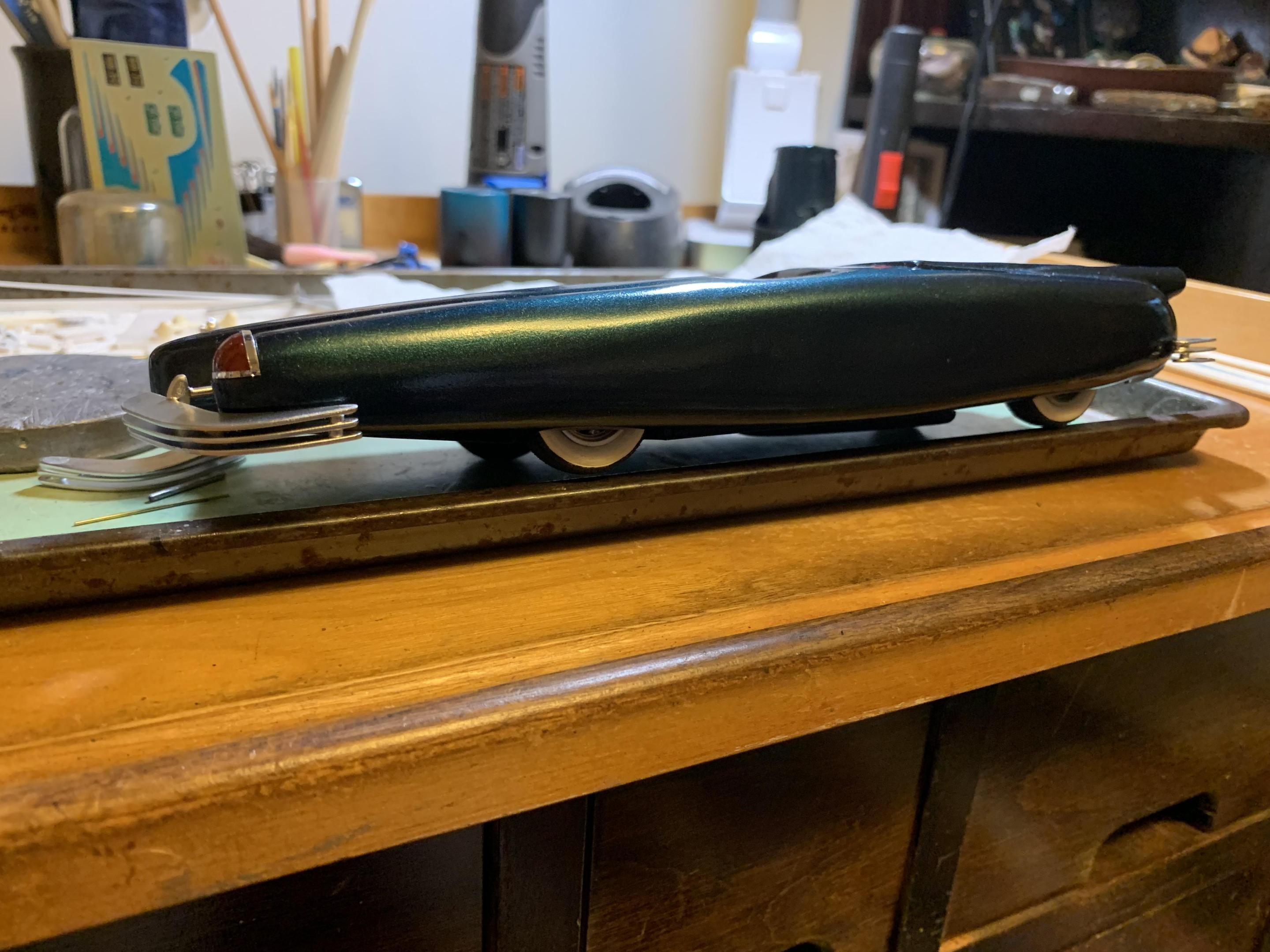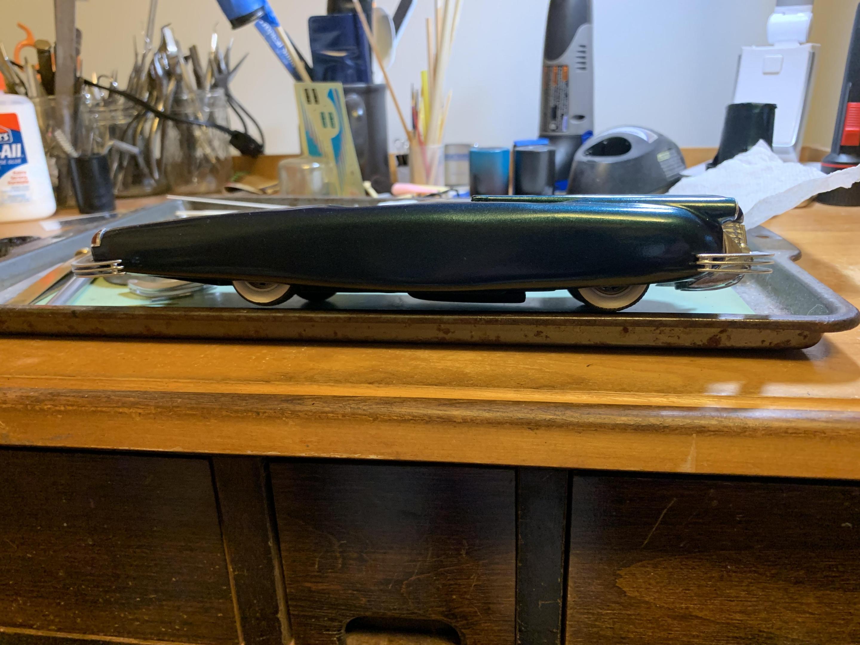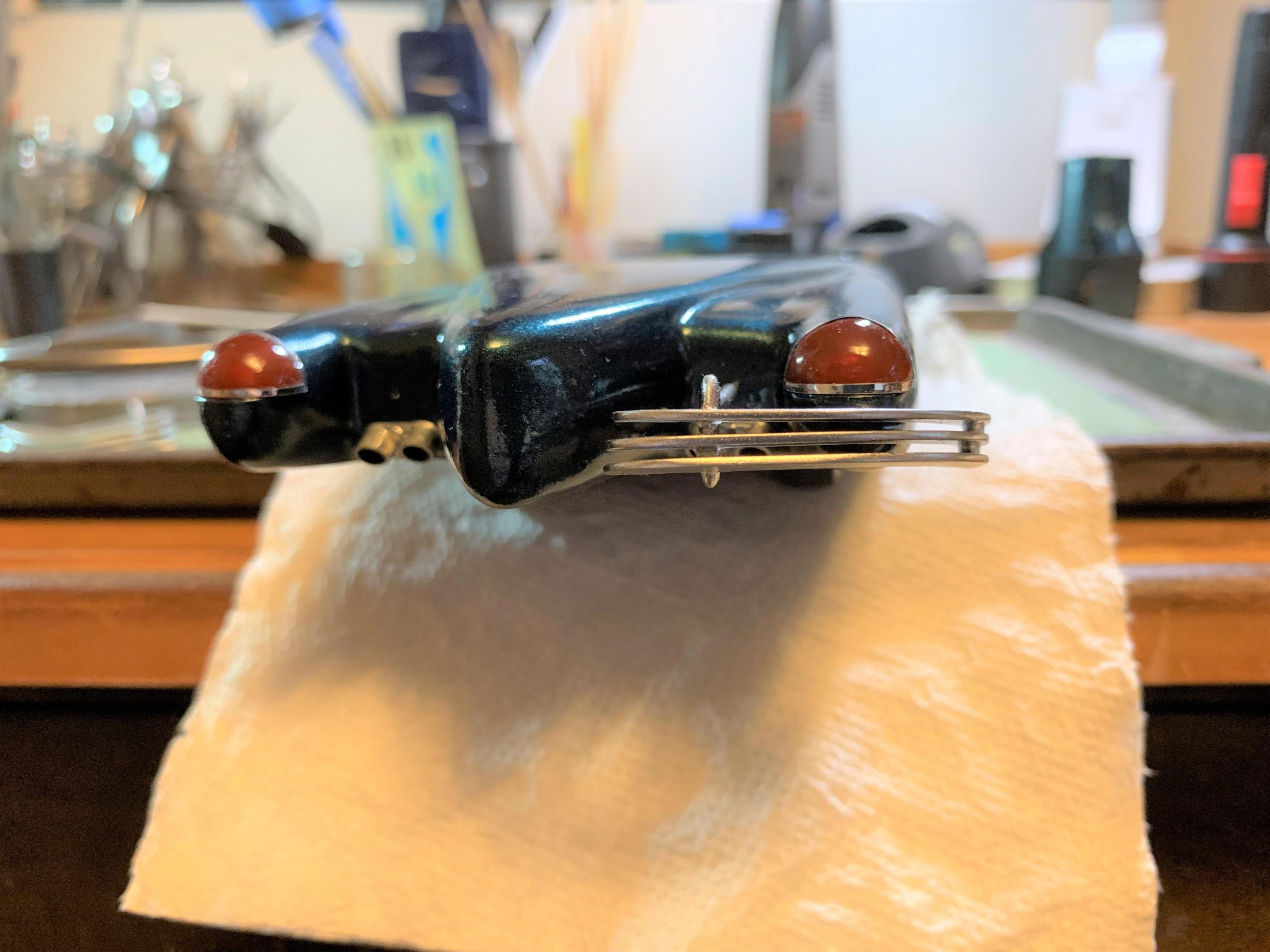 It's been awhile, but I'm still working on it. I finally got a decent coat of paint on the hood, with clear coat. The dashboard and steering wheel have been installed in the body- I test fitted the shifter just for jollies- the console is part of the dashboard and rests on the transmission hump and driveshaft tunnel. I had applied some Molotow to the grille, but a lot of sanding scratches appeared- I sanded everything again and have applied Molotow to one half. When it's dry, I will see if its smooth enough to continue. I filed down the outside of the headlight buckets creating a small lip, then filed a bit on the headlight openings so now I have a nice fit. A little chrome touch up and they will go in. The big project has been the 12 bumper blades- 3 each side, front and rear. I rough shaped 12 pieces, then tried gluing a stack using Elmer's white glue, in order to sand everything to the final contour. Unfortunately, the glue didn't hold, so parts of the stack would come apart. However, I was able to get to the point where I could soak everything apart and do the final shaping using the best piece as a guide. In my stash I located 2 bumper guards of unknown origin. These were white glued together and 3 horizontal notches were filed into them for the bumper blades, then holes were drilled for the brass rod which will be covered with aluminum tube and mounted to the body. I also want to check out finger nail decorating tape, which seems to be available in 0.5mm width, and maybe even narrower. I want to try this for some chrome accent strips as well as door and panel lines.