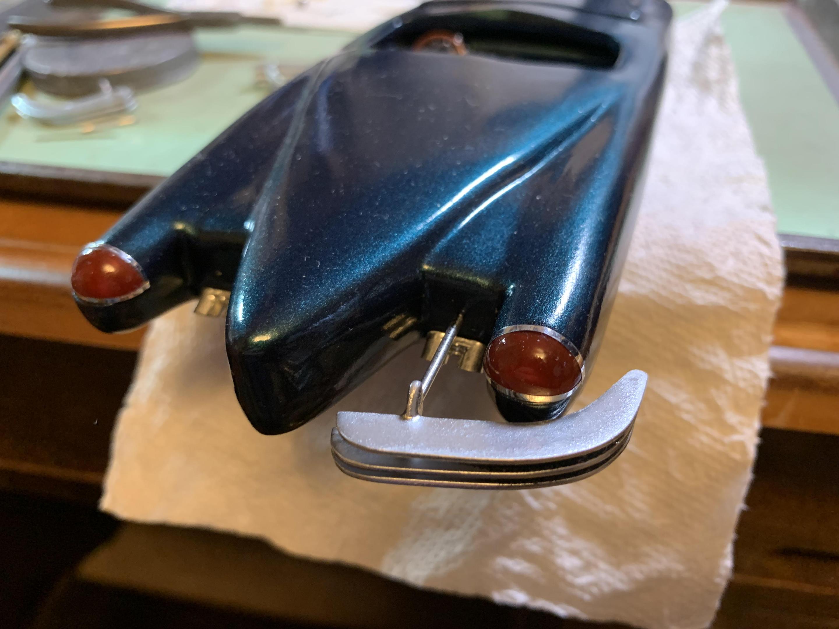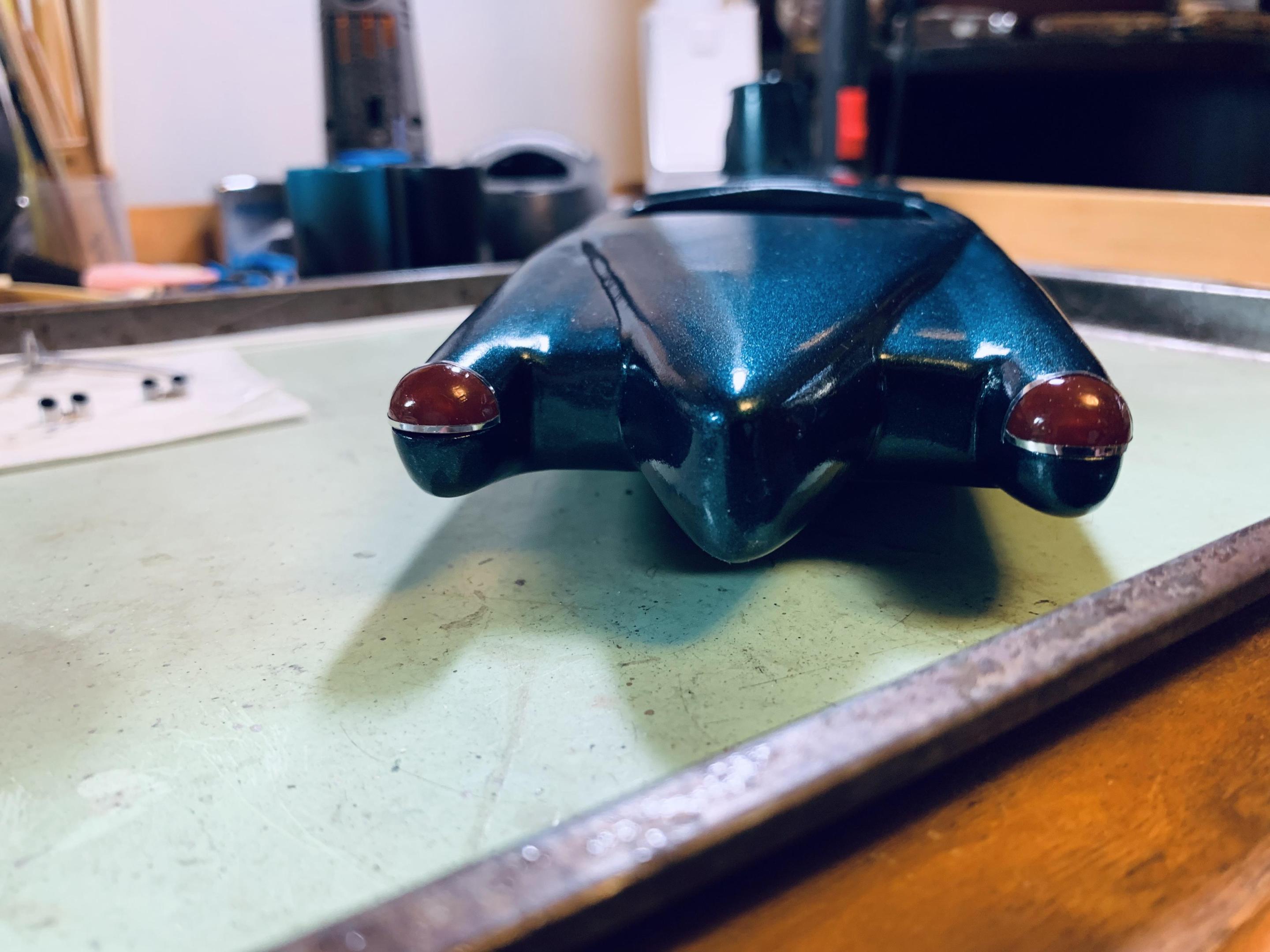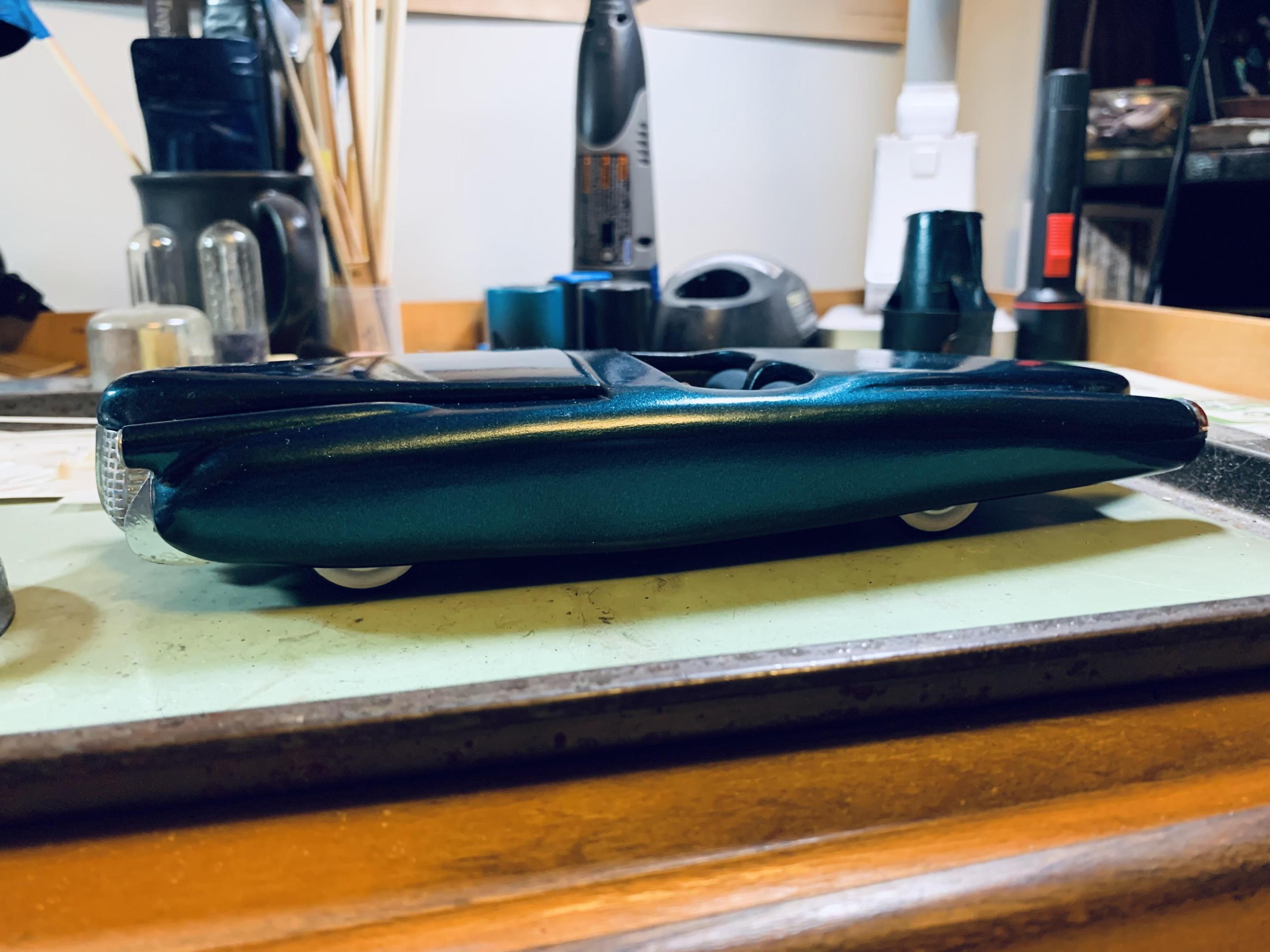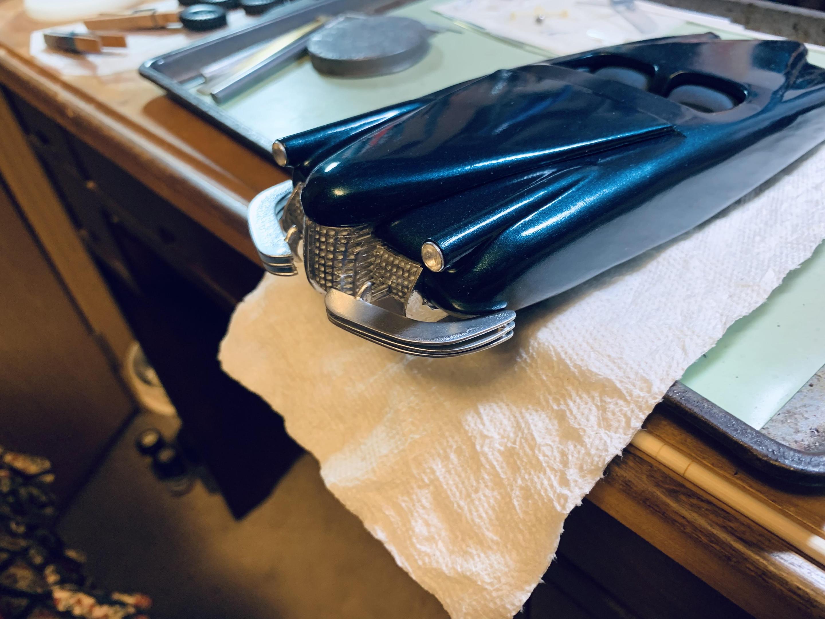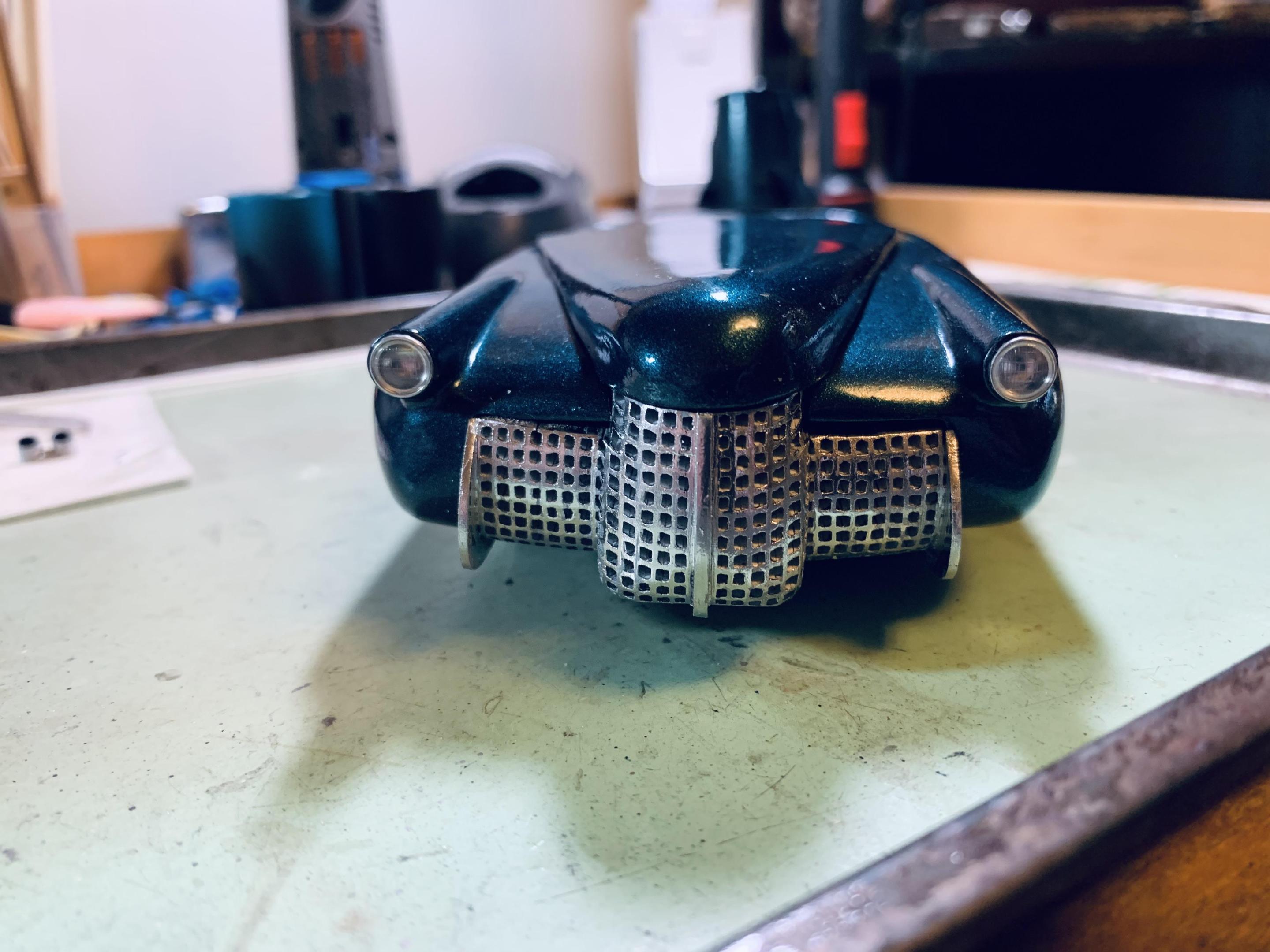 It's been awhile, but I'm still working on it. I finally got a decent coat of paint on the hood, with clear coat. The dashboard and steering wheel have been installed in the body- I test fitted the shifter just for jollies- the console is part of the dashboard and rests on the transmission hump and driveshaft tunnel. I had applied some Molotow to the grille, but a lot of sanding scratches appeared- I sanded everything again and have applied Molotow to one half. When it's dry, I will see if its smooth enough to continue. I filed down the outside of the headlight buckets creating a small lip, then filed a bit on the headlight openings so now I have a nice fit. A little chrome touch up and they will go in. The big project has been the 12 bumper blades- 3 each side, front and rear. I rough shaped 12 pieces, then tried gluing a stack using Elmer's white glue, in order to sand everything to the final contour. Unfortunately, the glue didn't hold, so parts of the stack would come apart. However, I was able to get to the point where I could soak everything apart and do the final shaping using the best piece as a guide. In my stash I located 2 bumper guards of unknown origin. These were white glued together and 3 horizontal notches were filed into them for the bumper blades, then holes were drilled for the brass rod which will be covered with aluminum tube and mounted to the body. I also want to check out finger nail decorating tape, which seems to be available in 0.5mm width, and maybe even narrower. I want to try this for some chrome accent strips as well as door and panel lines.