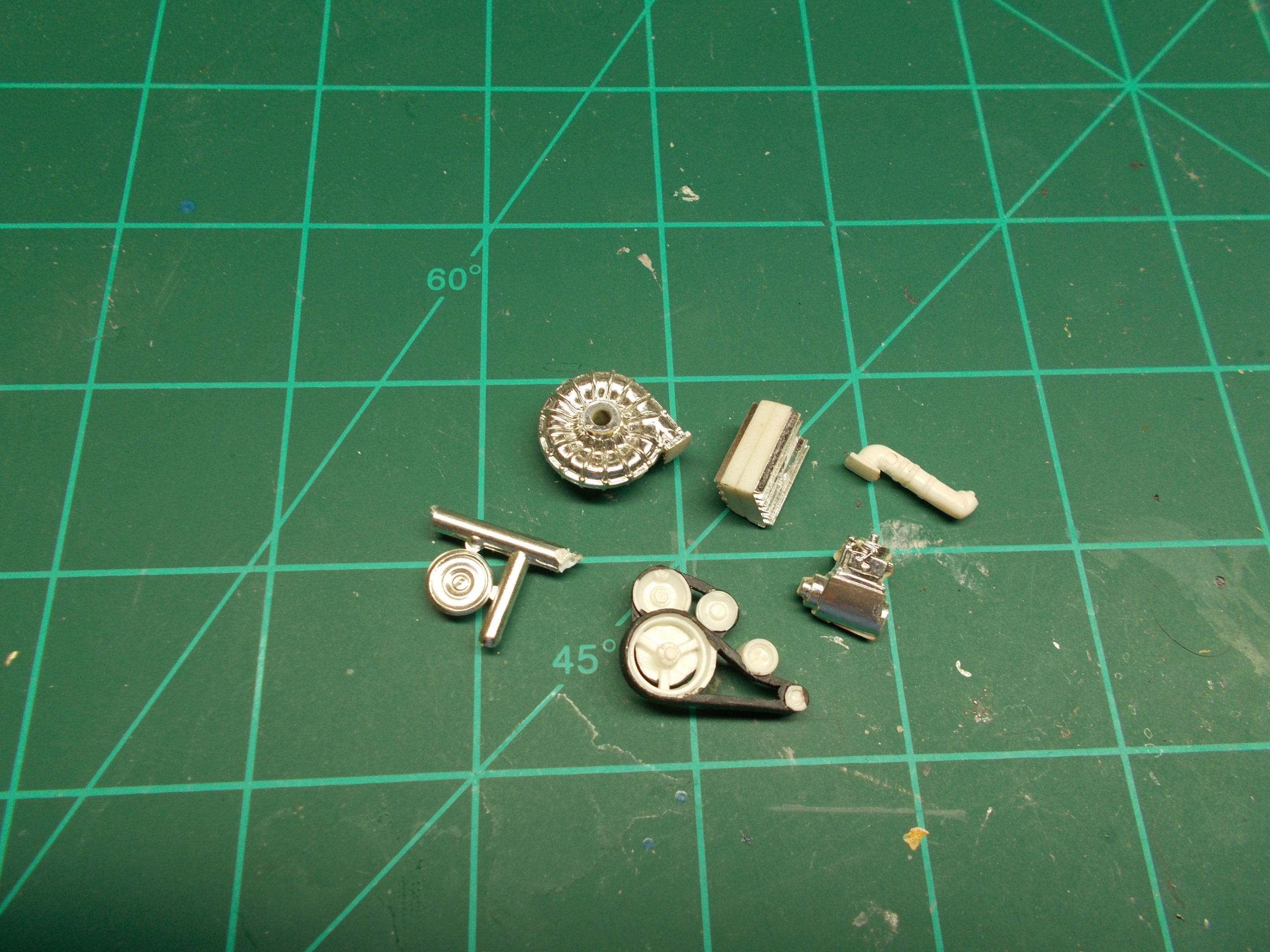 11. Well, I have been chipping away at several projects at once- more putty and sanding on the car behind the egg crate grille, as well as continuing to build the grille itself. Working on the V-16 engine which will have 2 centrifugal superchargers with the help of Norm Veber. Started stripping the paint from my Dodge power wagon- that paint is tough- used oven cleaner at first, then switched to acetone- yes, the parts are metal, so no melting- having a fit fitting the hemi in the engine compartment- need to grind/file more from the sides. A little progress on the big speed boat- got some propellers which are made for spinner fishing lures which will work perfectly- gold plated too so no painting! In addition doing some good trades on the forum and sharing info with everyone!
