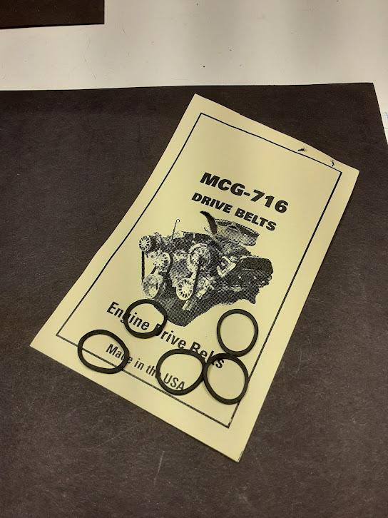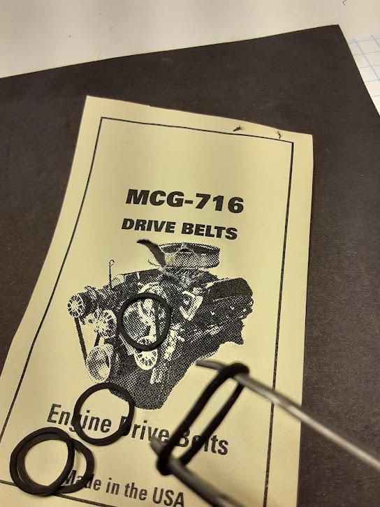 Thanks everyone for the interest in this build. I use an old Samsung android for the photo's . The fan belt came from Machined Aluminum Specialties, was part of a pro stock detailing system that I bought about 15 years ago. I got lucky, the belt fit perfectly. Here are some pics of fan belts that I have. The Model Car Garage is a little thick, but could work. Off the Sprue seems more in scale, it's thin rubber, downside is it has to be glued together, which at all cost I was trying to avoid. Hope this helps.