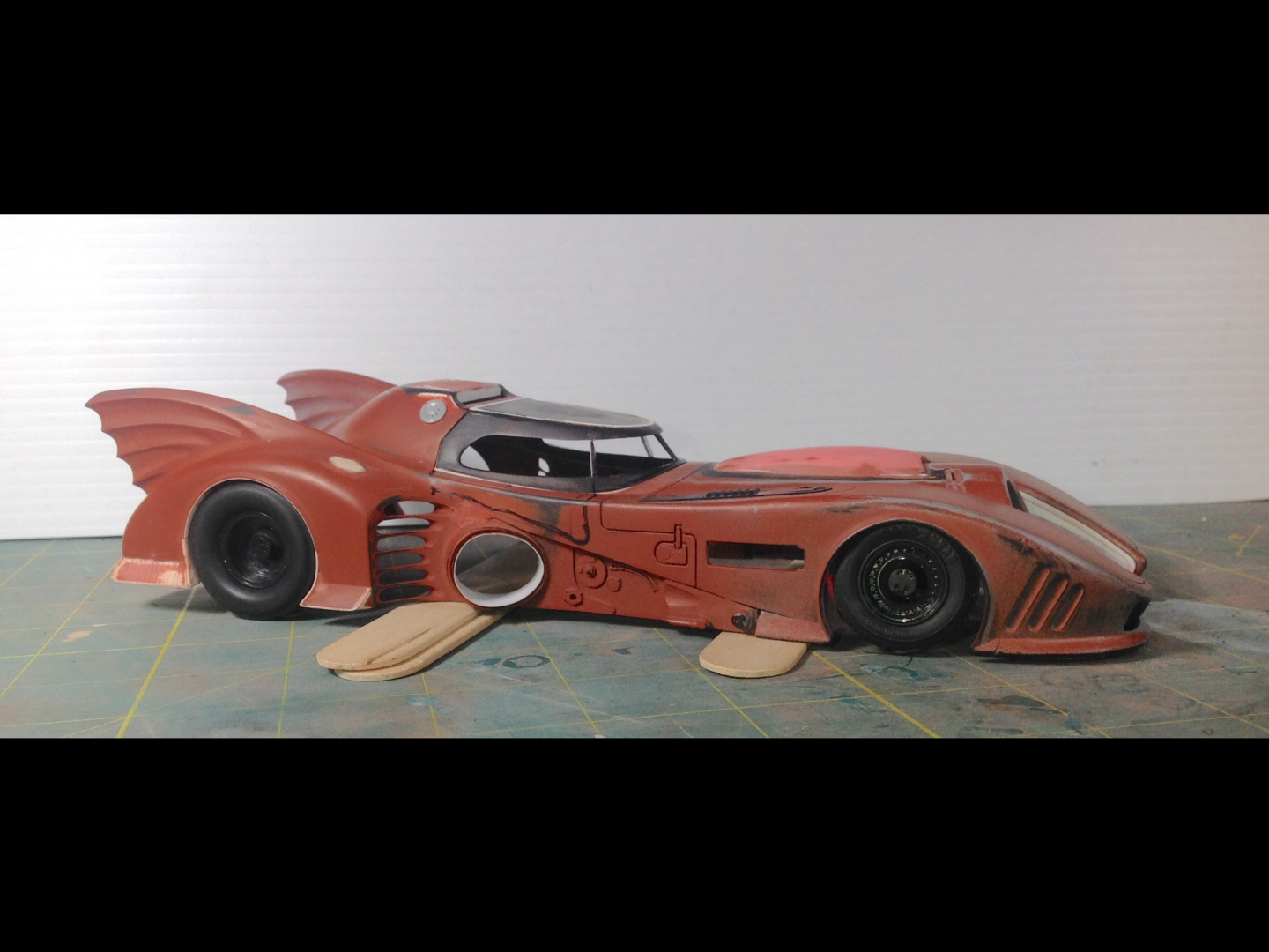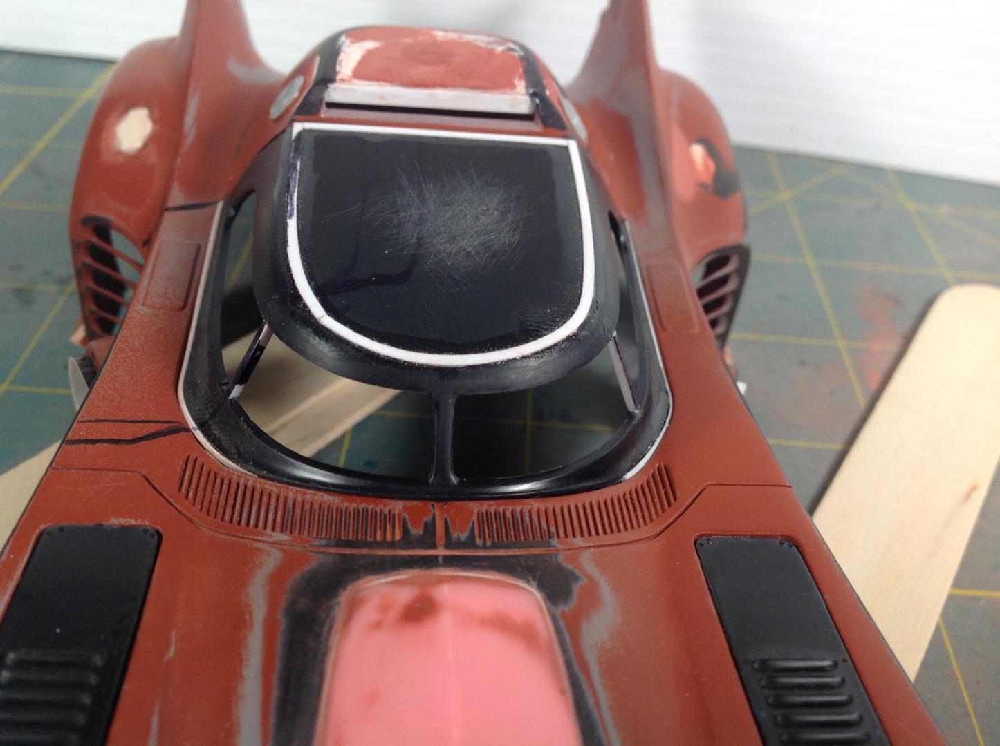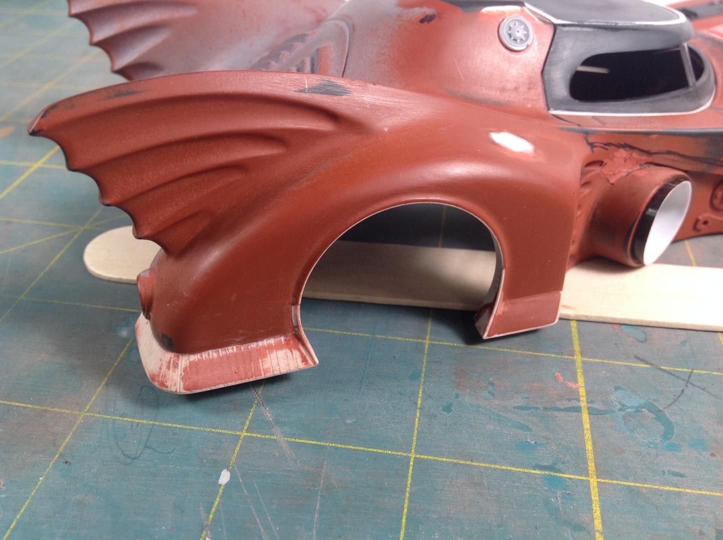 The chassis plate alignment and fit is pretty bad on this kit. The body sits WAY TOO high, and the wheels don't line up properly in the wheel openings, they also sit too far forward on the front and too far back on the rear. The front inner wheel well on the left side is exposed. The saw made quick work of the needed trimmings. Pretty easy to see all the added/changed bits in white styrene. I decided not to scribe door panel lines, not worth the effort. I am thinking about carving out the rear uprights and turn the four vains into two. In my eye the four sections on the uprights look more like a fish fin then a bat wing.