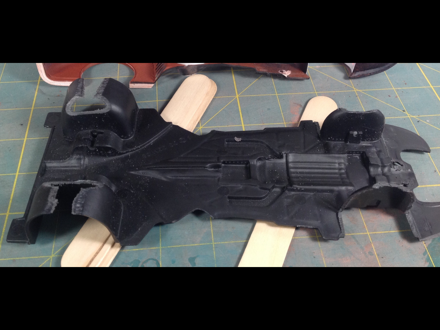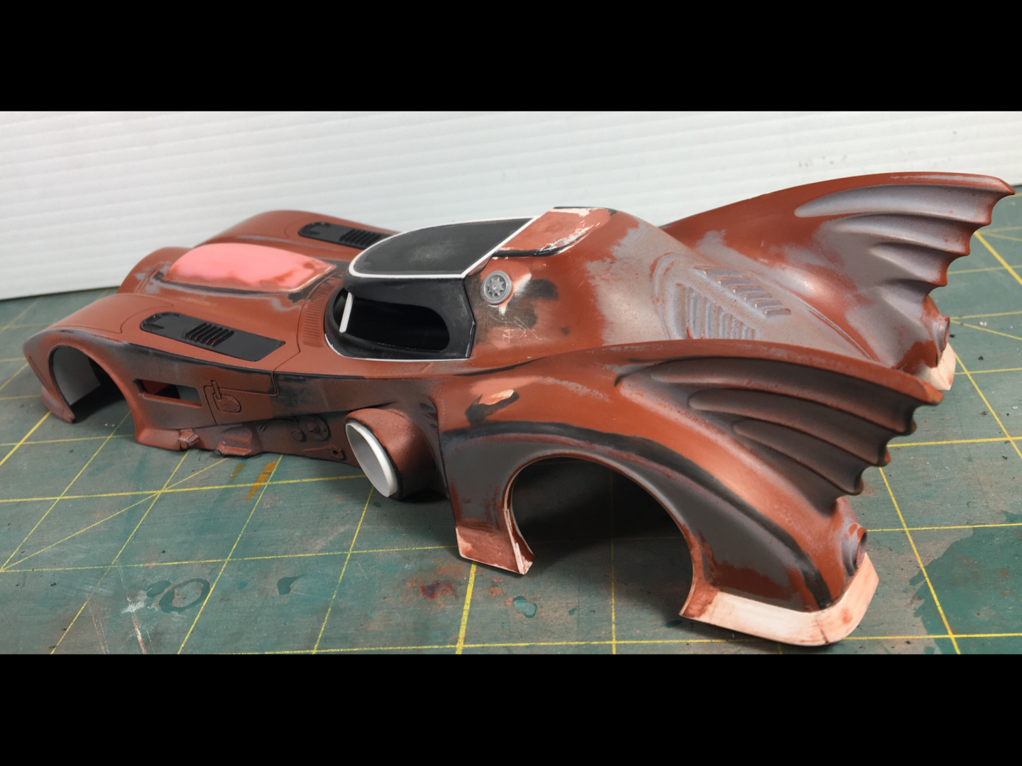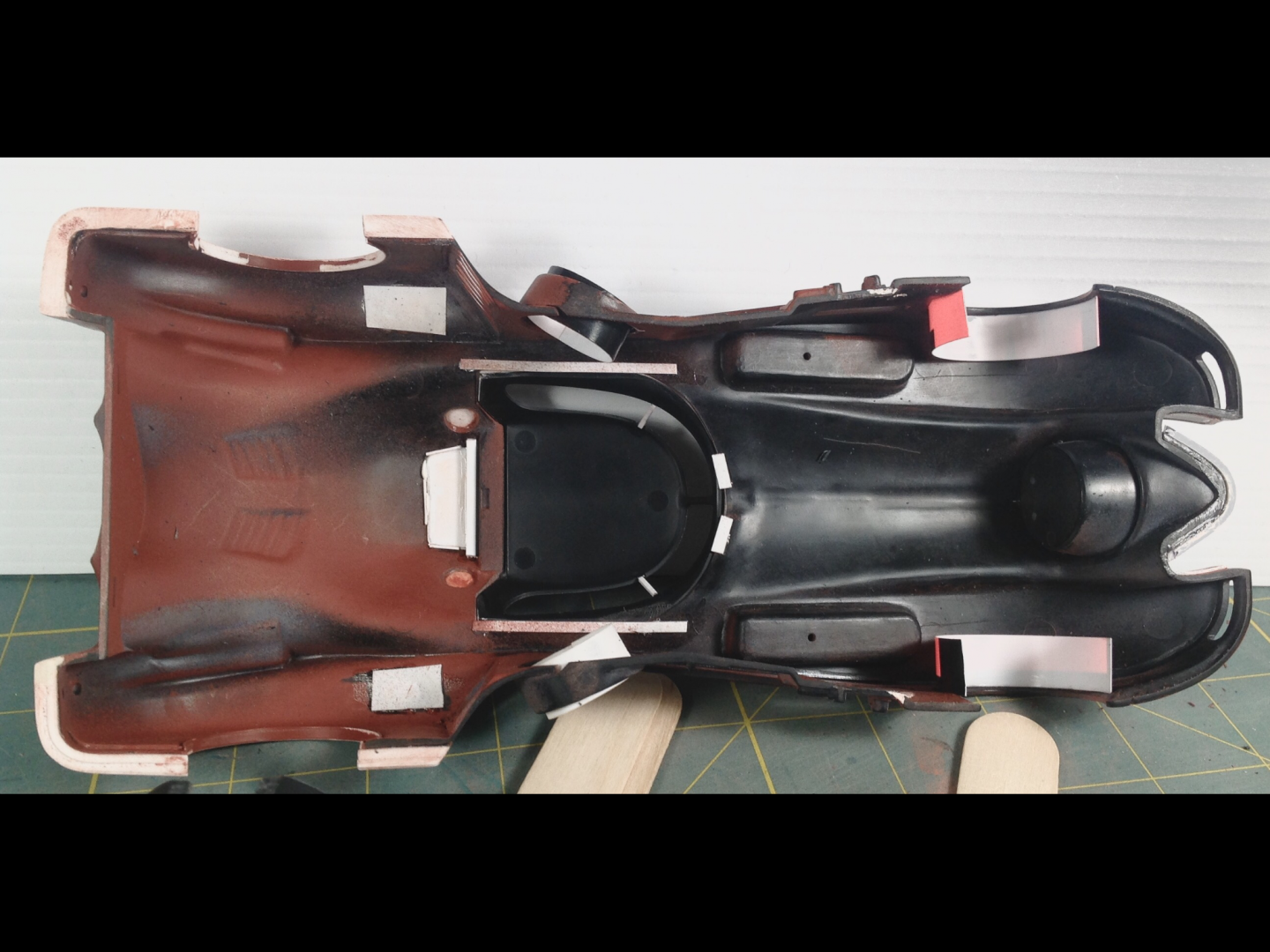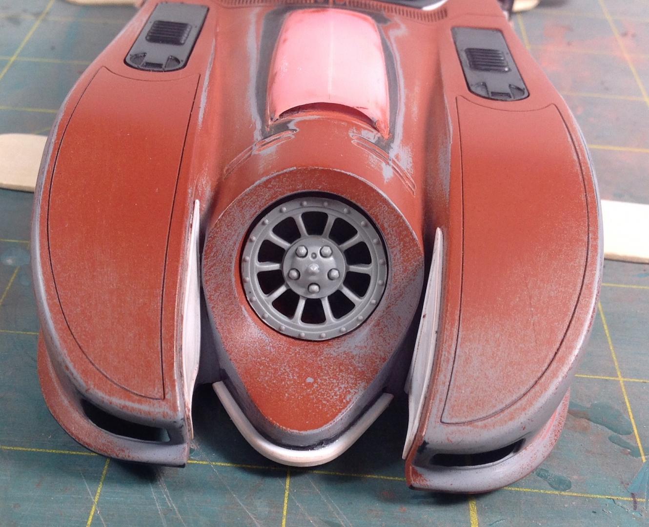 The chassis plate alignment and fit is pretty bad on this kit. The body sits WAY TOO high, and the wheels don't line up properly in the wheel openings, they also sit too far forward on the front and too far back on the rear. The front inner wheel well on the left side is exposed. The saw made quick work of the needed trimmings. Pretty easy to see all the added/changed bits in white styrene. I decided not to scribe door panel lines, not worth the effort. I am thinking about carving out the rear uprights and turn the four vains into two. In my eye the four sections on the uprights look more like a fish fin then a bat wing.