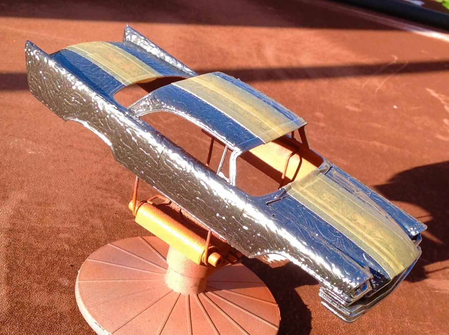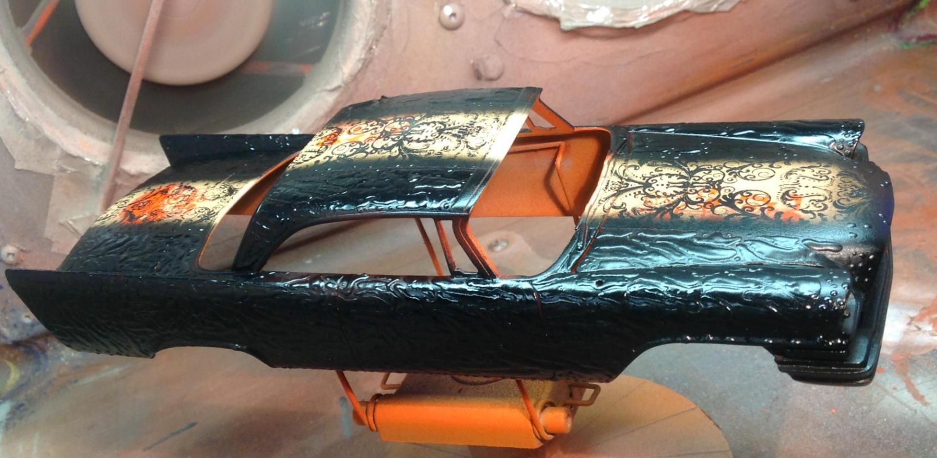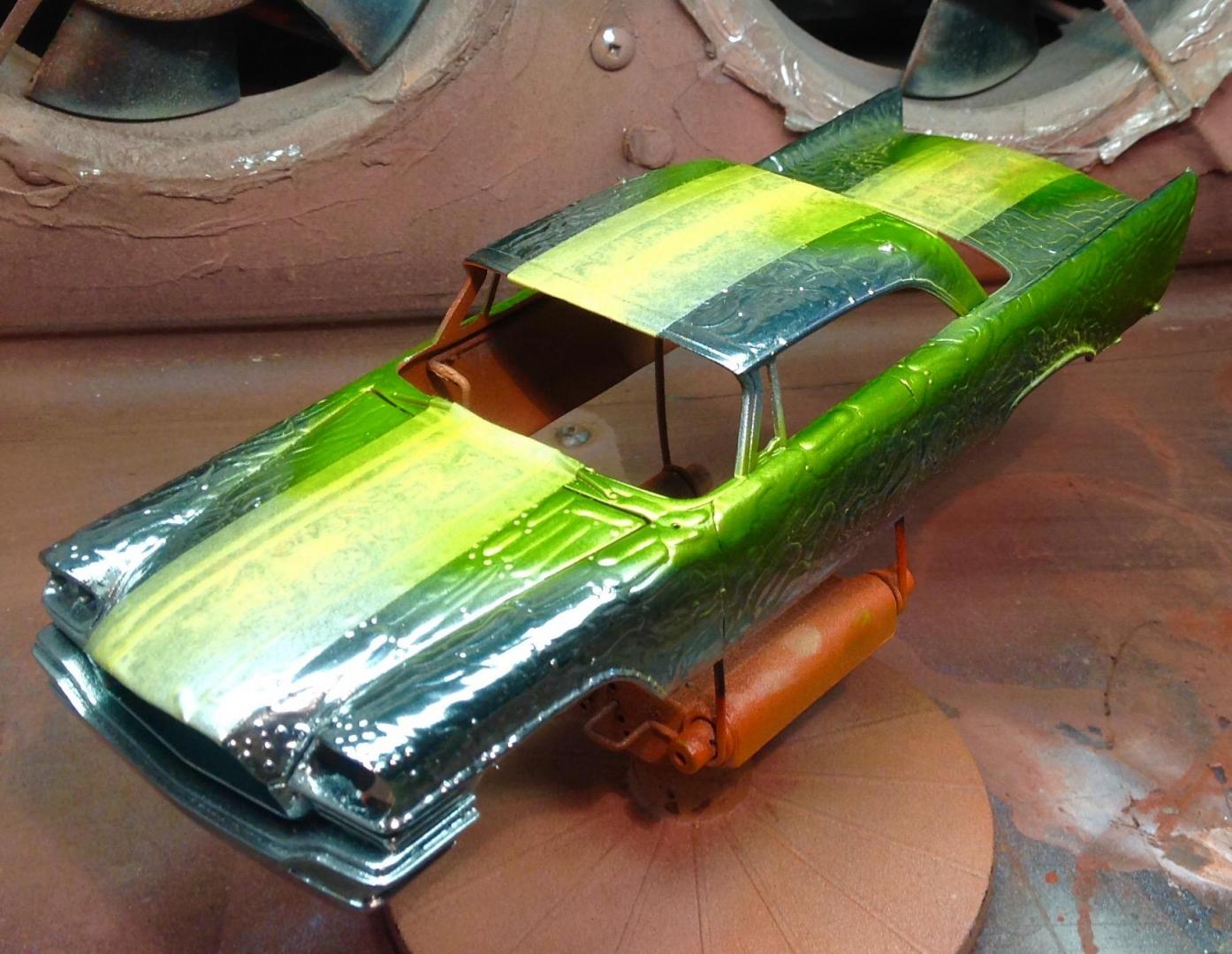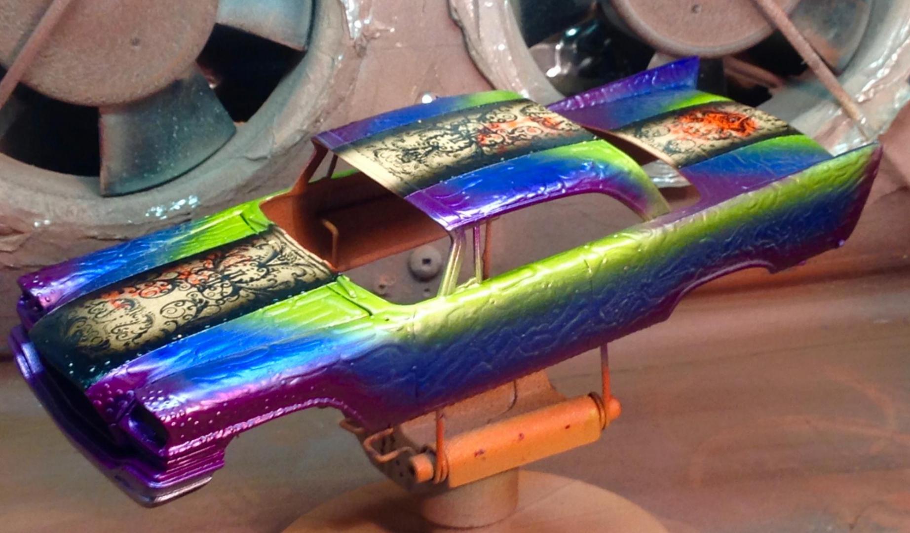 16. Dan, I used tiny,tiny bits of Blue Tac to hold on the gears. Sorry man missed that question. Thanks Jolly. I got the transfers of eBay, I just searched nail transfers. As for what clears can go over them, no idea, I used 3prt poly. Given it is meant for nails I would imagine it can handle some hot lacquers. To transfer them you first have to apply a liquid adhesive. Once it sets up, becomes tacky, you apply the transfer. Thanks John, it's only one car, the purple/silver combo failed, so I stripped it in brake fluid. No real plans other then redo the paint, and reassemble it, the engine is what ever Hemi that came in the kit, which I believe is a 392. Your build sounds fantastic John, feel free to post up a link or pics up here. So so this is where I am for now. Have to wait a few days for the paint to gas out and completely dry before the latex can be removed without concern of any flakes sticking to the underlying paint. Going to very interesting to see how it all looks once the latex is removed and the clear goes down.