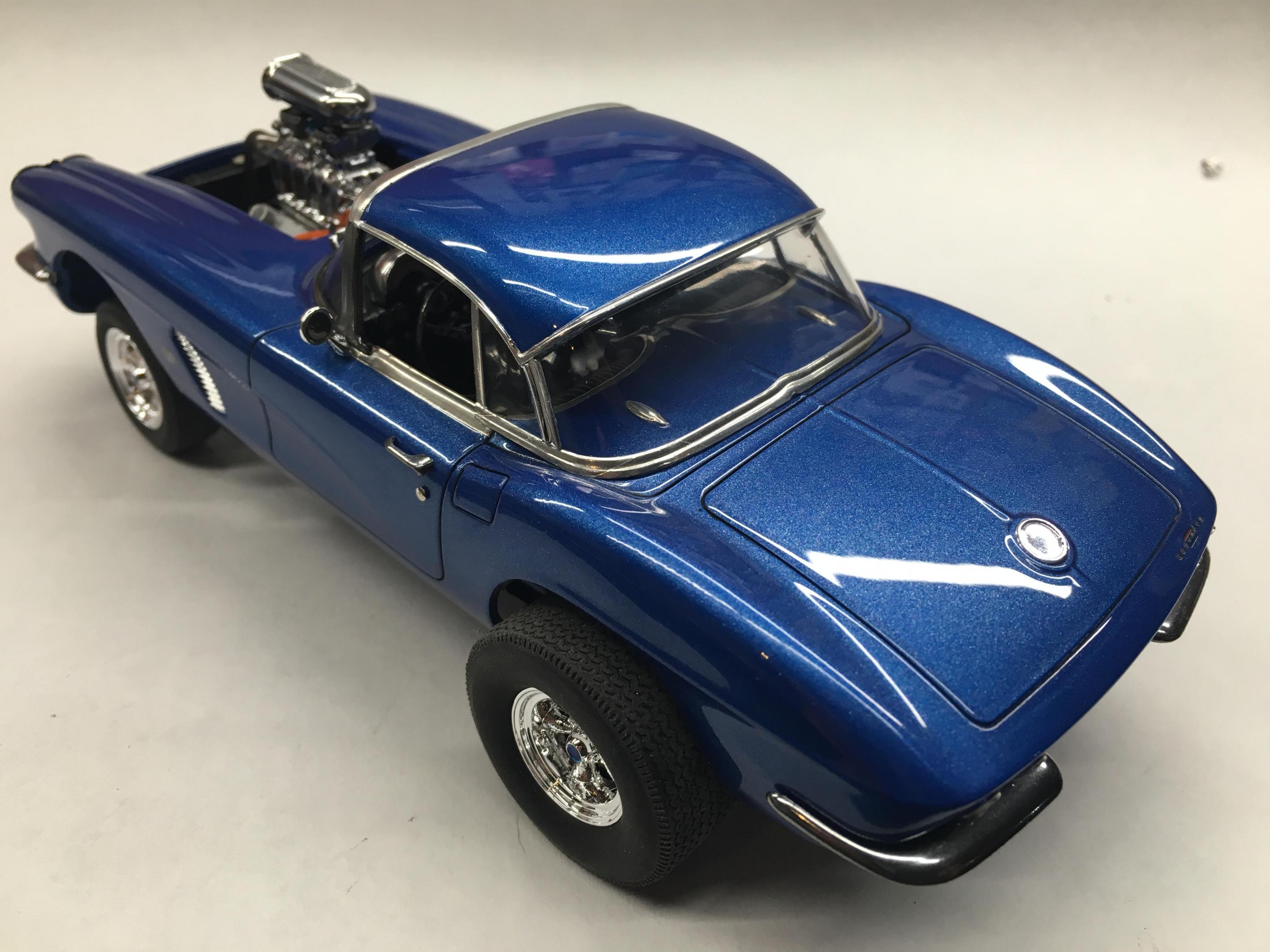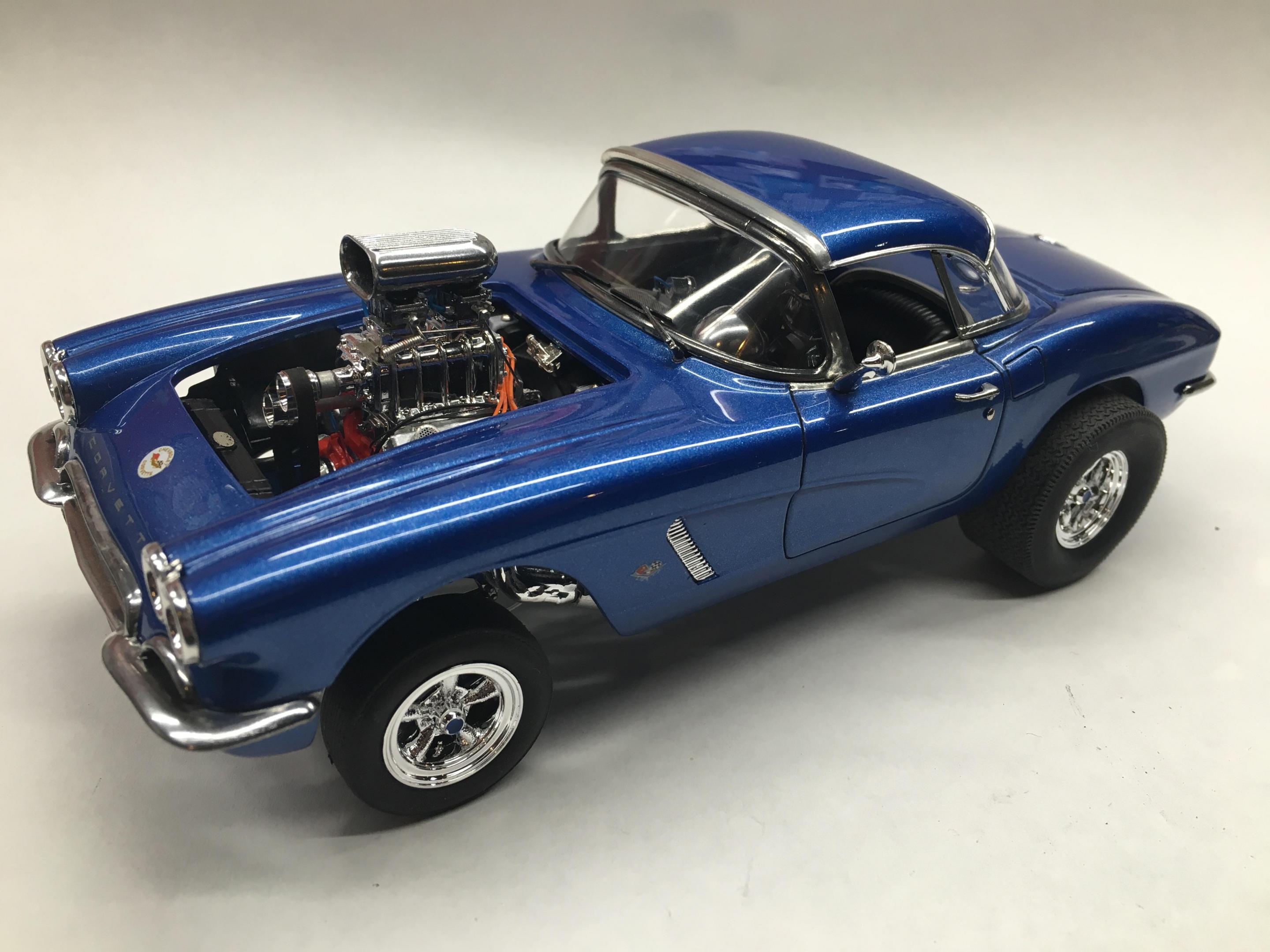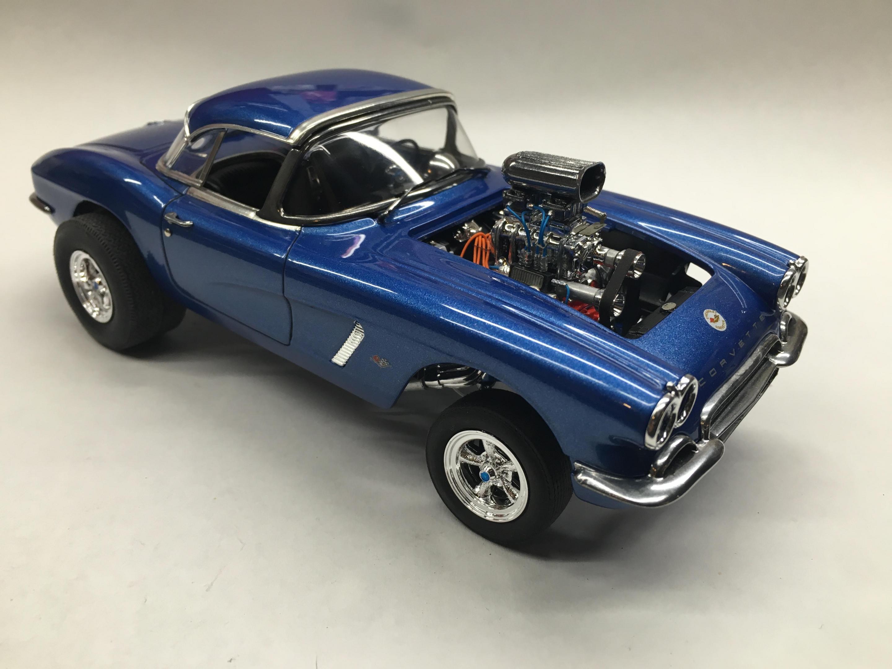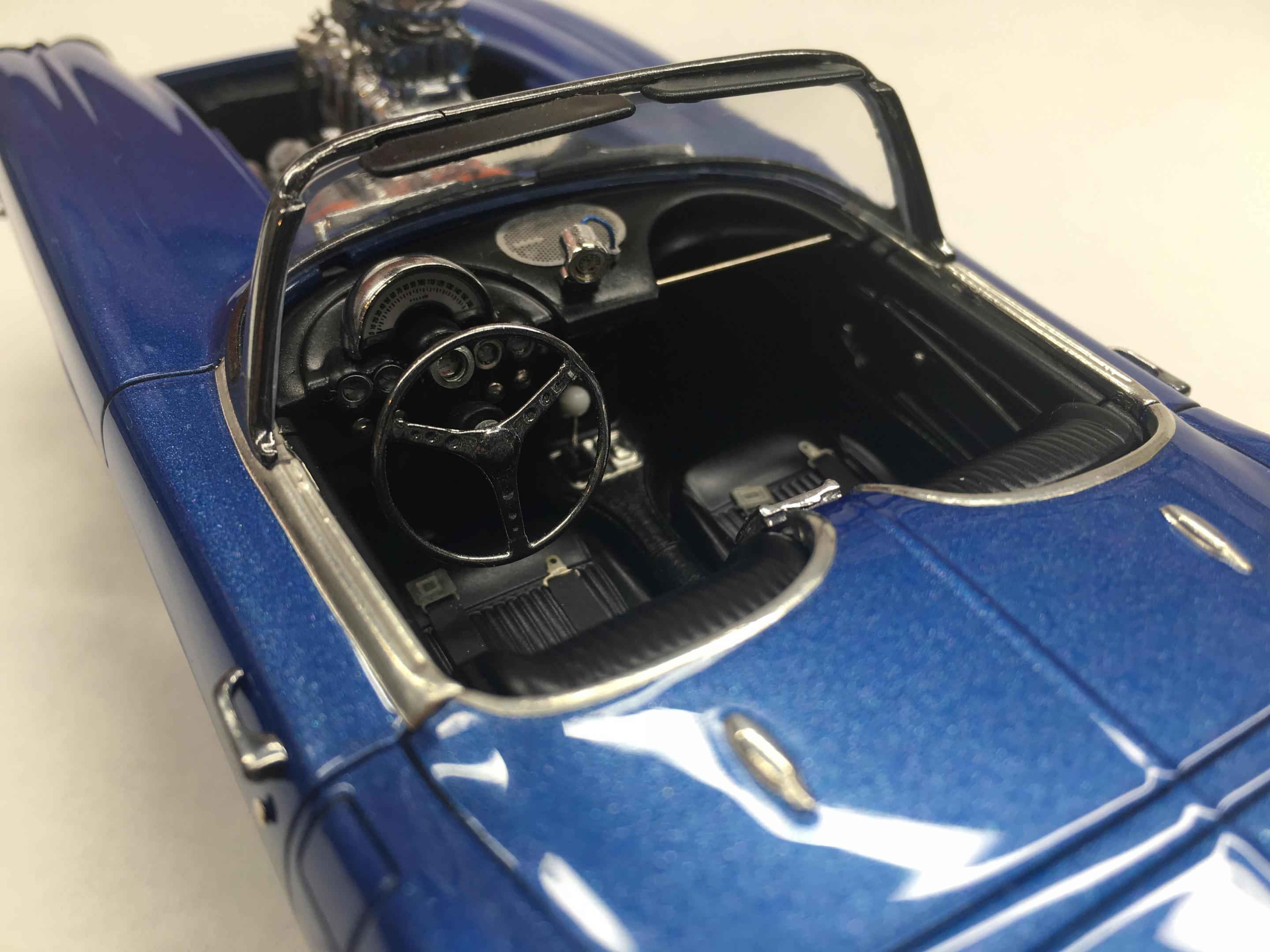 Moebius kit . Tamiya Racing Blue & white gloss base , shot over with Testors Wet Look Clear laden with Pearl X . Slixx decals . Detail Master wire and fittings . Parts by Park air cleaners . AMT tires and Cragars.