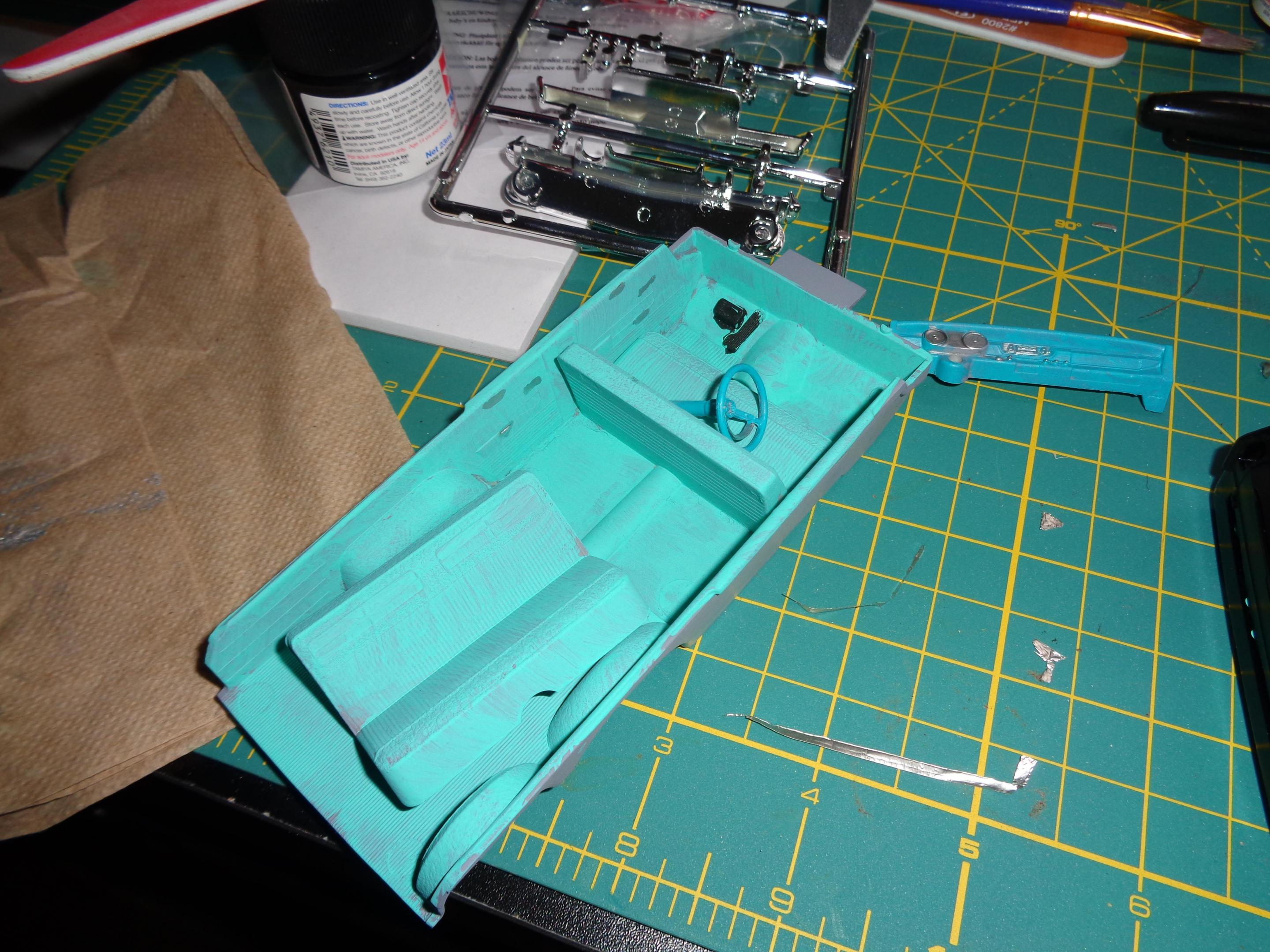 The color works nicely. I like the interior on your pickup. That would probably be a pretty safe bet to use as a direction for this build. Alternately, if you want something a little differnt, Scale Motorsports offers seat-cover decals in the pattern of western blankets and similar things that were semi-common in the cars of a high school kid/young adult in the mid-1950s-late 1960s. Charlie Larkin
