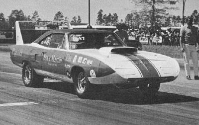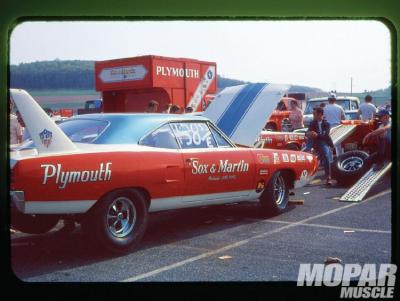 I have done some research on the subject and there are some pictures on the internet of the Sox & Martin Superbird...s...yes they had two different cars, but there aren't that many pictures around of them. One of the Superbirds ran in Super Stock / E (SS/E) and was one of only two Super Stock Superbird's built (Jack Werst got the other and ran in SS/EA), that car was not used for very long, just a couple of months in 1970 and it's the car the Jo-Han kit is supposed to be, the other Sox & Martin Superbird ran in C / Modified Production (C/MP) and it was used for a longer period. The SS/E car had no hood scoop and a painted blue metallic roof, the C/MP car had a Six Pack hood scoop and a black vinyl top. The engine setup was also different, the SS/E car had a 426 Hemi with a Rat Roaster intake manifold and dual 4bbl Carters as it was a Super Stock car, and the C/MP car had a 426 Hemi with Individual runner intake manifold and dual 4bbl Holley Dominators, pretty much the same setup as the Revell Sox & Martin 70 Barracuda has. Slixx has some sets of Sox & Martin decals and they had one set for the Superbird, Road Runner and GTX (#SM3/1483) but I don't know if they still have it in stock. Here are a couple of pictures of the cars. Note that none of the cars has the rearward facing scoops on top of the front fenders. The SS/E car. And the C/MP car. -