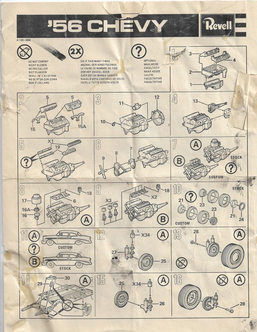 Those instructions are for the new tool 56 Chevy wich came out in the early 2000's, the instructions he asks for is for the old tool kit from the 60's wich is a different kit all together. I have browsed all Revell albums at the Drastic Plastic Instructions folder as they usually have instructions for most kits, but they don't have anything for the old tool 56 Chevy, I found instructions for the old tool 55 and 57 and the new tool 56 kits. I have a set from the old tool 56 Chevy and I scanned them for you, they are not exactly from the kit you have but they have to be quite close as they are from the same tooling .