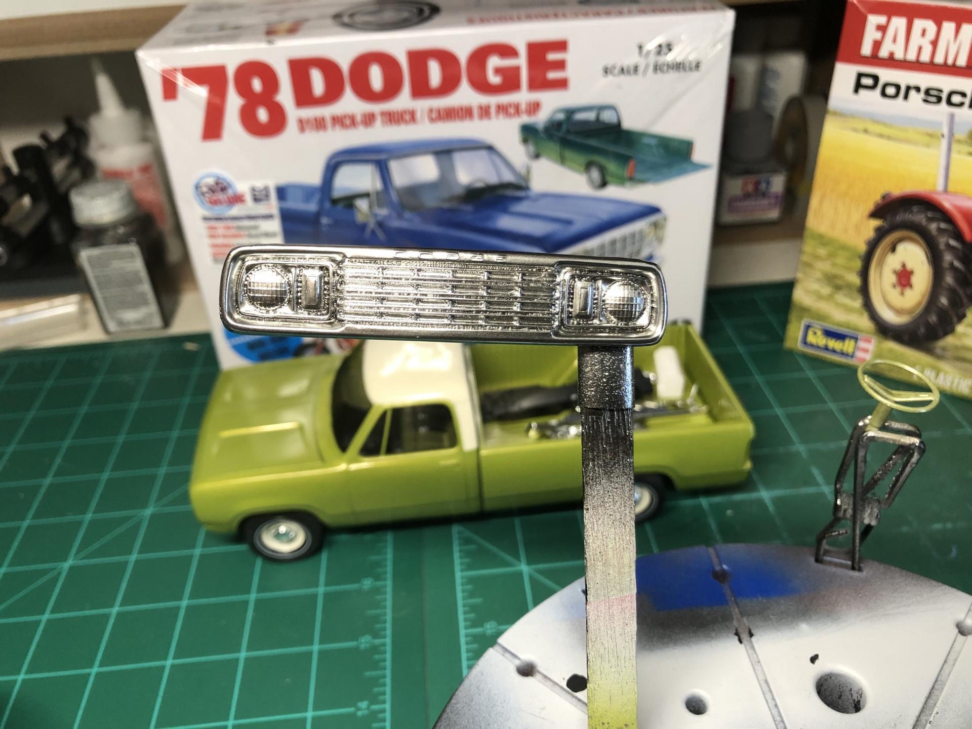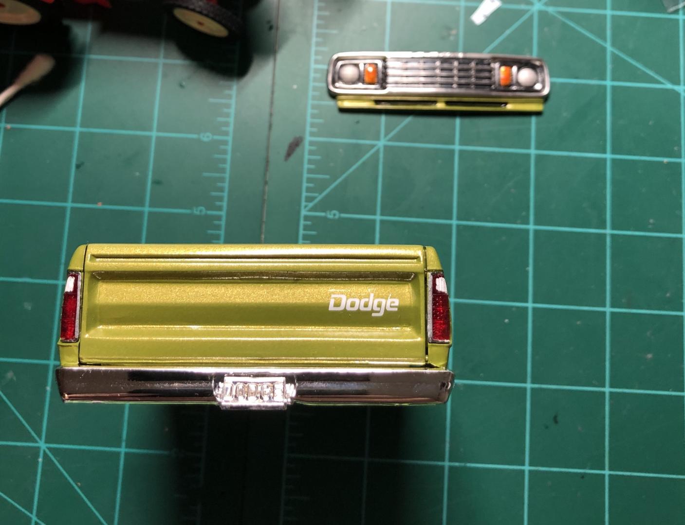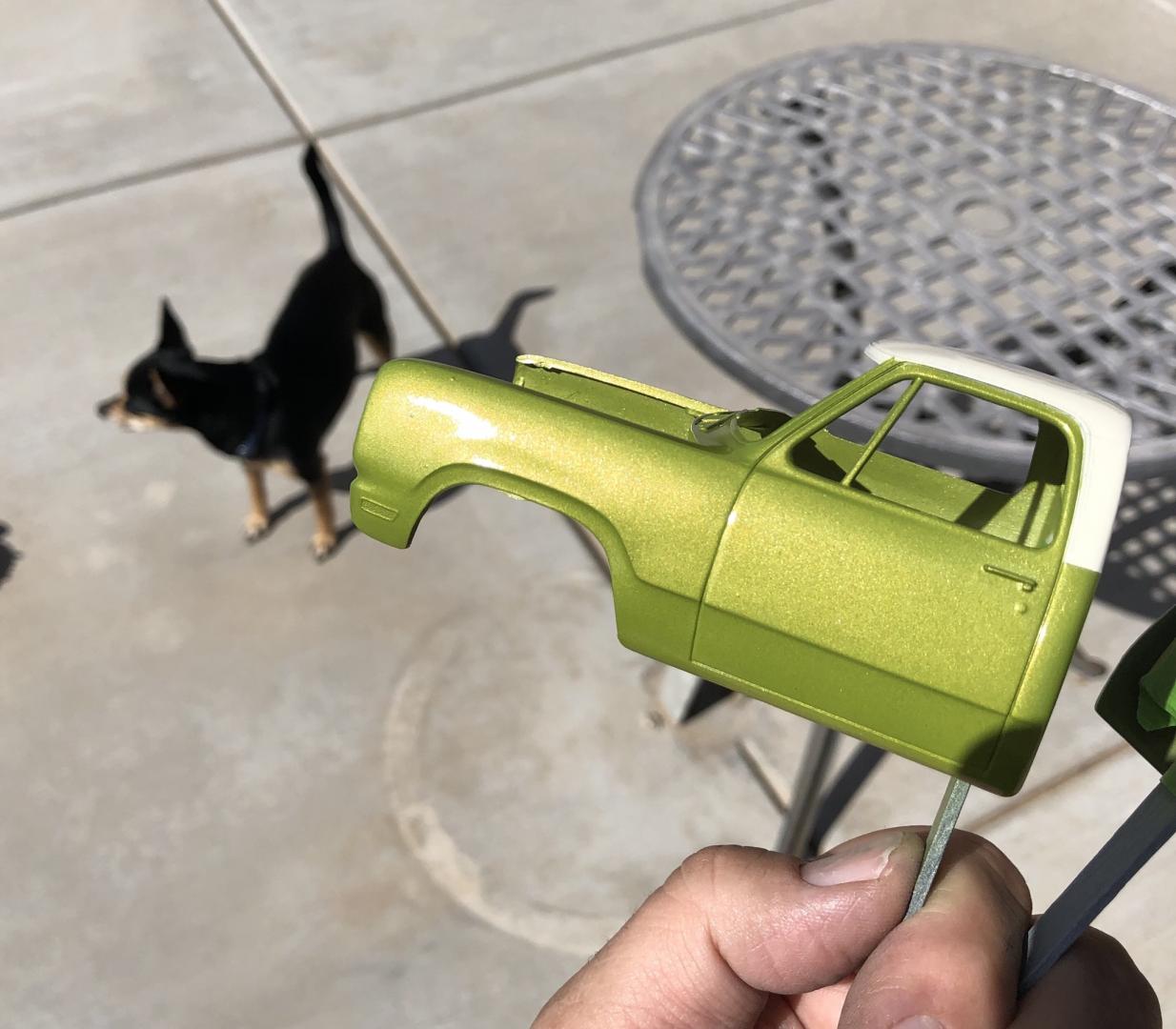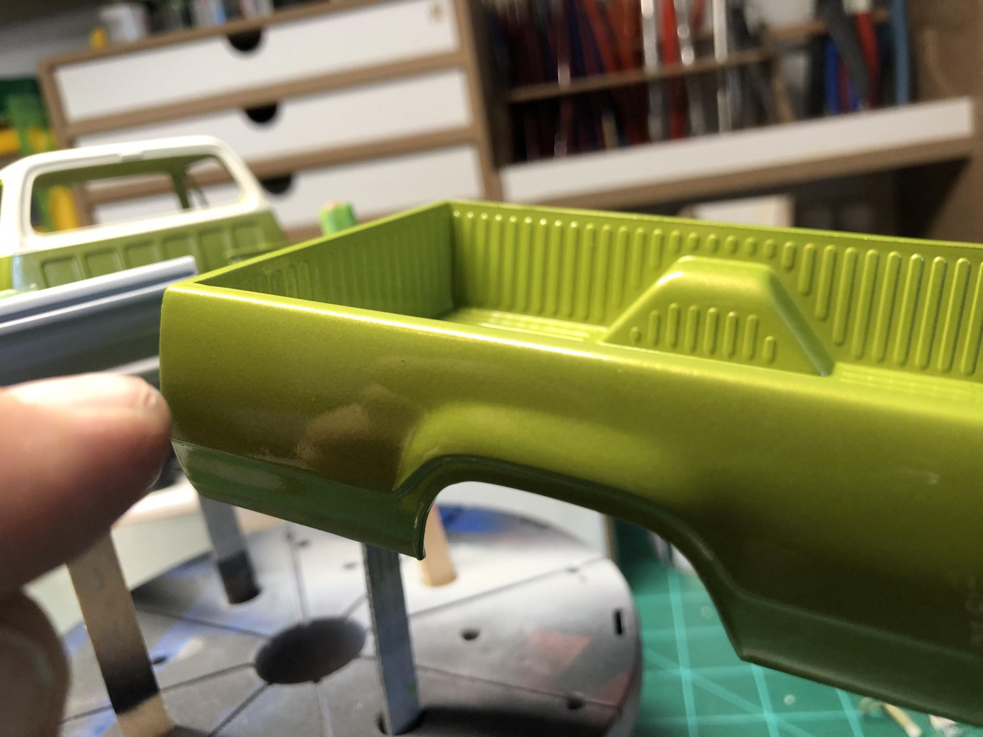 Got the hood repainted and the tail gate. And gave the cab & bed a final clear-coat and sprayed some Alclad on the grille. -