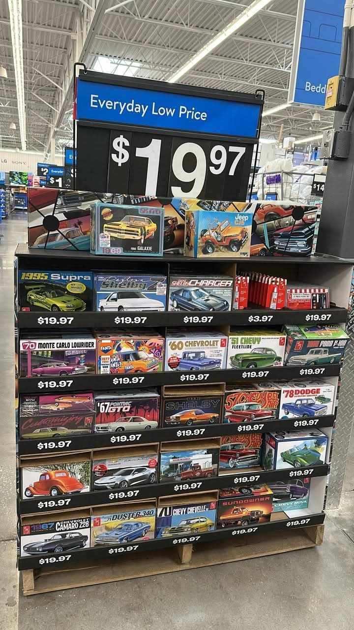 I just saw this pic posted on Facebook. It's a fresh pallet of Round2 models at Walmart. Notice some of the unique box art on some of the kits. It reminds me a bit of the old checkerboard box art AMT kits from a couple decades ago.