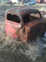 As I've stated before, I'm not really into the unfinished weld/rusted look. But I thought I would share this for those that do. I have been contimplating geting this to try and save and finish for a wile now. It has a pretty interesting story, the guy who started it got this far and his shop was burned, and so was his project. The guy who has a small wrecking yard here in town has alot of great stuff on the back line. He swapped the guy out for a stock cab and 100 bucks. I would love to try and get this strate and flat black it. Find some 50's car to rob the back half for a box How about twin hillmans...maybe turbo charged flat head 4 bangers anyone ??? -