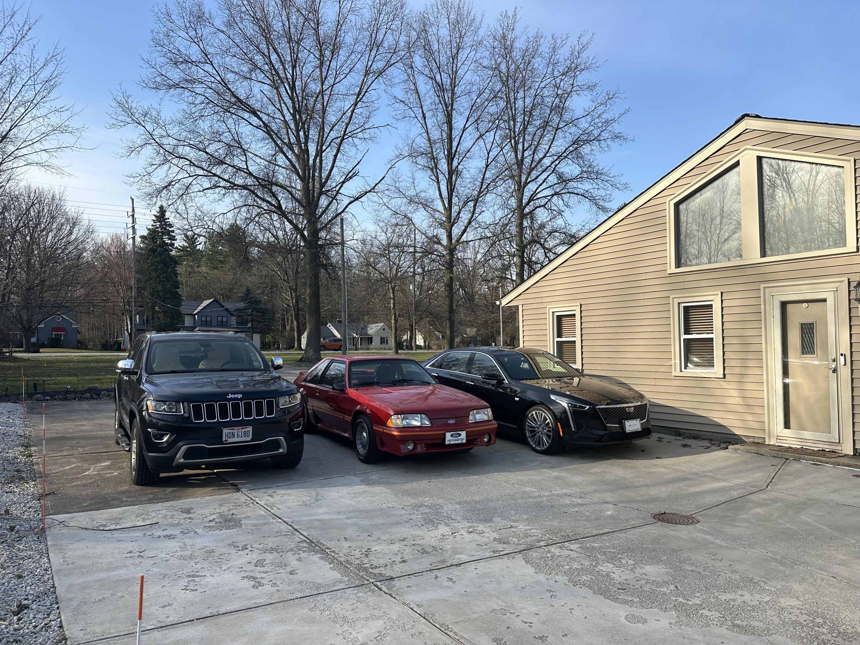Got a pic of my Jeep, Mustang and Caddy together. Hopefully have my other Mustang back on the road this year.