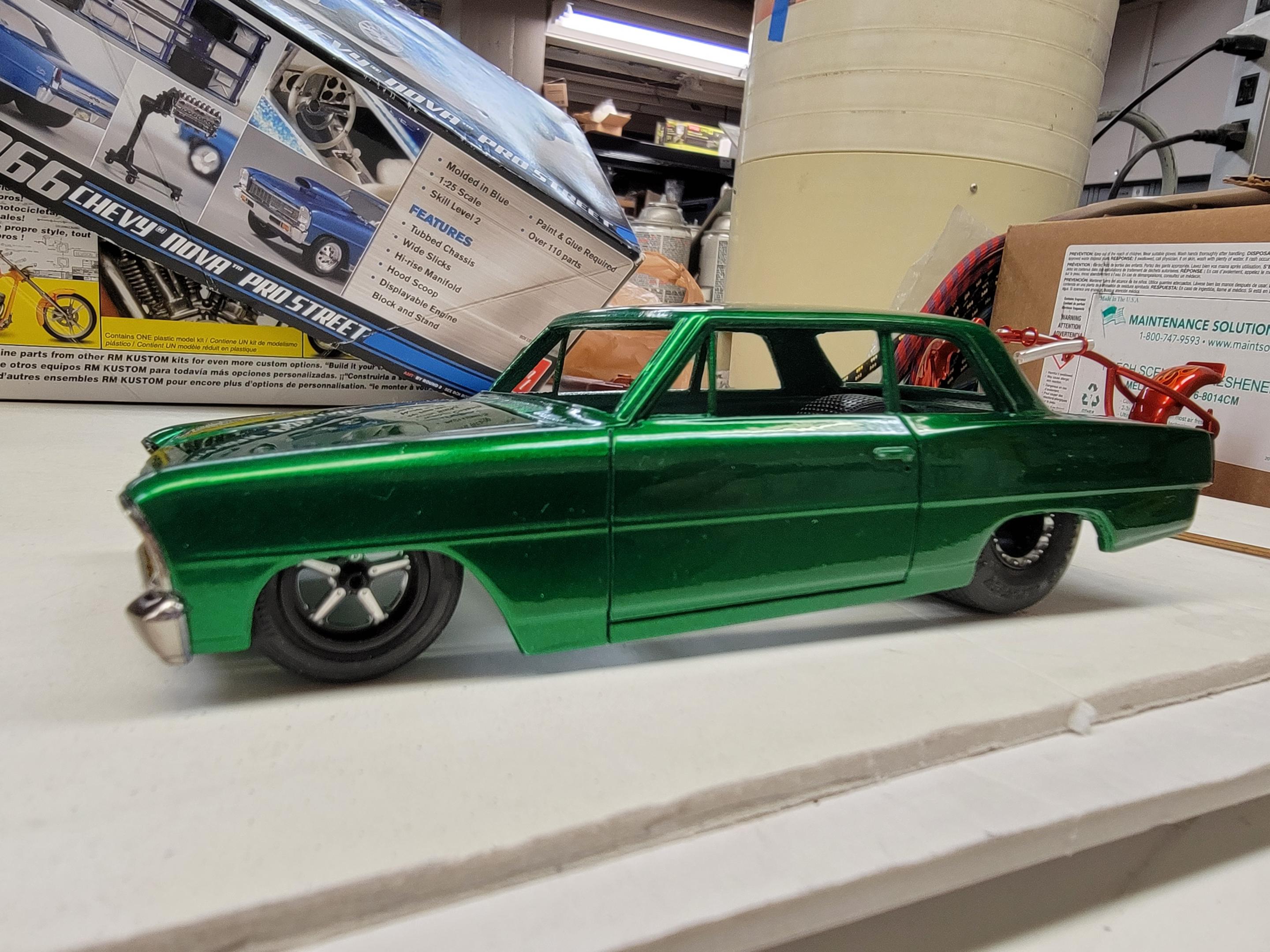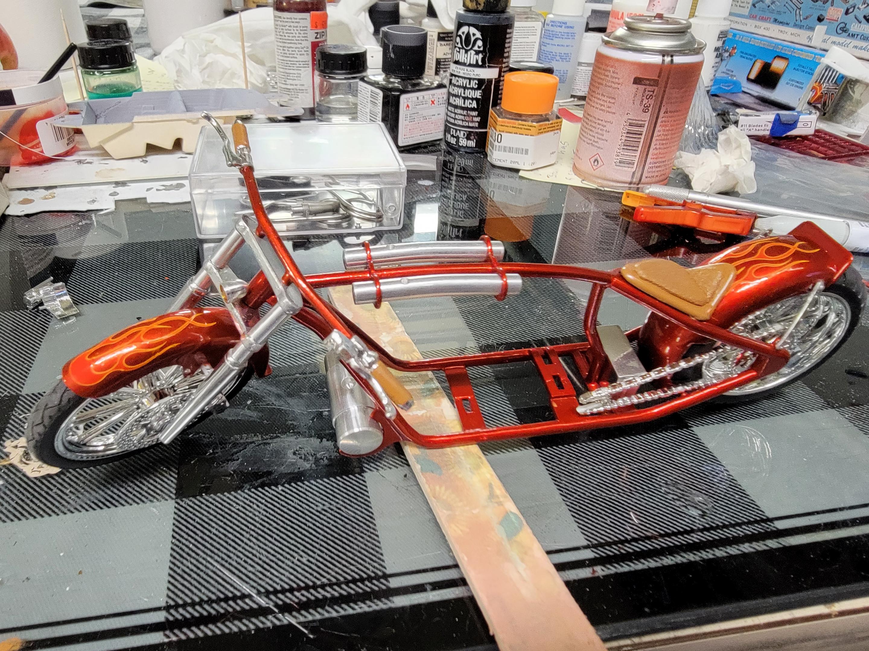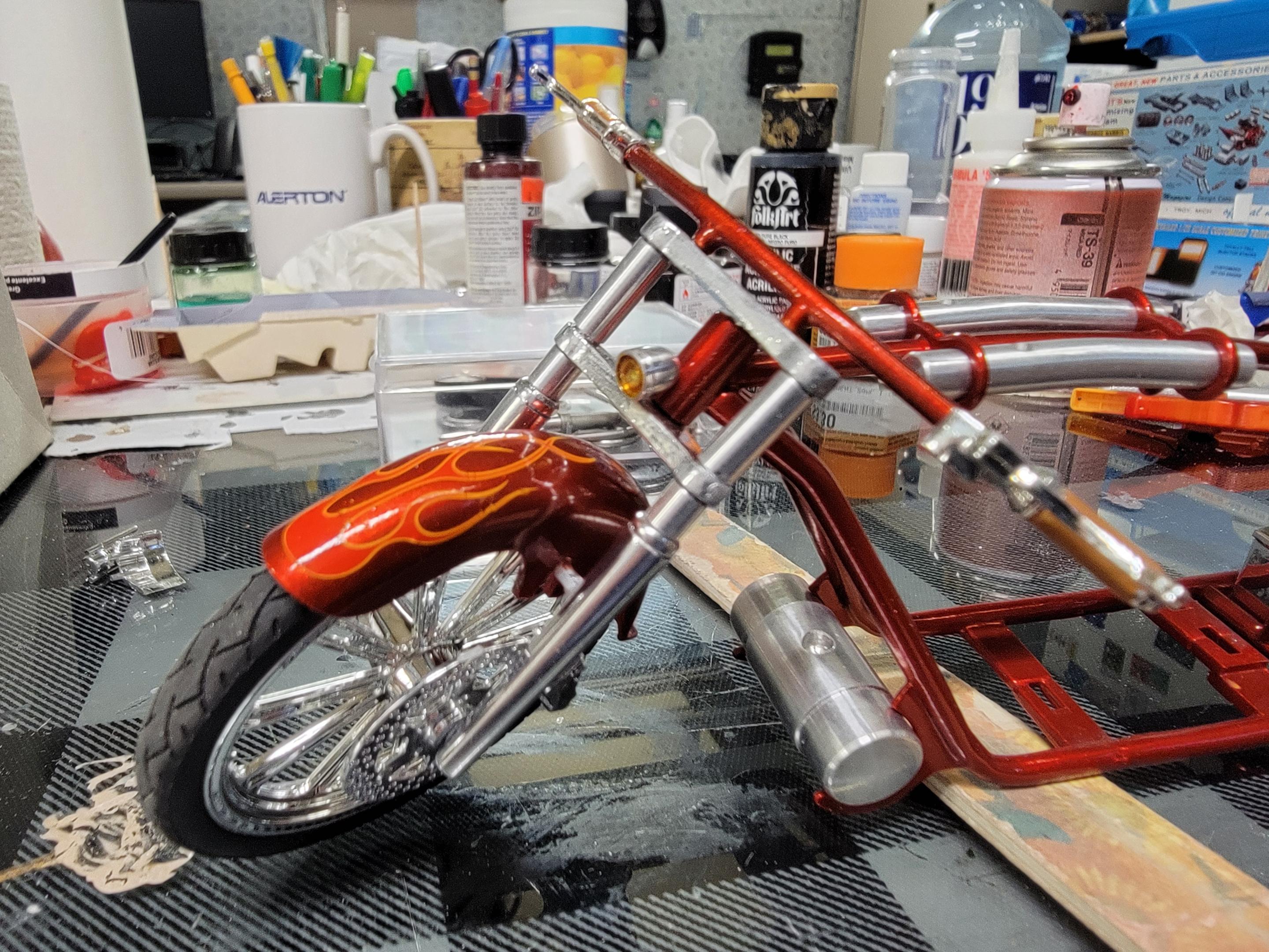 That fogging on the paint is looking great Tom! I spent some.time.today doing a bit (very small amount) of BMF on the 57 Chevy. I also airbrushed some Molotow chrome on some parts for my custom chopper. I sprayed a final coat of clear on my Nova Sedan and sprayed a coat of Tamiya Smoke on the chrome for it. Later-