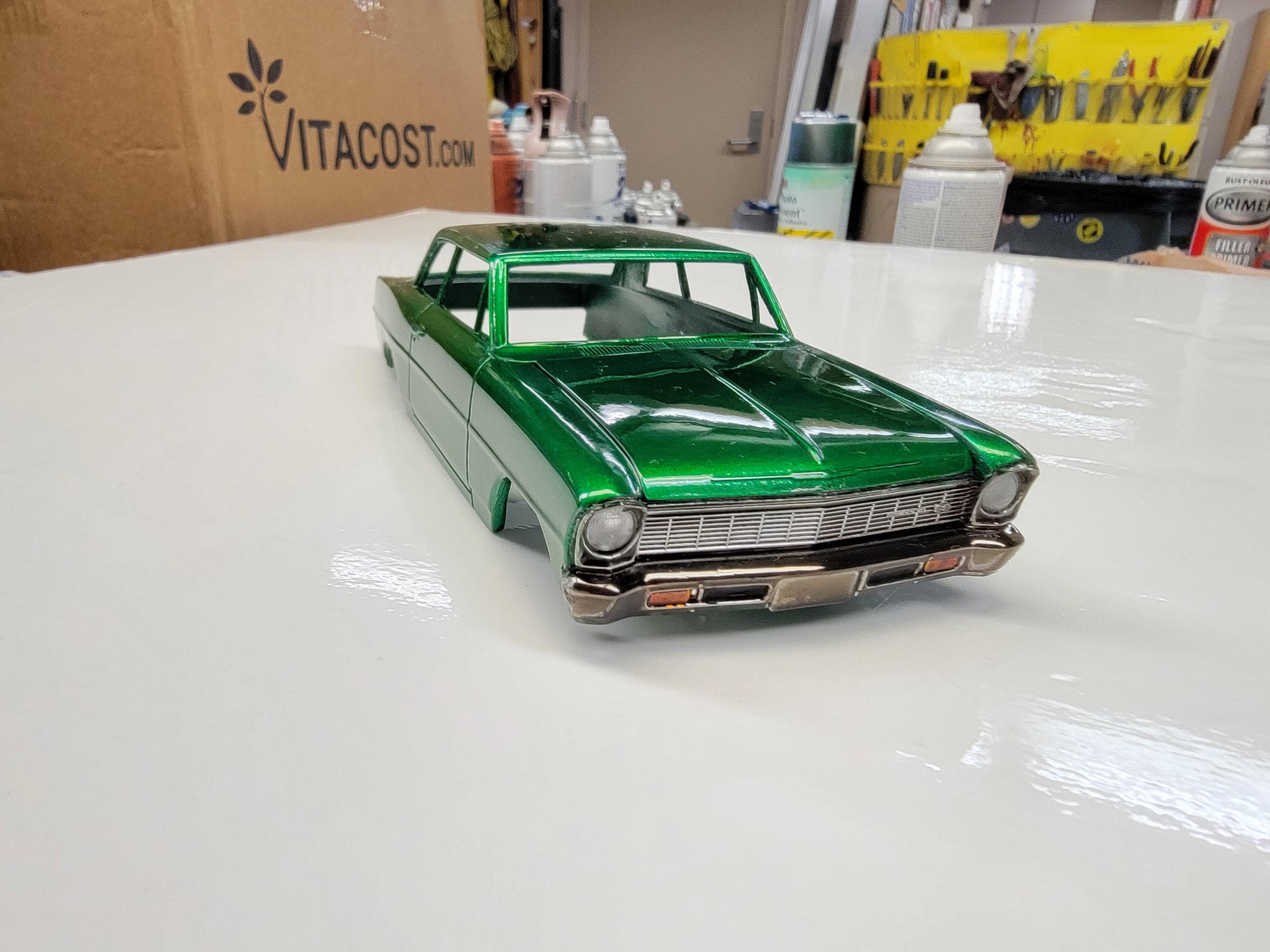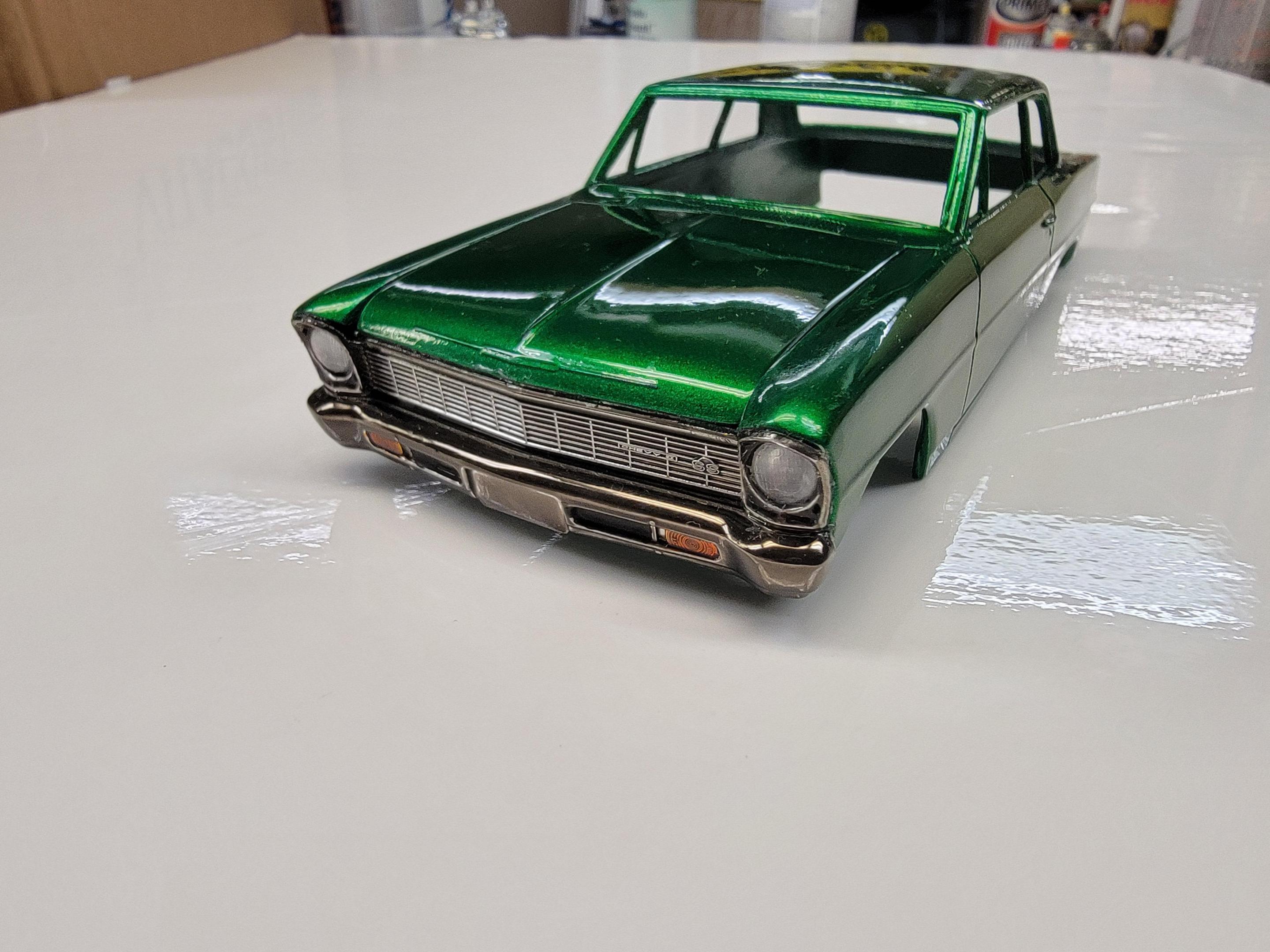 Zippi- Great looking 1:1 you found. Nice to see someone else building a similar Nova. I looked online and found one I like. I'm thinking of building a turboed LS motor for mine (if I can come up with an LS). My Nova is a resin post sedan. I sprayed the chrome with Tamiya Smoke. Can't wait to see yours. Later-