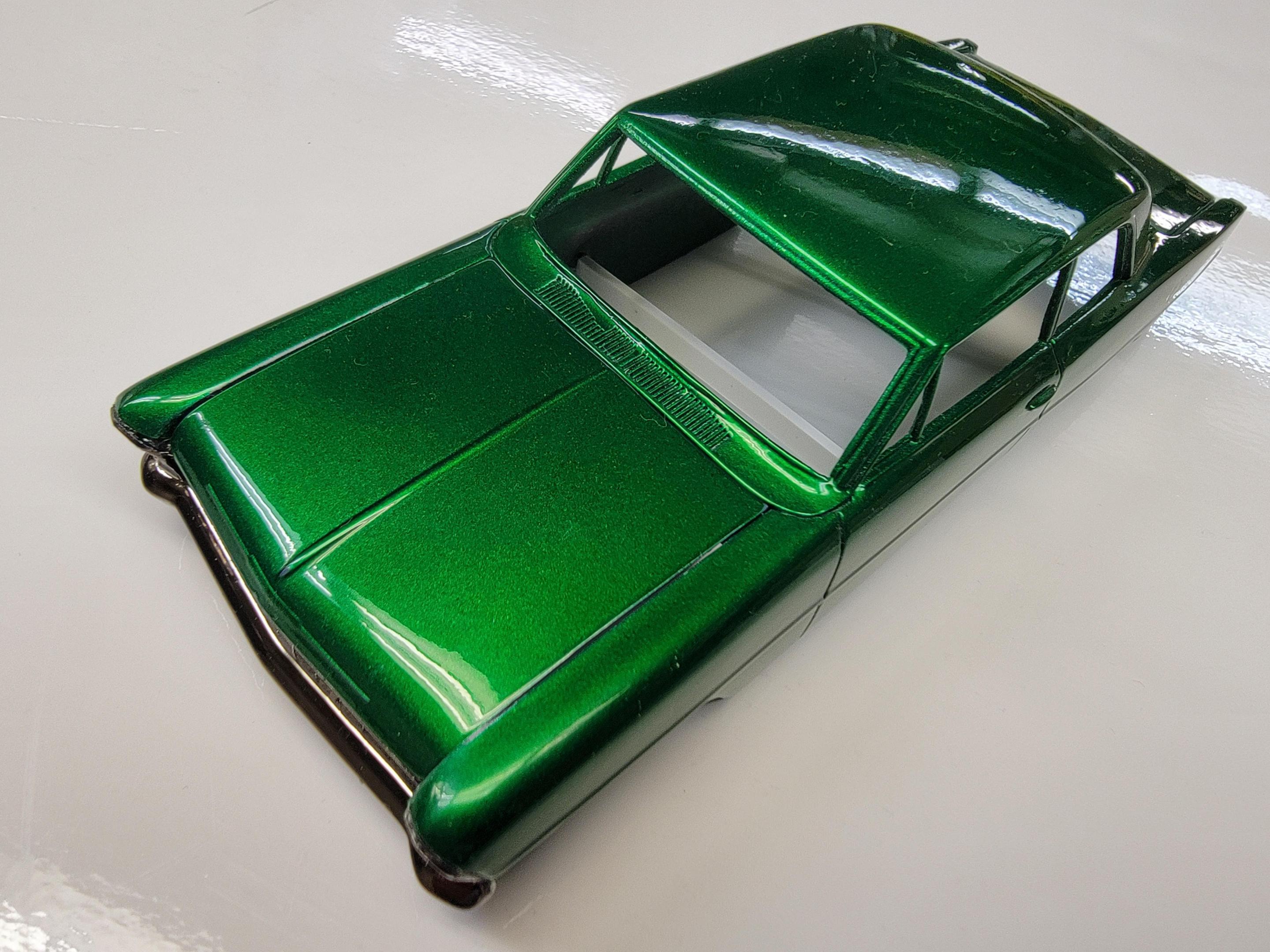 This is a resin body that I got in a trade recently. The paint is Tamiya Gunmetal with Tamiya TS 20 Metallic Green then topped with Tamiya X 25 Clear Green. The chrome has three light coats of Tamiya Smoke sprayed over it. Thinking of something like an LS7 for power. Later-