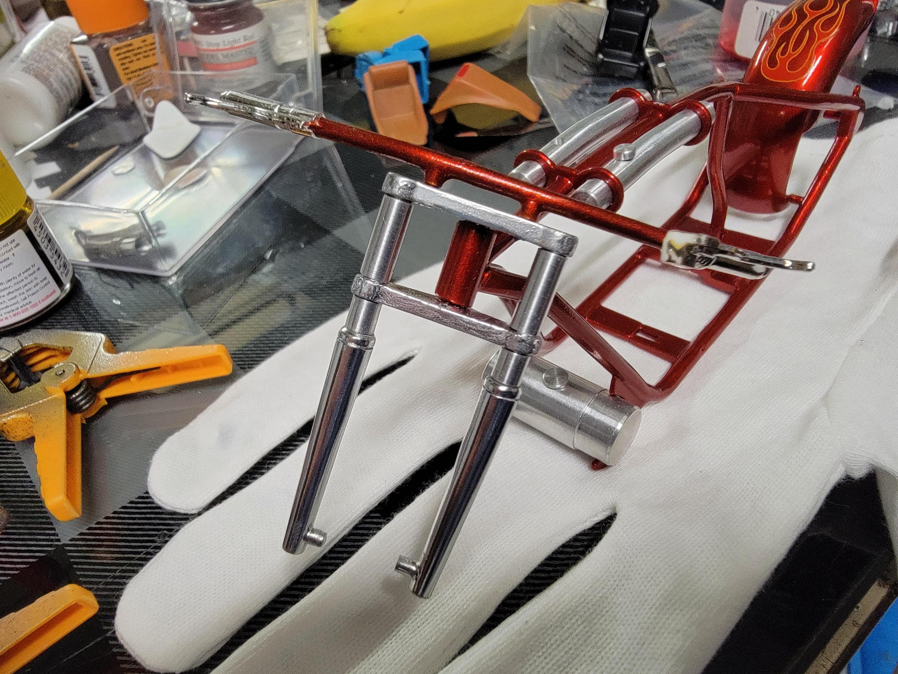 Got some paint sprayed on the bars and Molotow chrome sprayed on the front forks and parts. Progress is slow but working on three projects at the same time. Later- -