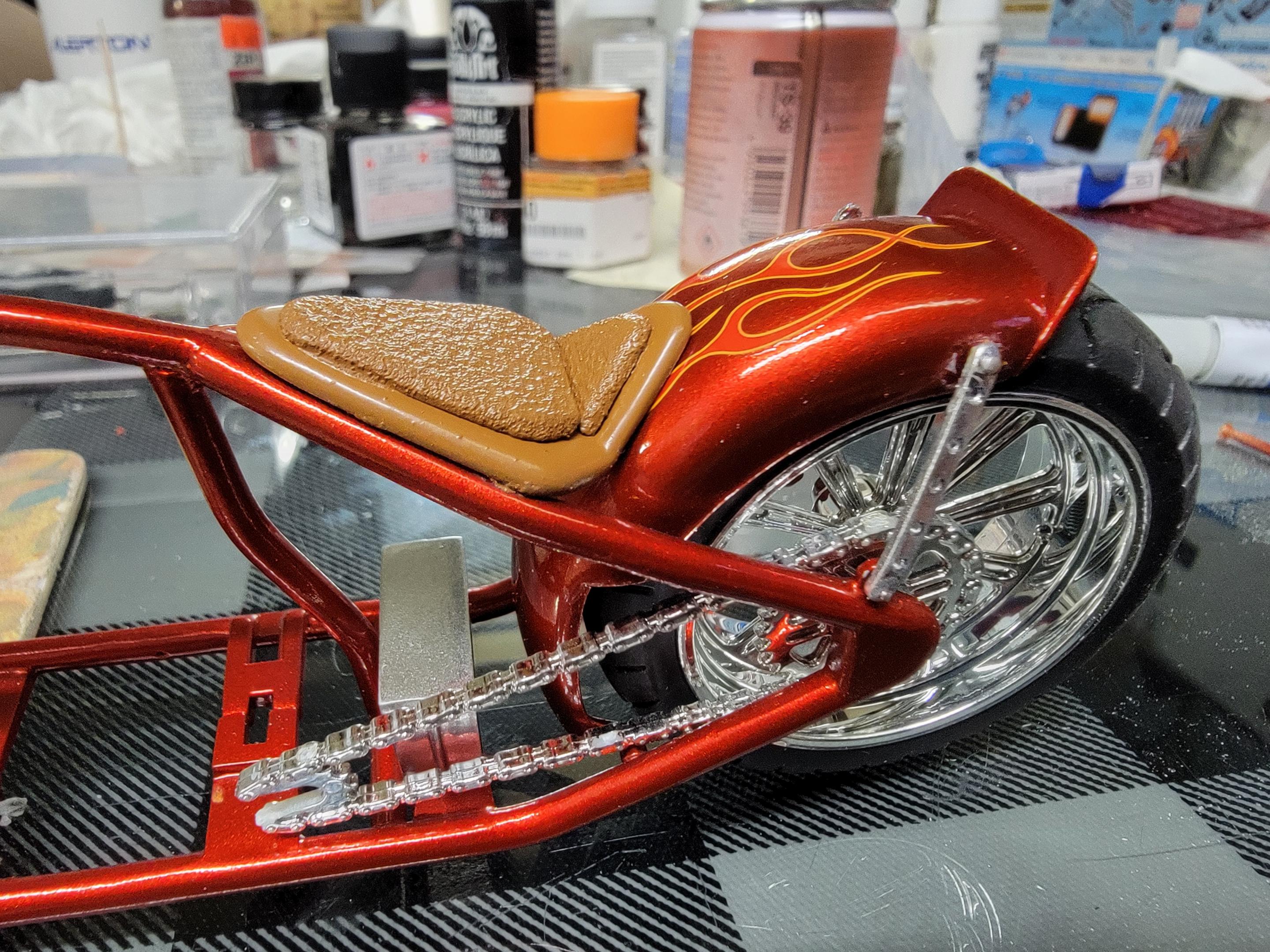 Thanks Man. I have been slowly plugging along on this during breaks at work. Made a seat cushion and painted it and the grips in Satin Warm Caramel. I thought it would go better with the red than black would. I also have the front end together and am working on the engine and rear wheel setup. At the moment the rear tire hits the fender so I'll need to do some adjusting there. Later- -