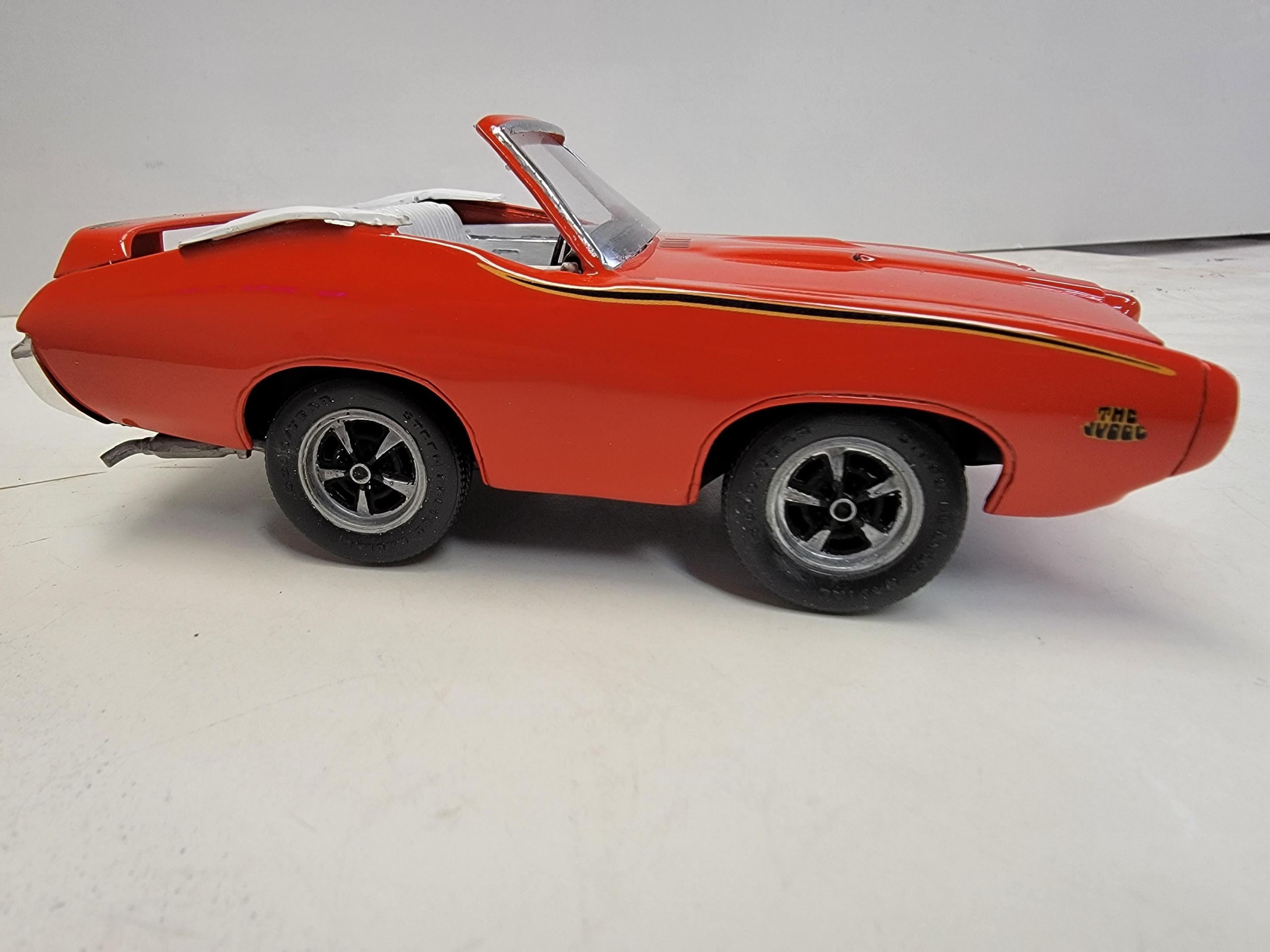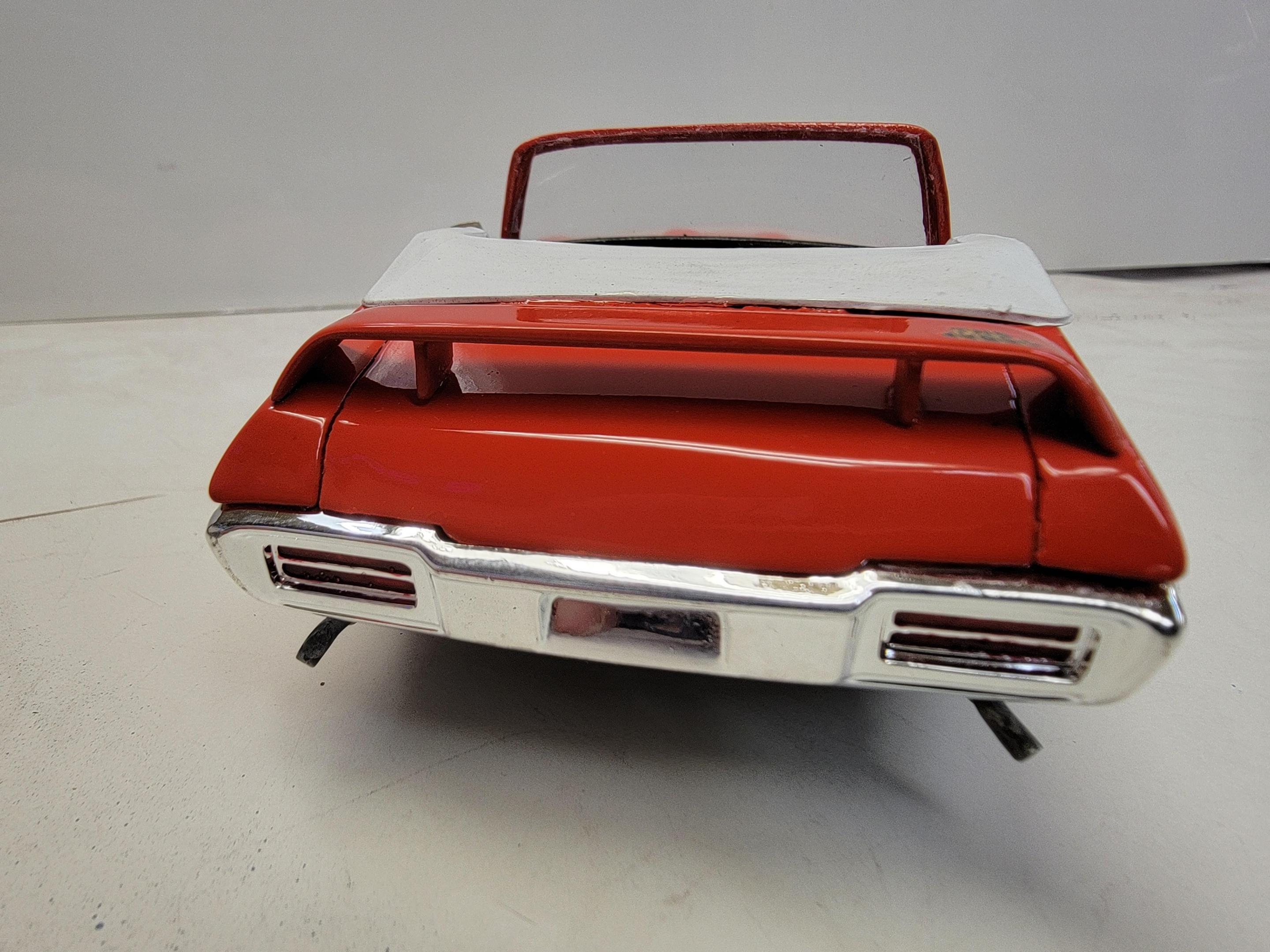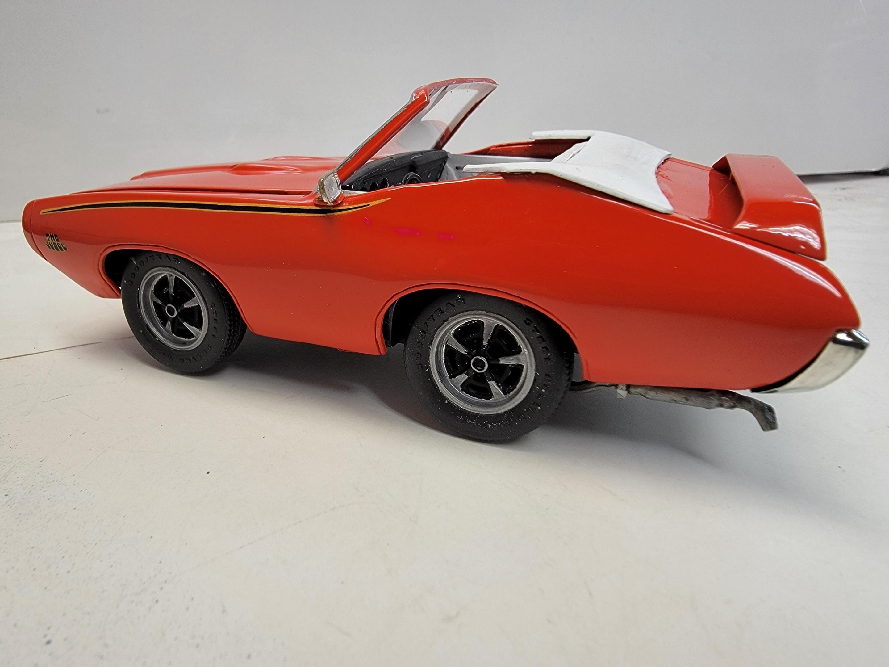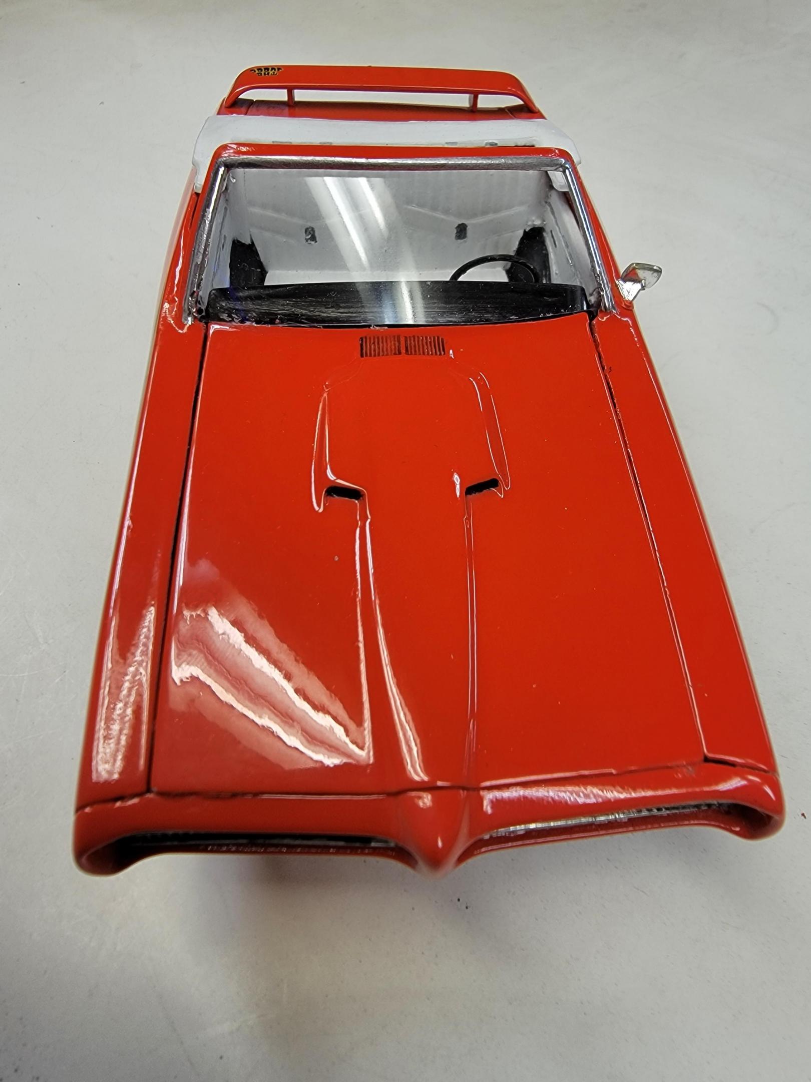 I got this off of eBay as a rebuilder. It needed a good cleaning and some repairs. The OB had done a nice job on shortening the body. I started with changing the windshield frame from the 59 Impala part the OB used to a stock Judge windshield frame. Painted it with Testors Hugger Orange an cut some stripes down to fit the shortened body. Then came the rebuilding and that's when the problems started. Had to glue the hood down due to the firewall hitting the hood in the rear and the front of the hood not wanting to sit flat. I managed to muddle through and it will look decent on the shelf. This is my 4th build for the year. Later-