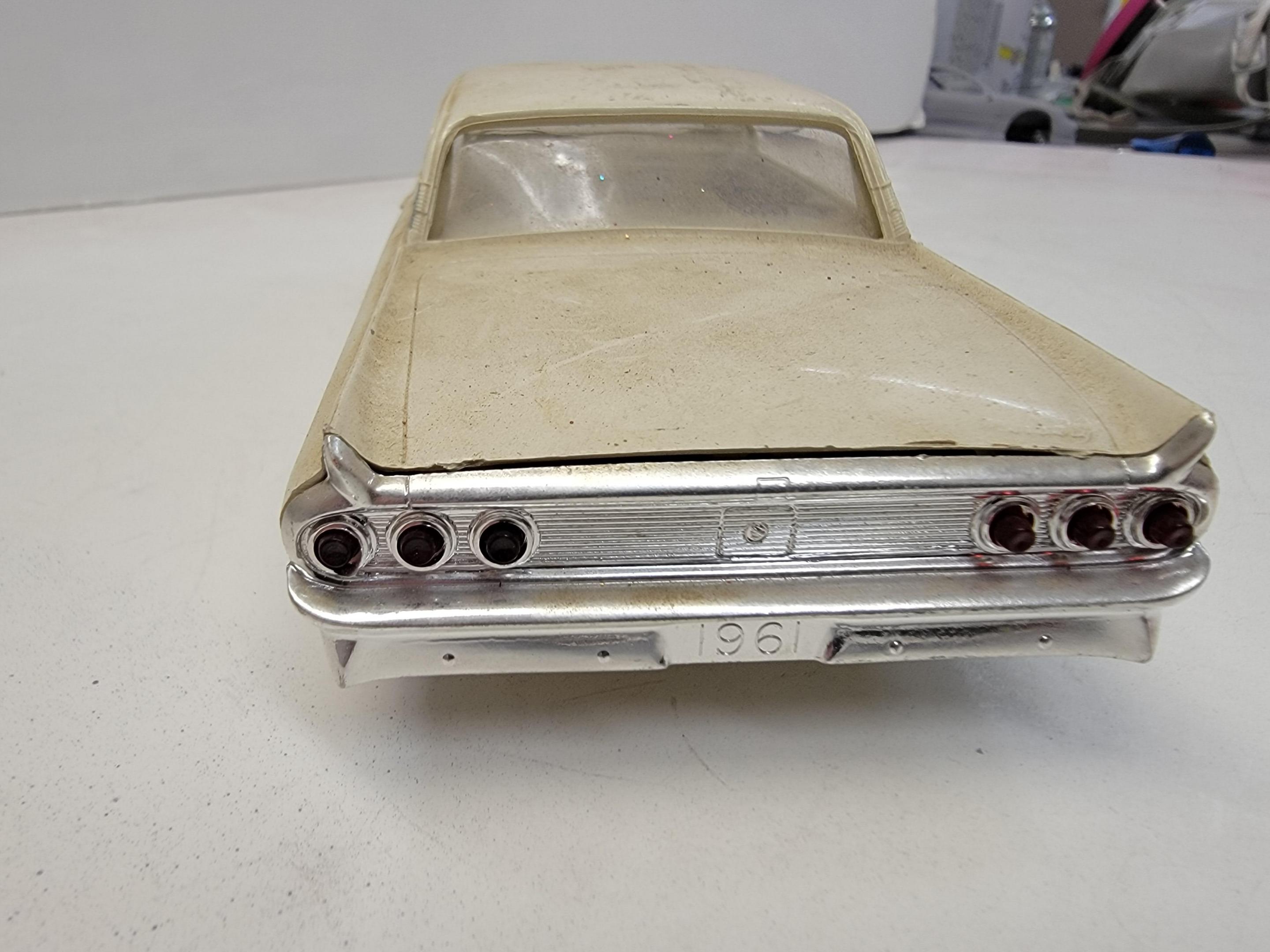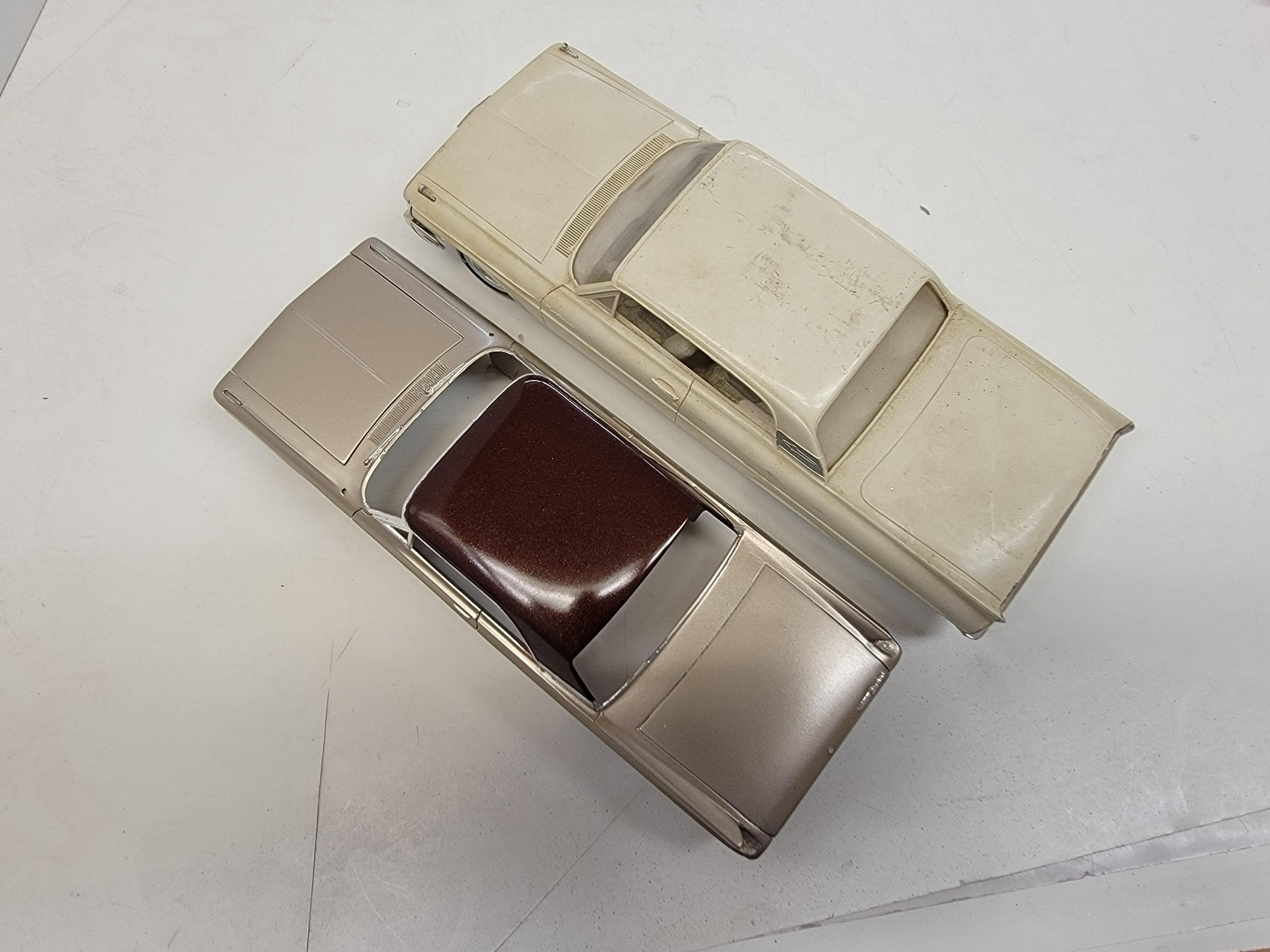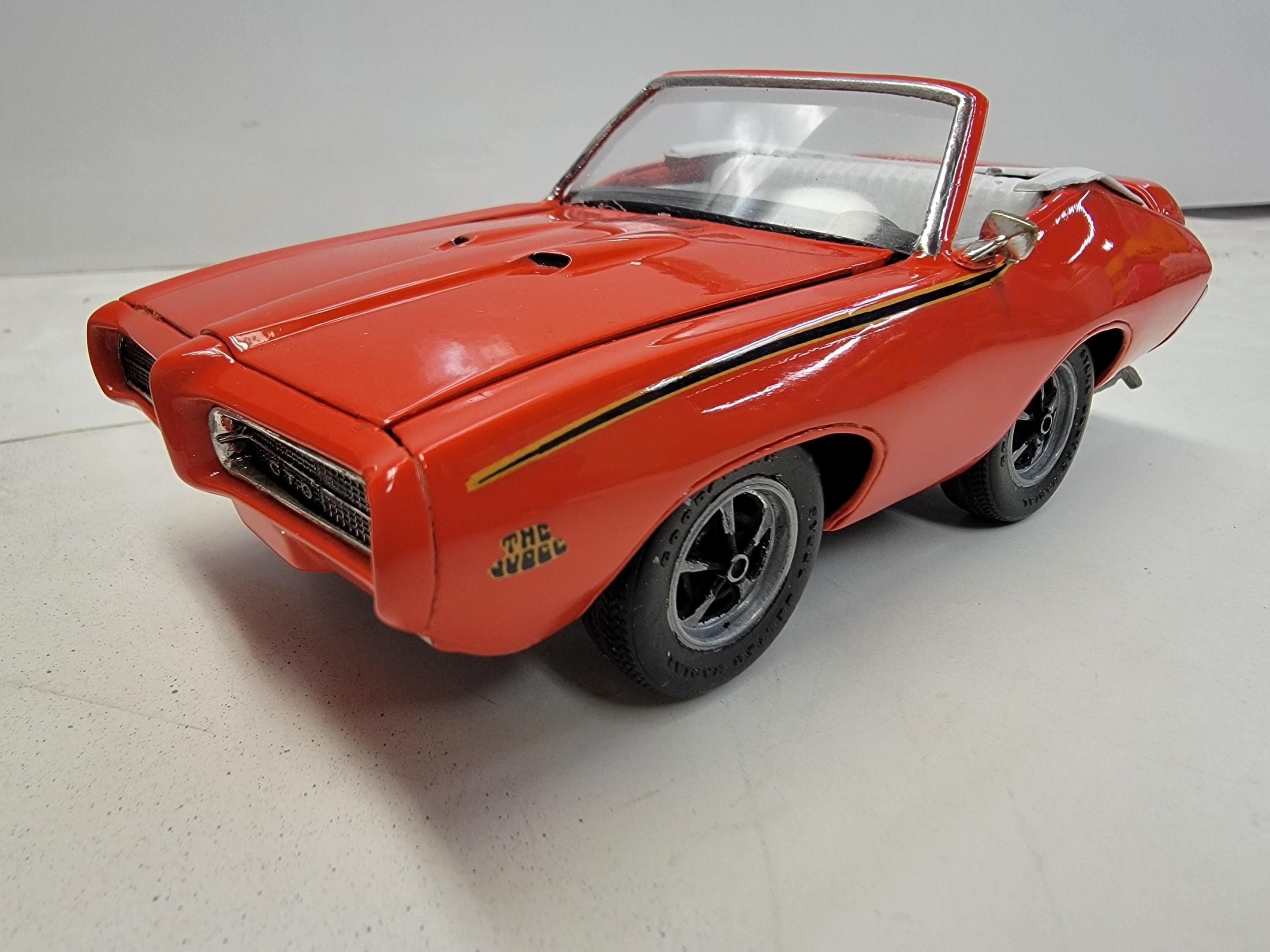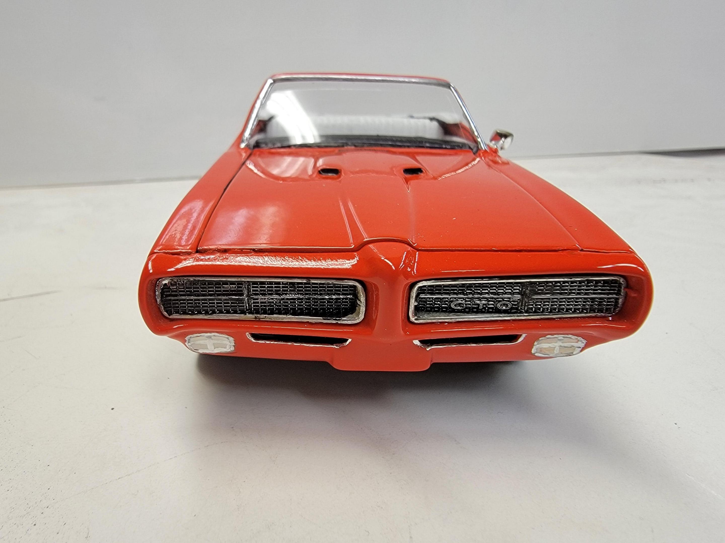 I got this off of eBay as a rebuilder. It needed a good cleaning and some repairs. The OB had done a nice job on shortening the body. I started with changing the windshield frame from the 59 Impala part the OB used to a stock Judge windshield frame. Painted it with Testors Hugger Orange an cut some stripes down to fit the shortened body. Then came the rebuilding and that's when the problems started. Had to glue the hood down due to the firewall hitting the hood in the rear and the front of the hood not wanting to sit flat. I managed to muddle through and it will look decent on the shelf. This is my 4th build for the year. Later-