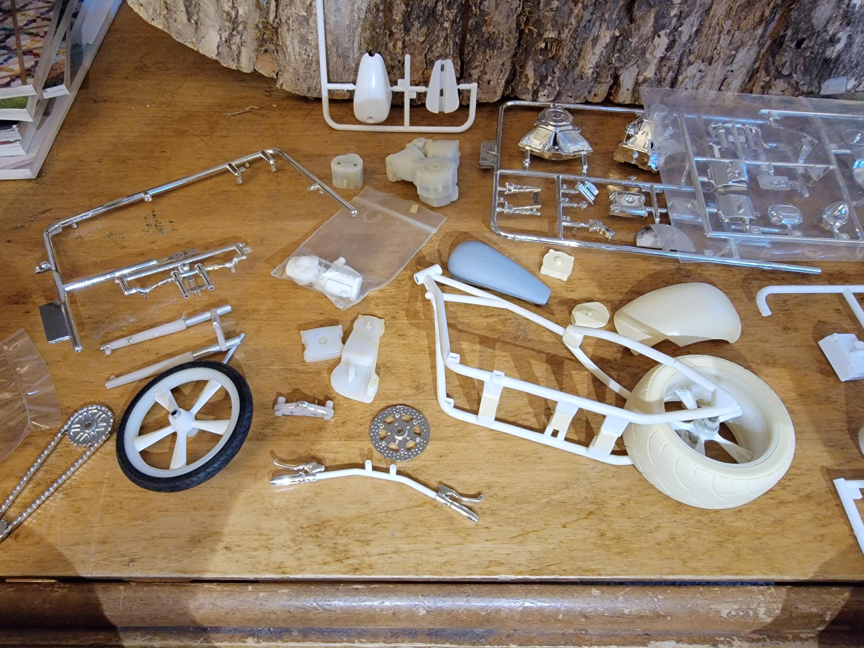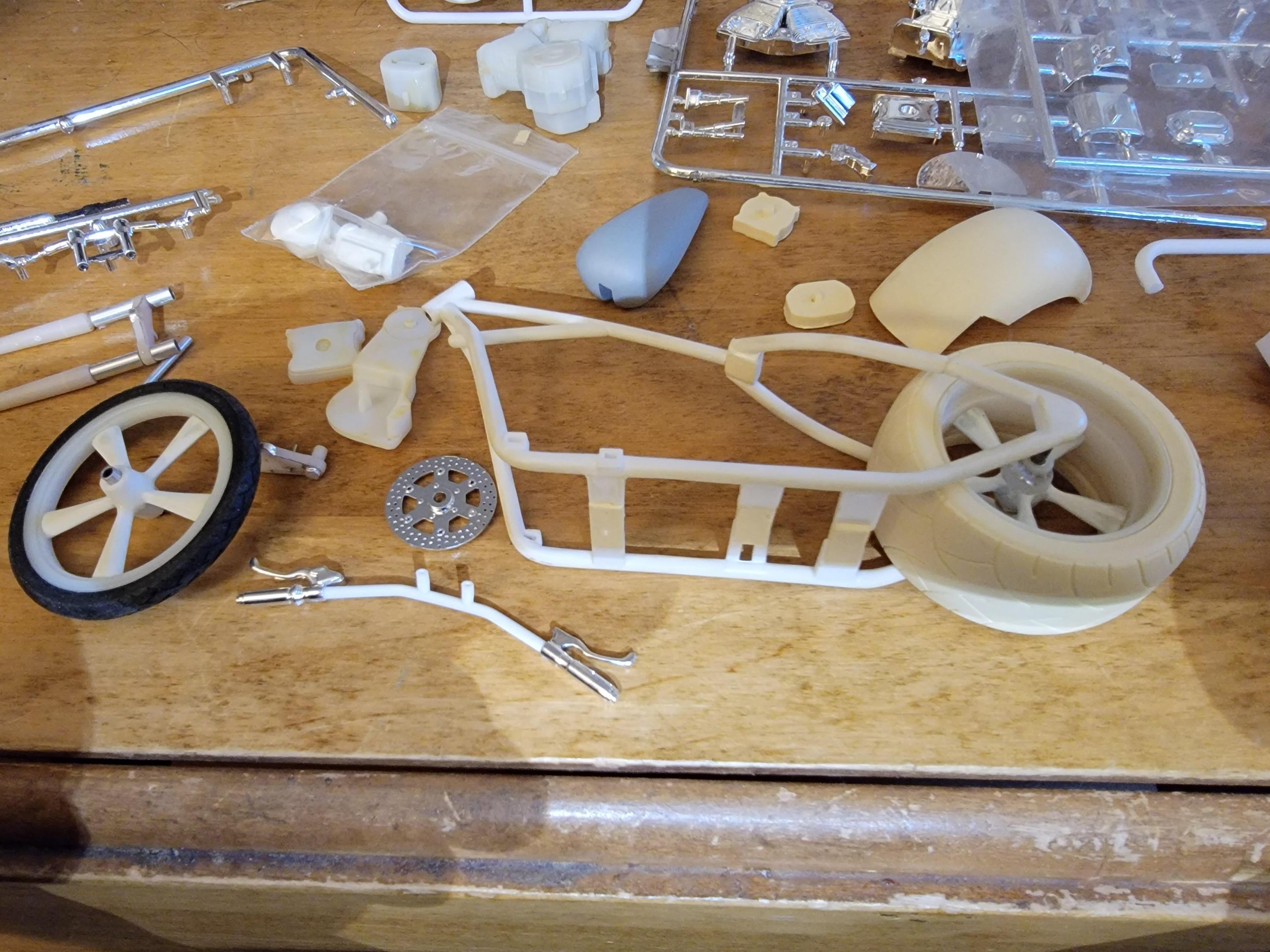 So, I just got 4 of these as parts kits from a guy. This is what I found in one.of the four boxes. Looking forward to doing something with it. Nice resin and custom parts. Let me know what you think and if you may have any info on who did the resin parts. Third pic is the resin rear tire and fender compared to the stock fender on the right. Later-