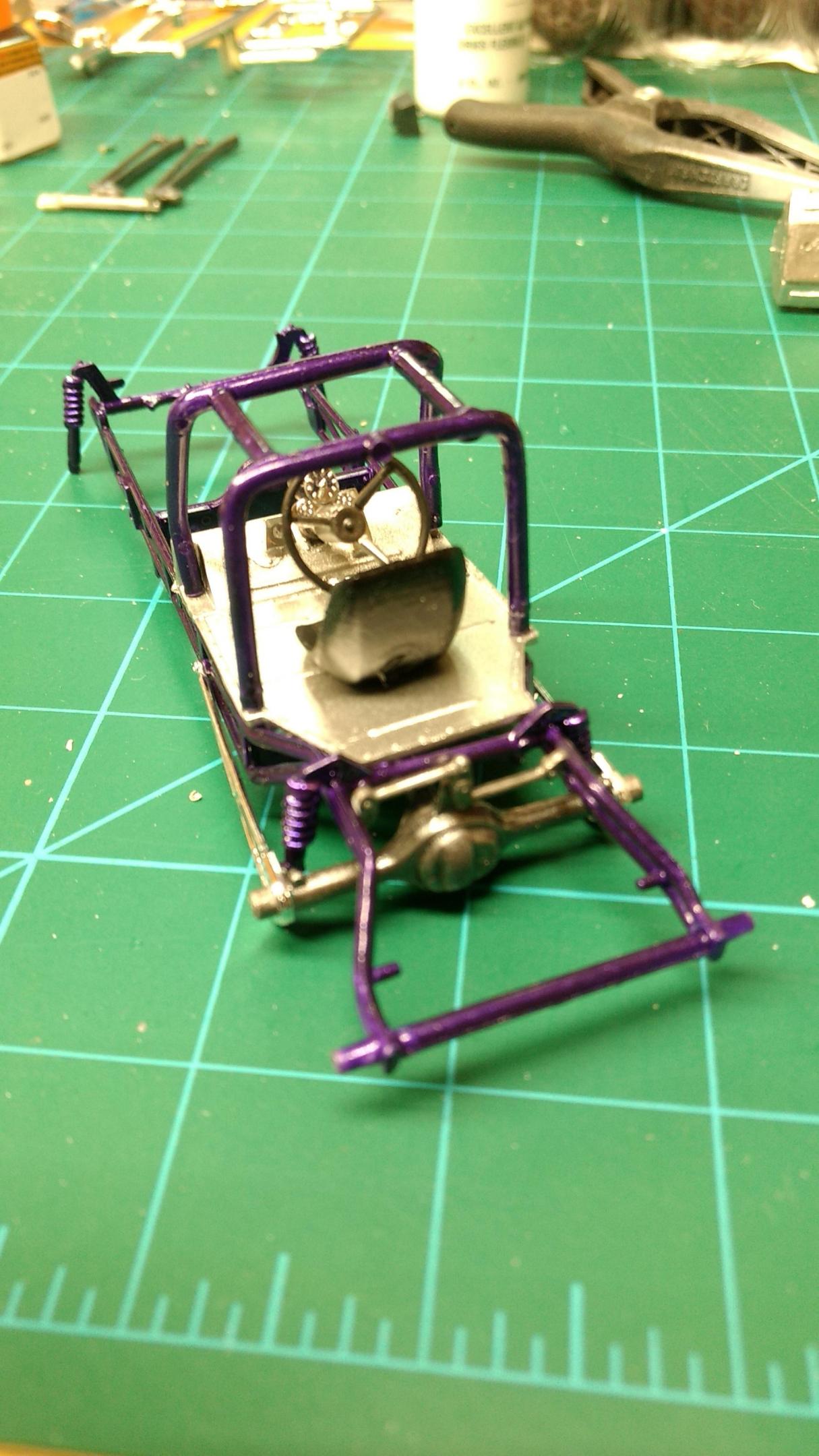 Update: 23 hrs (6 of that sleeping) and I am finished! The amazing thing to me is this build looks nicer than the 67 Mercury Comet drag that took me a month to build. Here it is. Paint is Testors Fiery Orange for the body and Testors Purple-Licious for the frame. Later- -