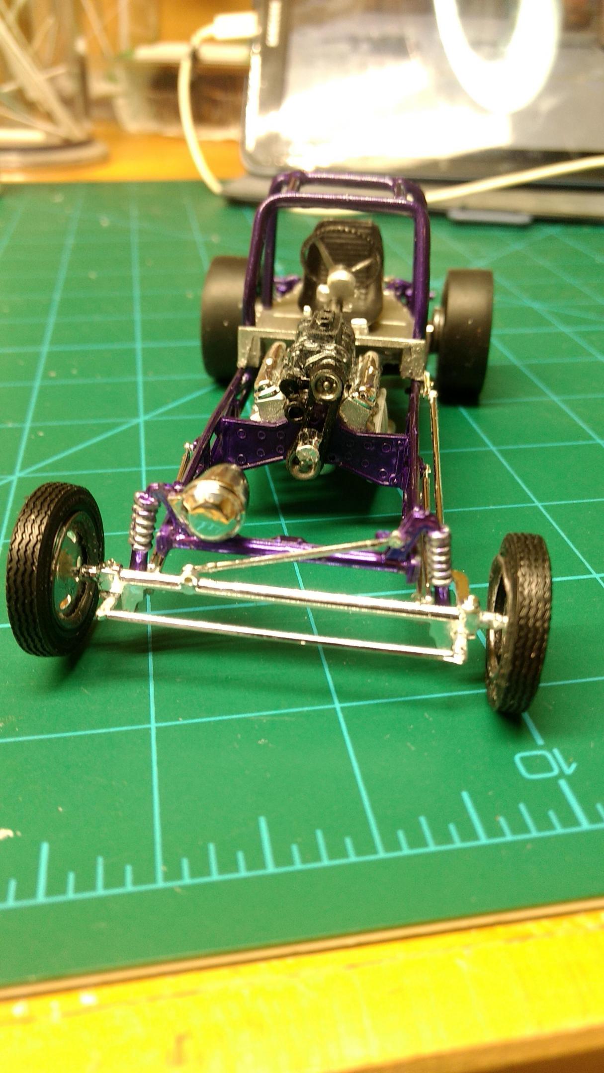 Mike, Looks good! Nice work on scratching the front assembly. I am doing the same right now on a 41 Willys pickup since I can't find what I need in the stash. I like the paint color too. And as for the stance, I don't think anyone is complaining (just stating information in a friendly way). I would just say that the car is in "launch mode". Later-