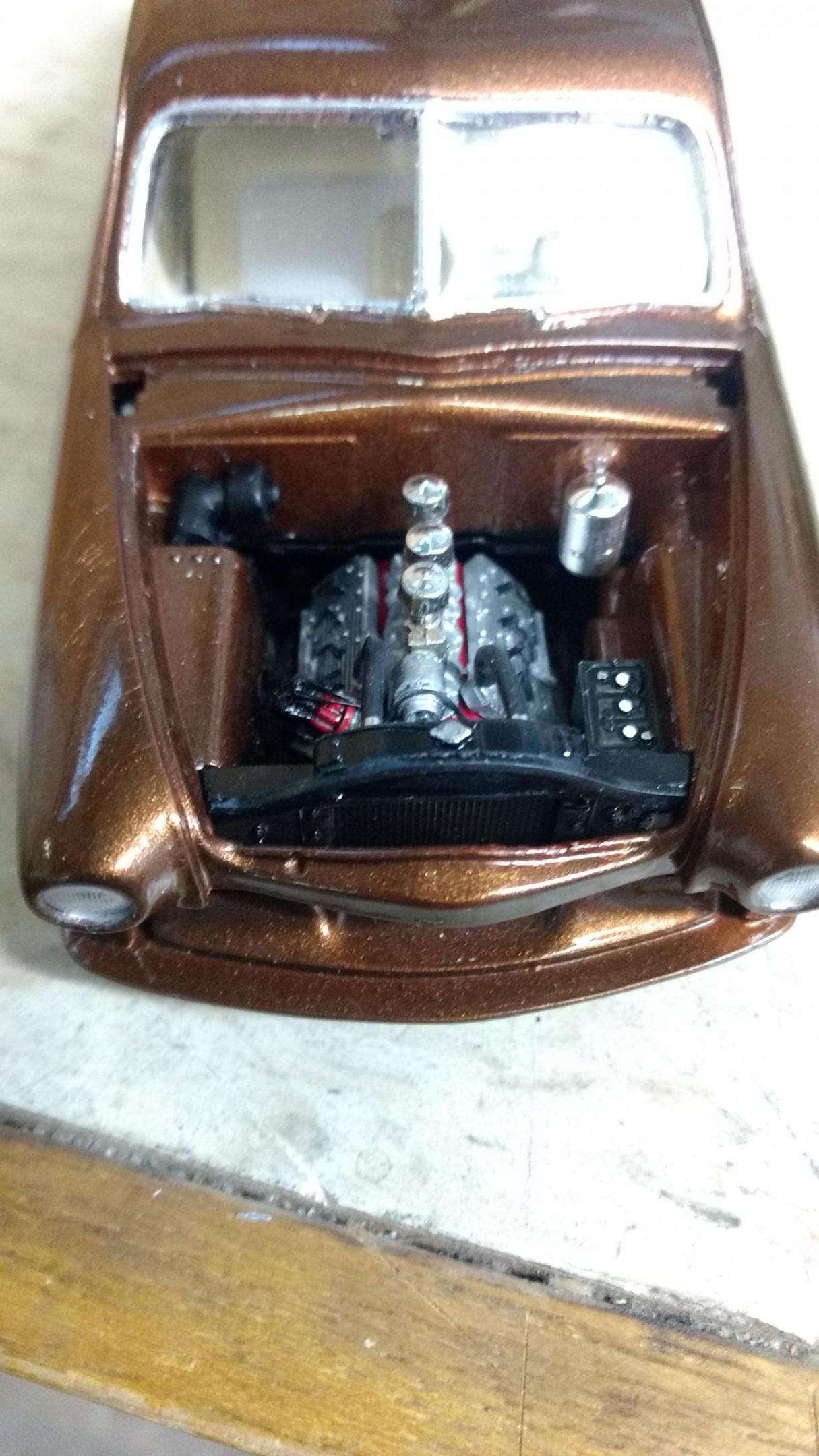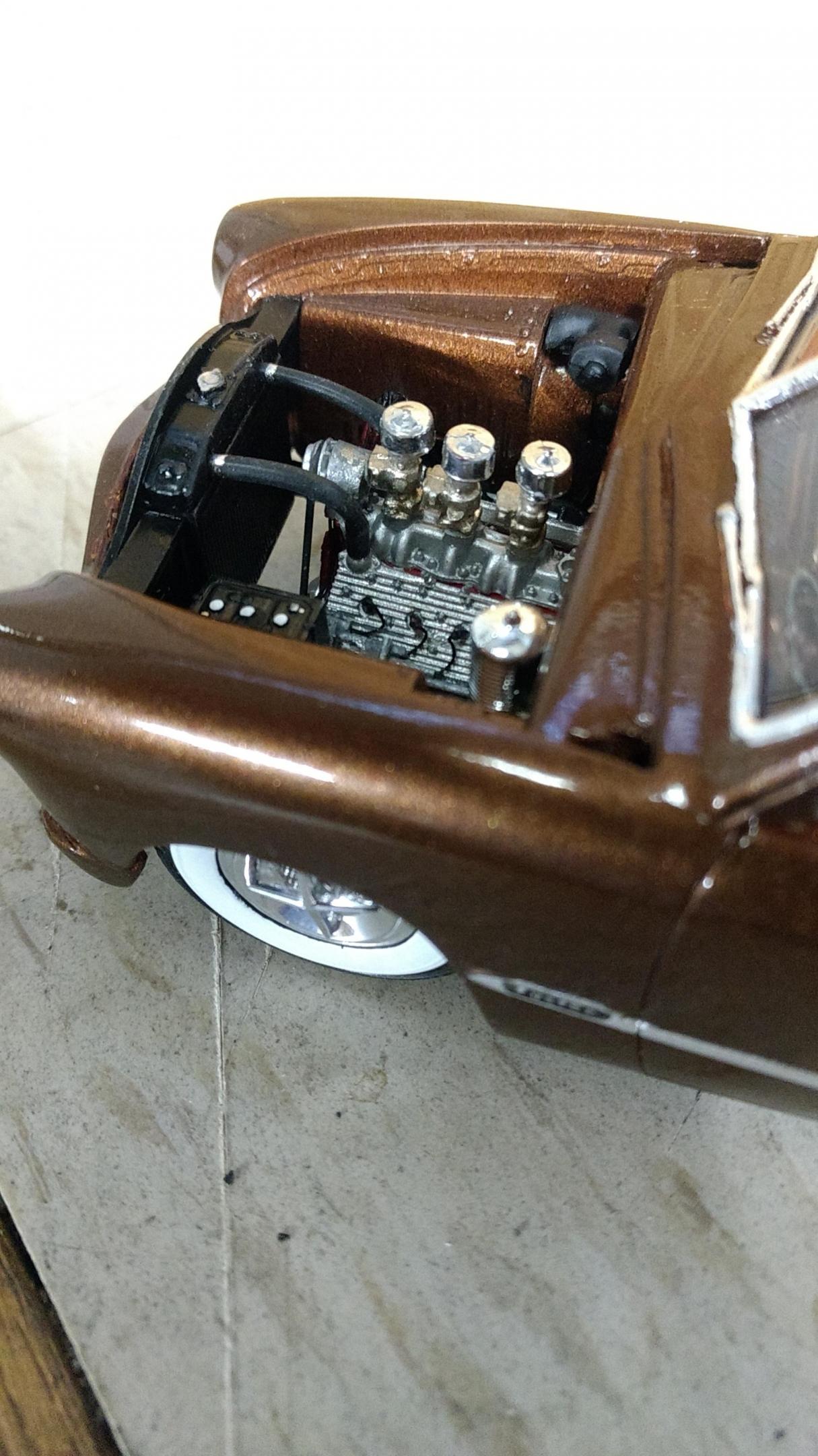 Got it up on the wheels and engine and exhaust installed. My bumpers and grill were airbrushed with Molotow last week and I've been resisting touching them until this point. Just need to get them installed, a mirror on and the Connie kit installed. Getting close. Later-