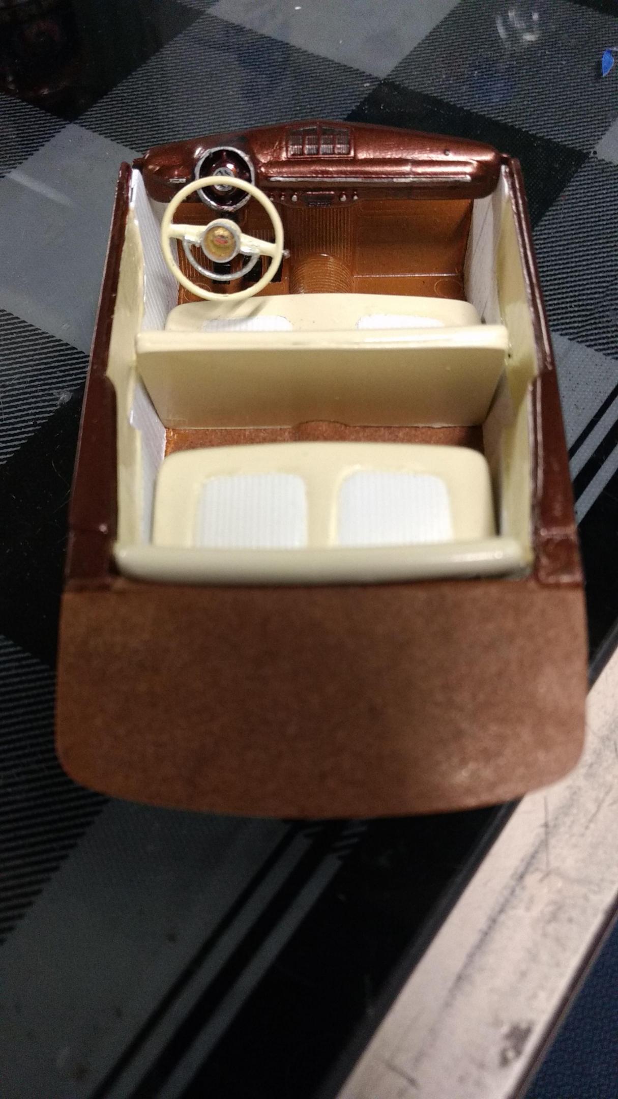 This is my next stalled project that I have been working on lately to try and get it finished. I started this build years ago to build a model of my cousin's 1:1 50 Ford Sedan. His was an unfinished project. I took measurements of his car. To pull it off I stretched the roof of a 49 Coupe and mounted it on a 50 Convertible. His plan for his 1:1 was to paint it Viper red. That idea didn't thrill me. Not long after completing the roof alteration on the model my cousin passed away and I put the project aside. About a year later I dug it back out and began personalizing it to how I would have built his 1:1. My idea is an attractive mild custom without being outrageous. Hence the "Girl Next Door". An understated beauty. Paint is HOK Goldmine Pearl with HOK Cocoa Pearl over that. Minor custom touches like removing the bullet from the grill, frenching the headlights and taillights, Connie kit and a few other mods. The mod I like the most is I customized the dash by using the grill bullet as a gauge pod for the dash. Plans are to use the engine from the 50 Ford pickup kit with a few custom touches and Pegasus spinner wheels and wide whites. Later-