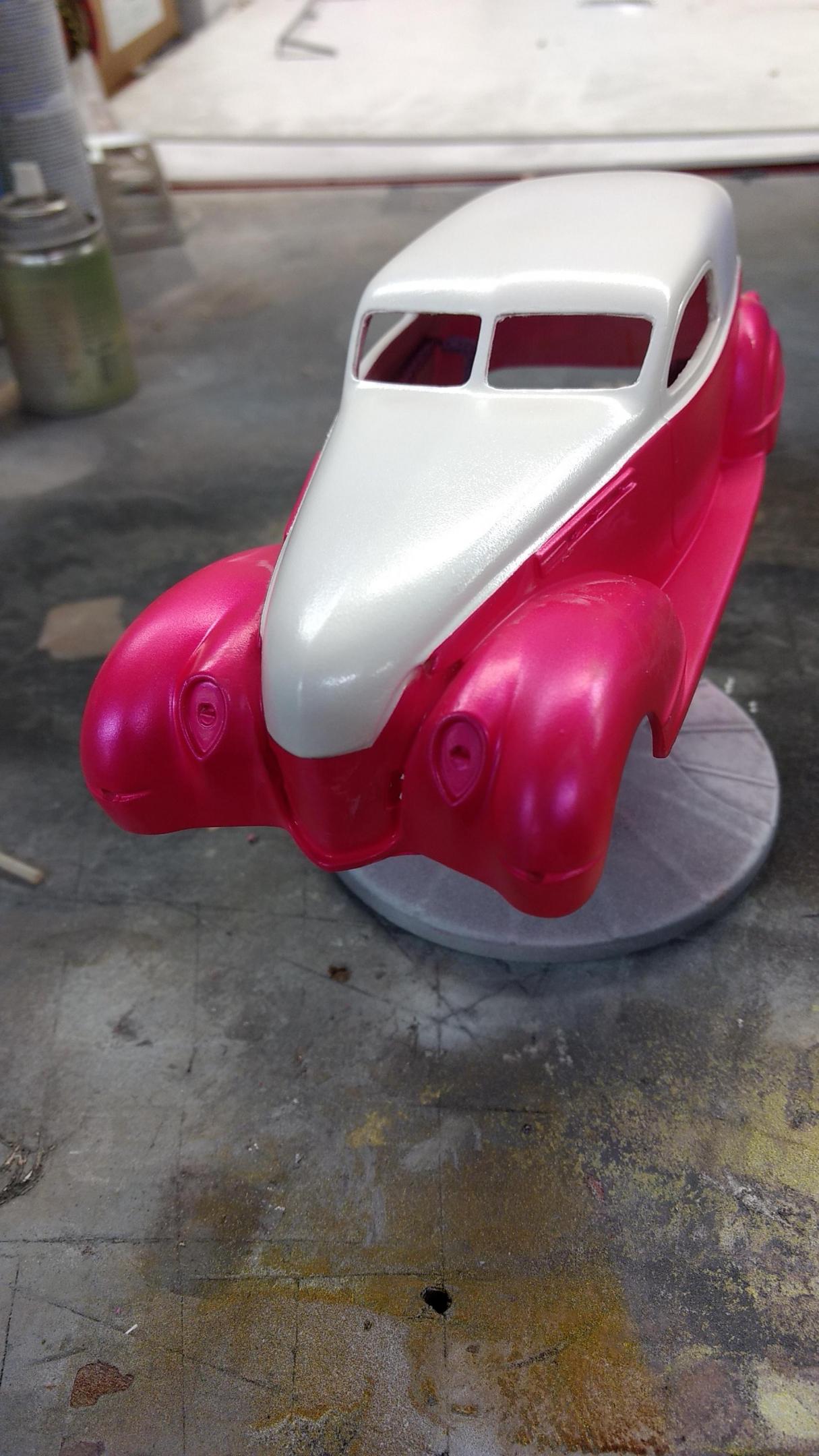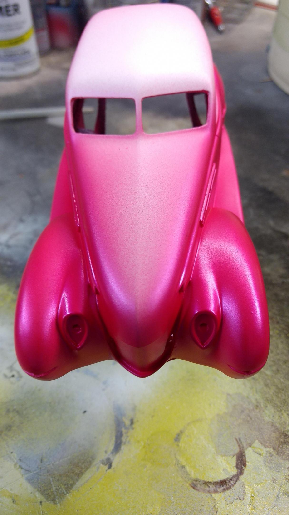 I started painting this yesterday as a quick build while waiting on things for my other two projects to dry. Going to be just as intended, a Slammer with different wheels. I airbrushed Pure Ice "Free Fall" nail polish for the pink and HOK Plain White with a light coat of Testors White Lightning for the Pearl White. I'll be removing the tape in an hour or so. Hope there was no bleed under. Later-
