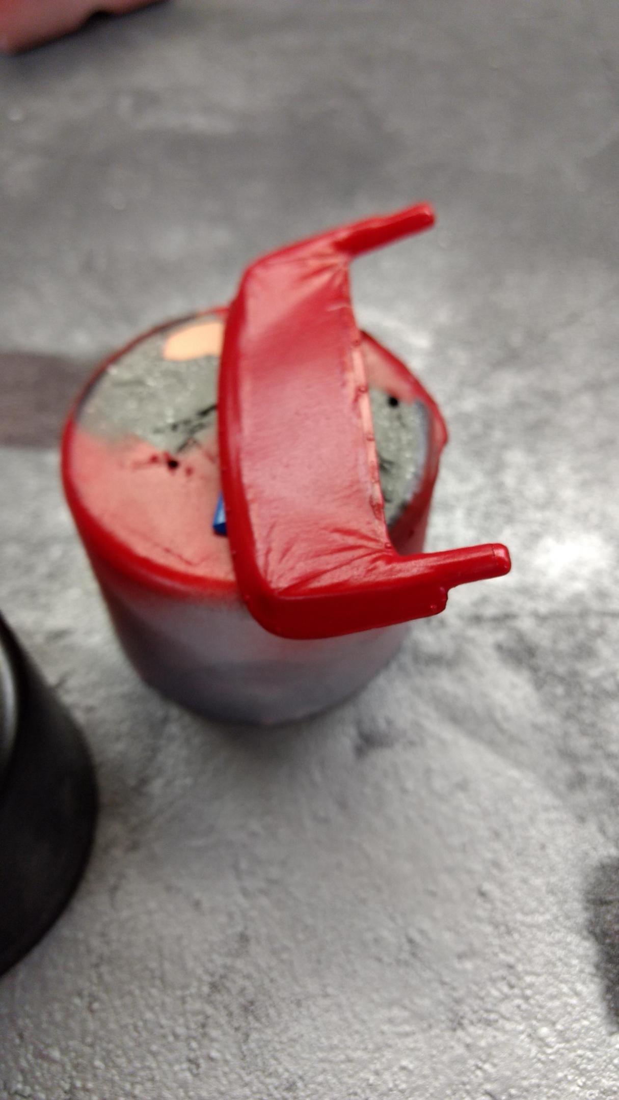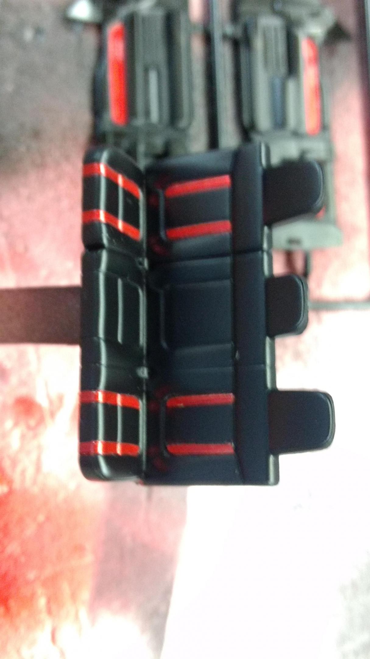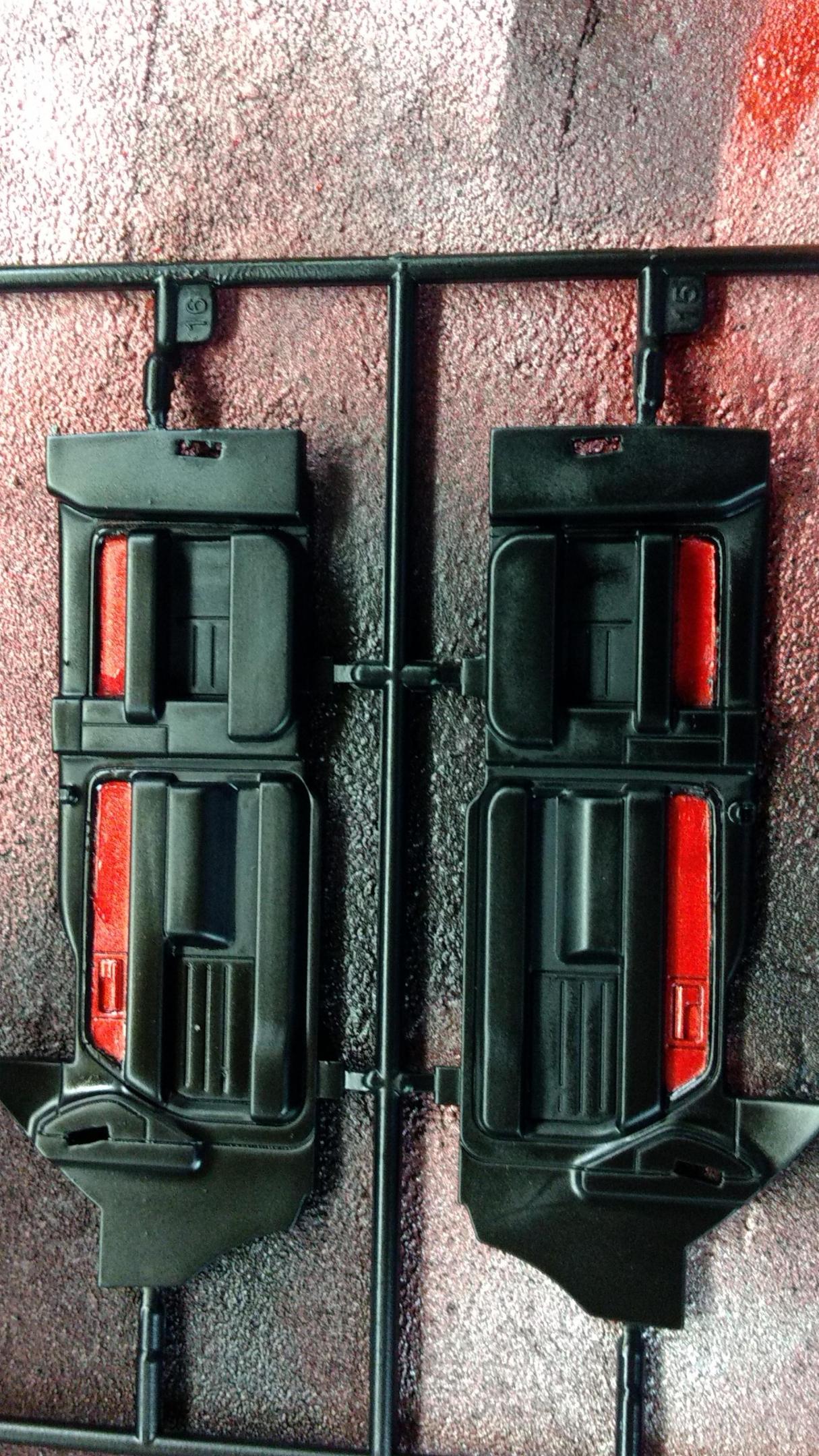 6. After viewing lghtngyello03's gorgeous blue Raptor, I wanted to start mine but have had to wait to finish (or get close) some other projects. I started by cleaning up and deepening some of the lines on the body and then primed it with Rust-Oleum White primer. In hindsight, I should have used grey because the Tamiya Mica Red was too light. (First pic). So this week I did some trial runs on scraps of plastic and found the combo to give me the shade I wanted. It turns out a light coat of Testors Brilliant Platinum under the Tamiya Mica Red did the trick. I still need another coat of red after some wet sanding. That will happen later this week. Got to go get another can of Mica Red. My plan is for Tamiya Gun metal for the flares and such. Stay tuned. Later-