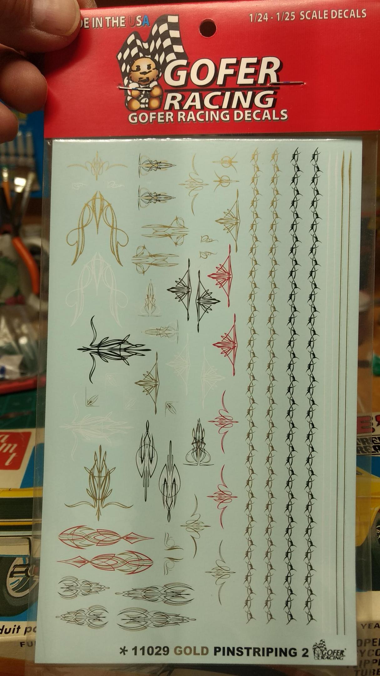 Just arrived at the doorstep! Beautiful pinstriping decals from Gofer Racing to grace some builds. And my most recent eBay purchase. I'm glad I hit the Buy Now on this one at $30! I just went this morning to find another and no combination of words showed another on eBay. This Merc is only missing the instructions and one front wheel. The trunk area looks like the lightly painted body got liquid cement poured on it. I'm guessing it will sand out easily enough. If not, I'll have decals made and name it "The Scalded Dog". Later-