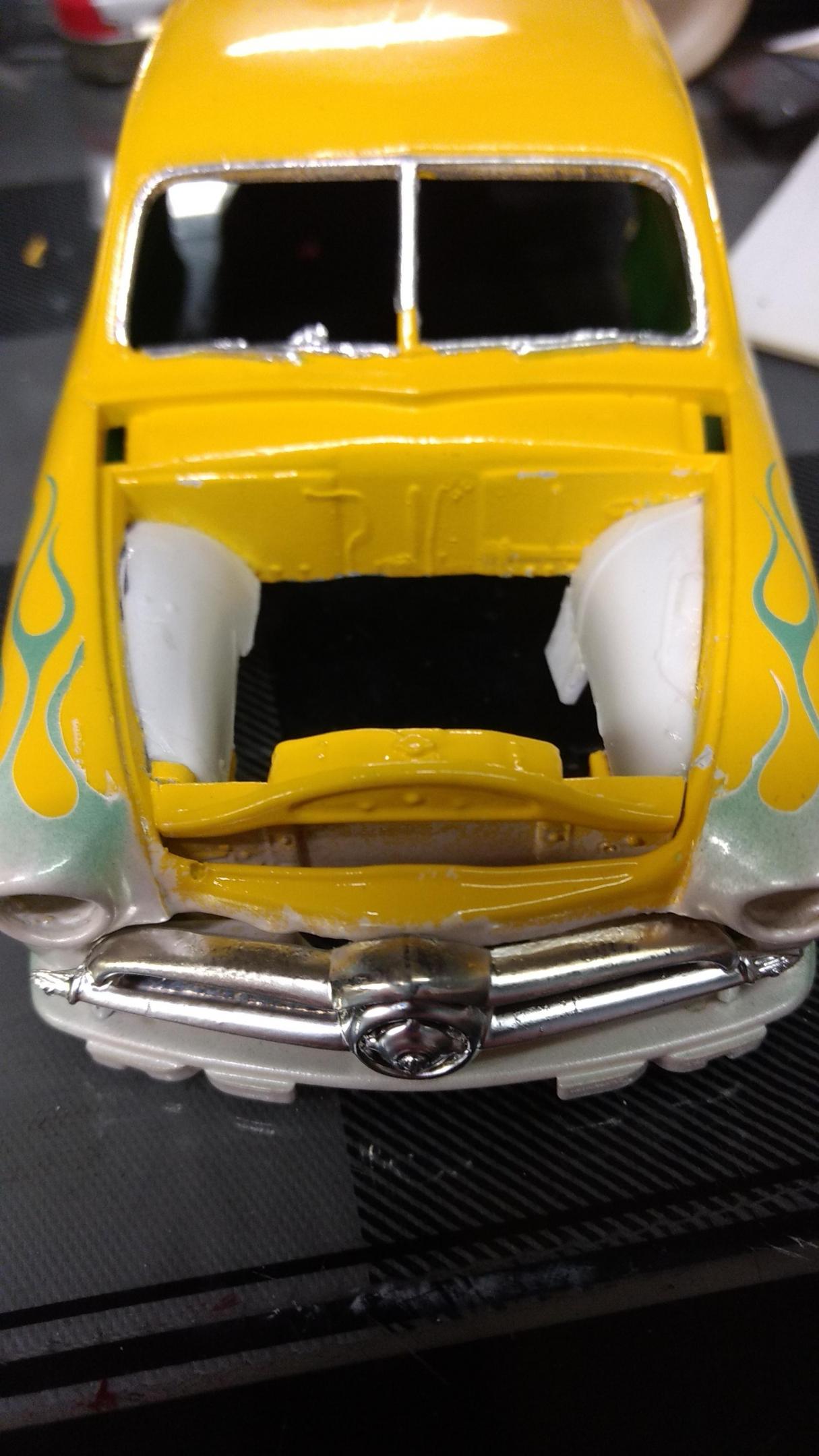 Good morning! I'm still plugging along on this during breaks at work. That's why progress is slow. I got the dash and wheel completed, with the exception of the gauge decals. I am waiting to get them from Best Model Car parts. They should be here in the next day or two. The steering wheel and column are just sitting in place. Because I painted the body a couple of years ago I didn't think about the chassis fitment. In order to get the front suspension lower I needed to redo the front wheel wells. I know the sequence of events is completely wrong. Oh well. I cut the wheel wells out and redid them with trimmed down wells I had laying on the bench from an 84 Chevy pickup. Once I get this all done I will tape off the engine bay and spray it yellow. Later-