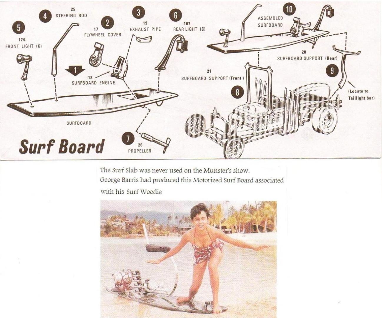 Something else I found while searching for info on the Surf Woodie was George Barris produced a Motorized Surf Board to go with the Surf Woodie. There is a Motorized Surf Board in the reissue Gramdpa Munsters Drag-U-La. You'll notice the one in the Dragula kit is different that the one in the photo(Off the net) Not sure what type engine is on the board in the photo.