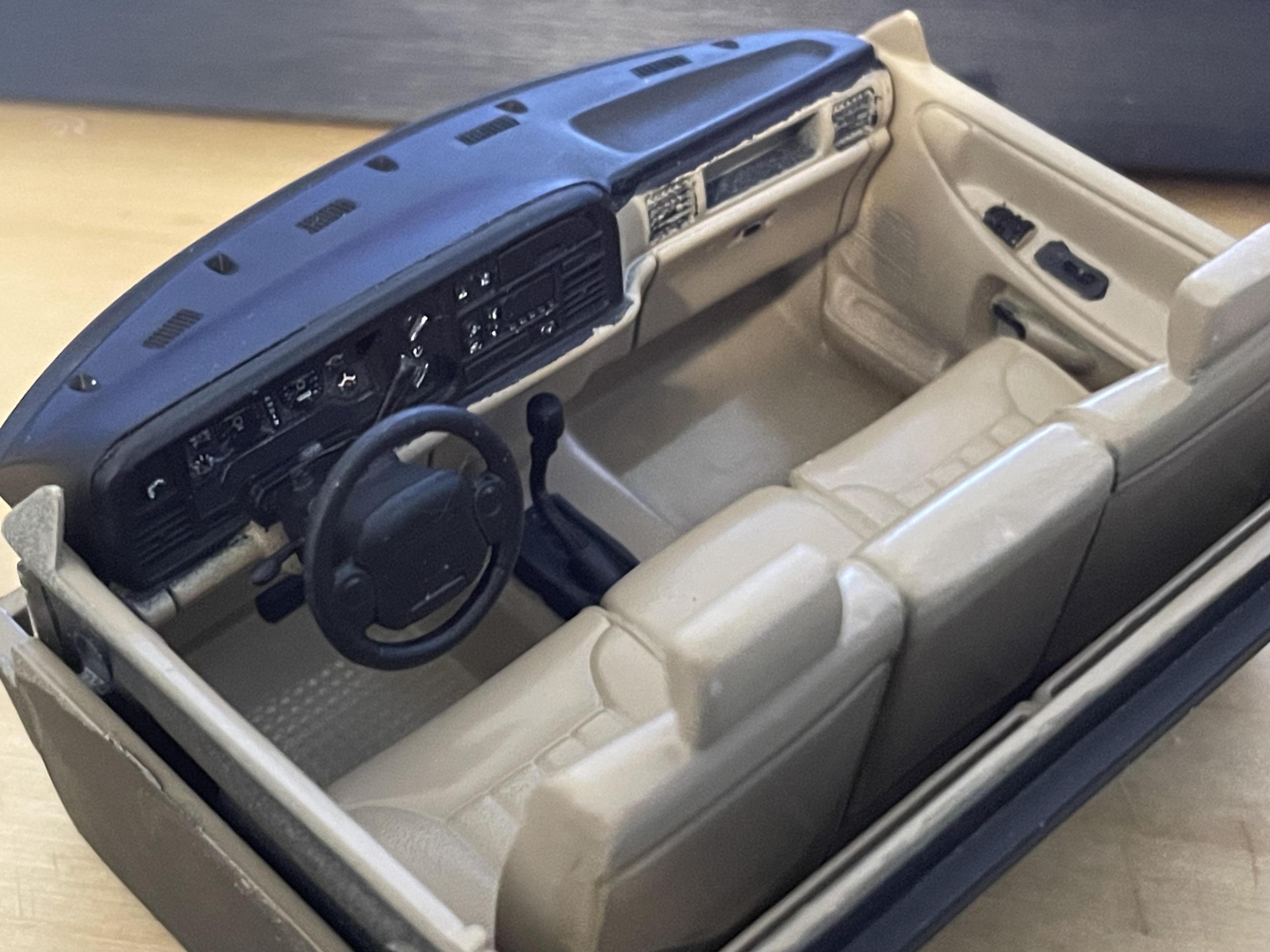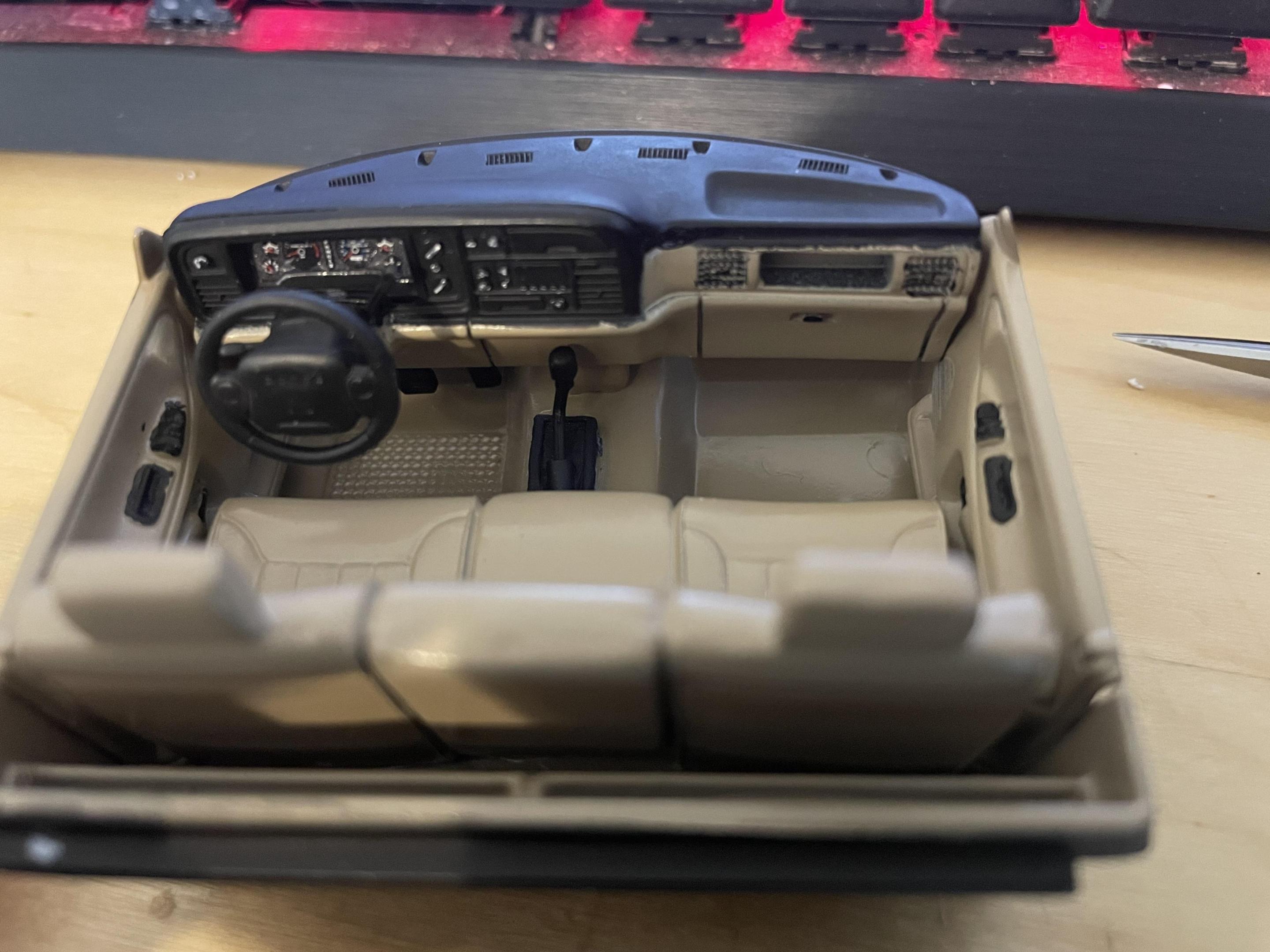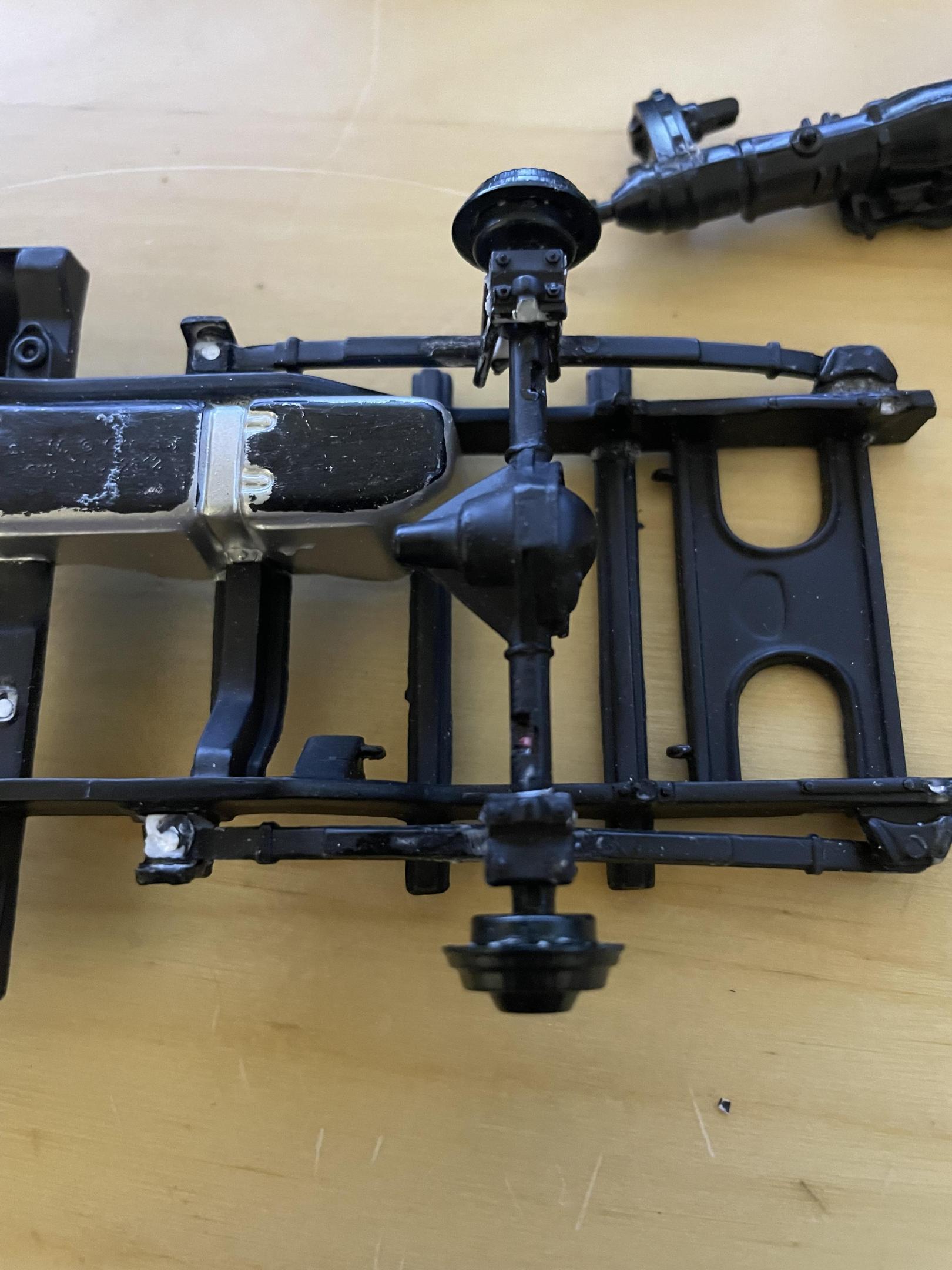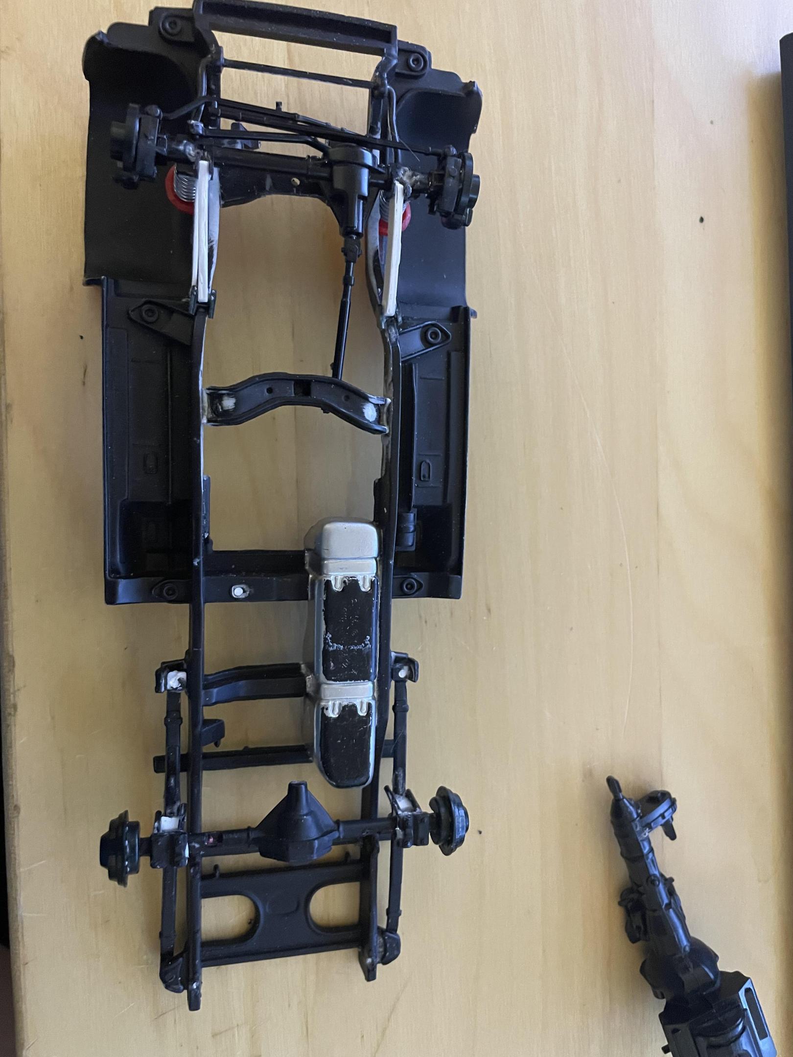 I was trying to figure out how to make a more common Ram 1500 out of a stalled Ram VTS project, and I realized that the Tamiya Grand Cherokee had just what I needed! I know they are different scales but the size difference was very minimal. I grabbed the drivetrain (minus rear axle), relocated a couple of the crossmembers, removed the 2wd suspension mounts, flipped the forward leaf spring mount, added lift blocks, and scratchbuilt a front suspension. The brakes also fit the kit rear axle perfectly! Here’s the finished chassis work, off to paint the interior!