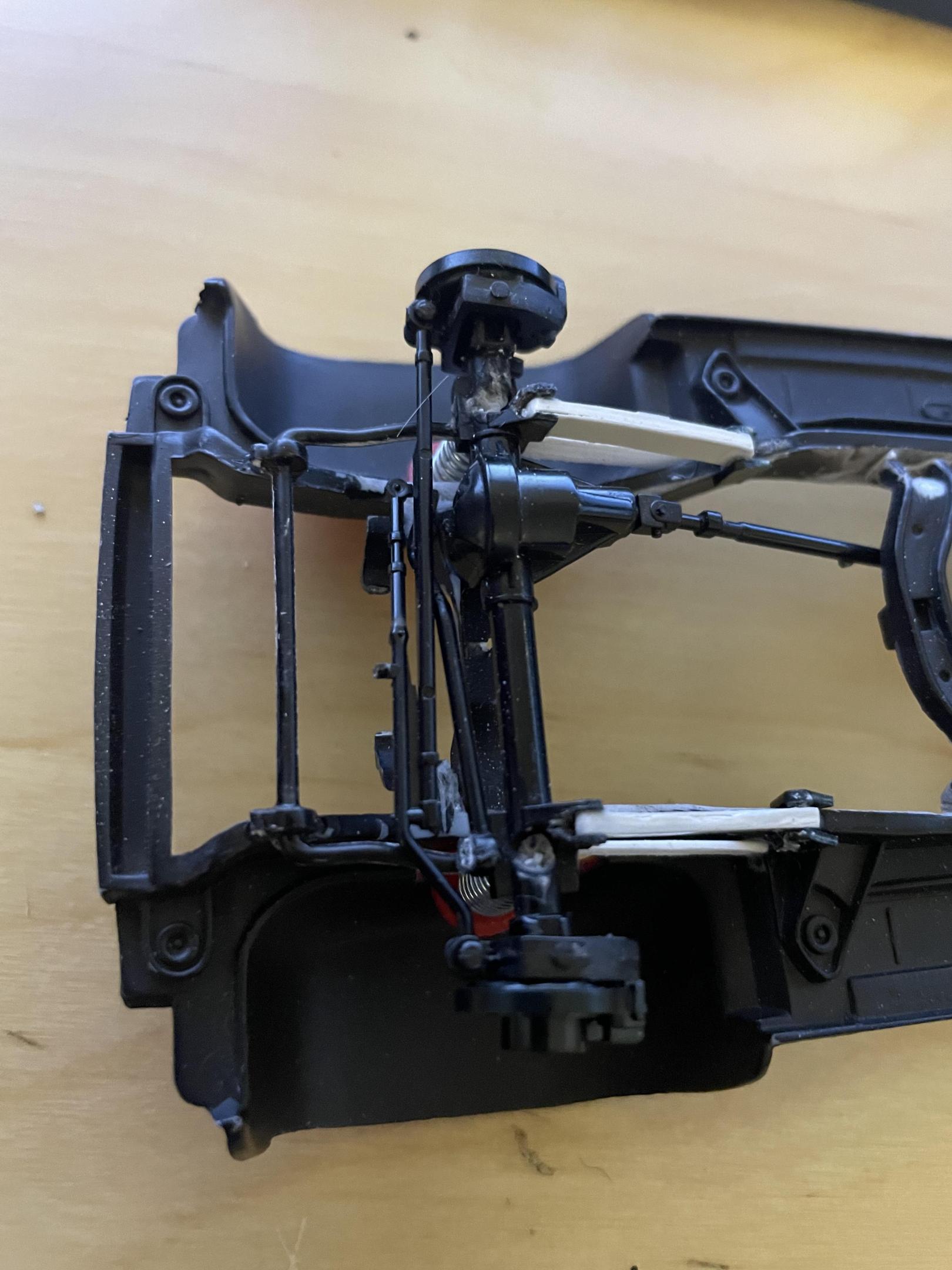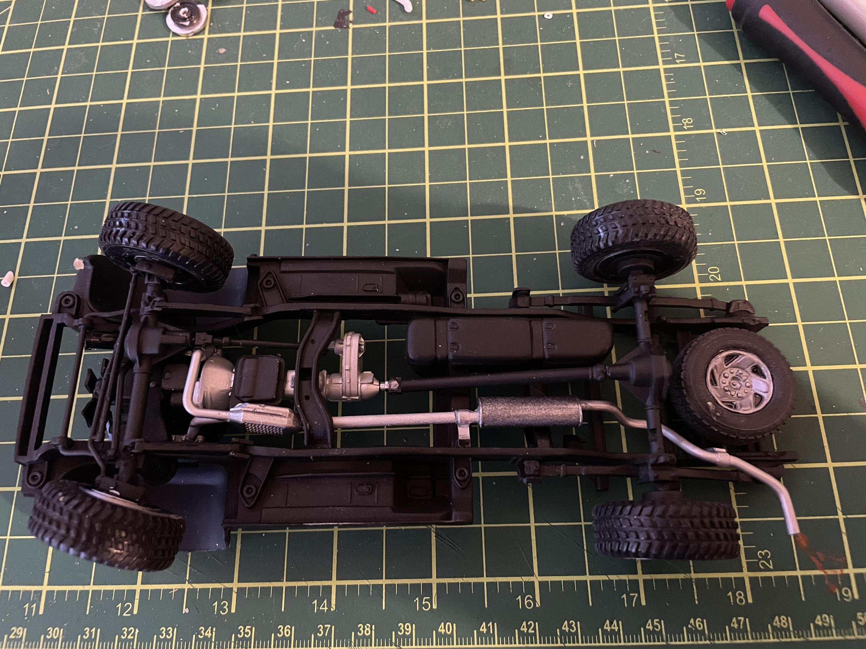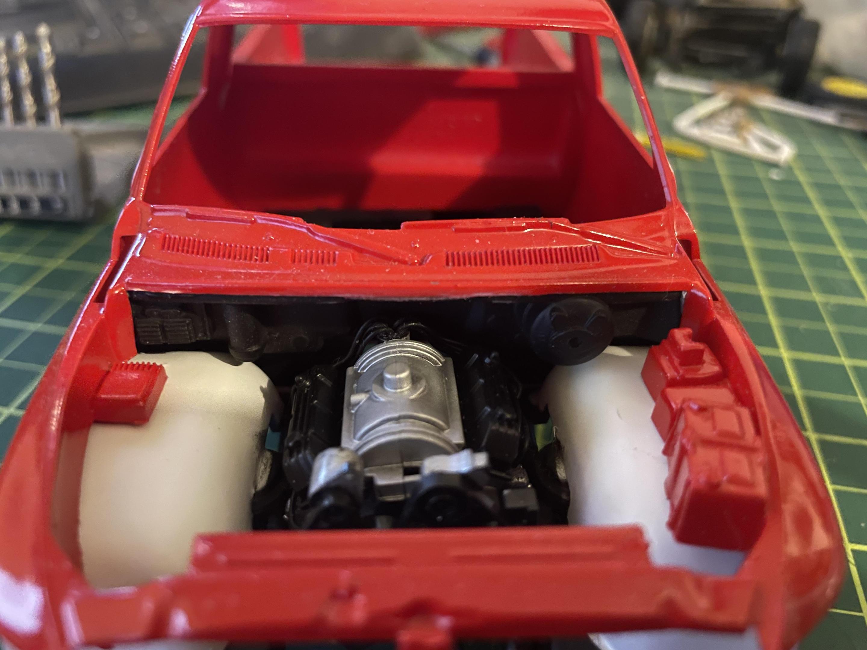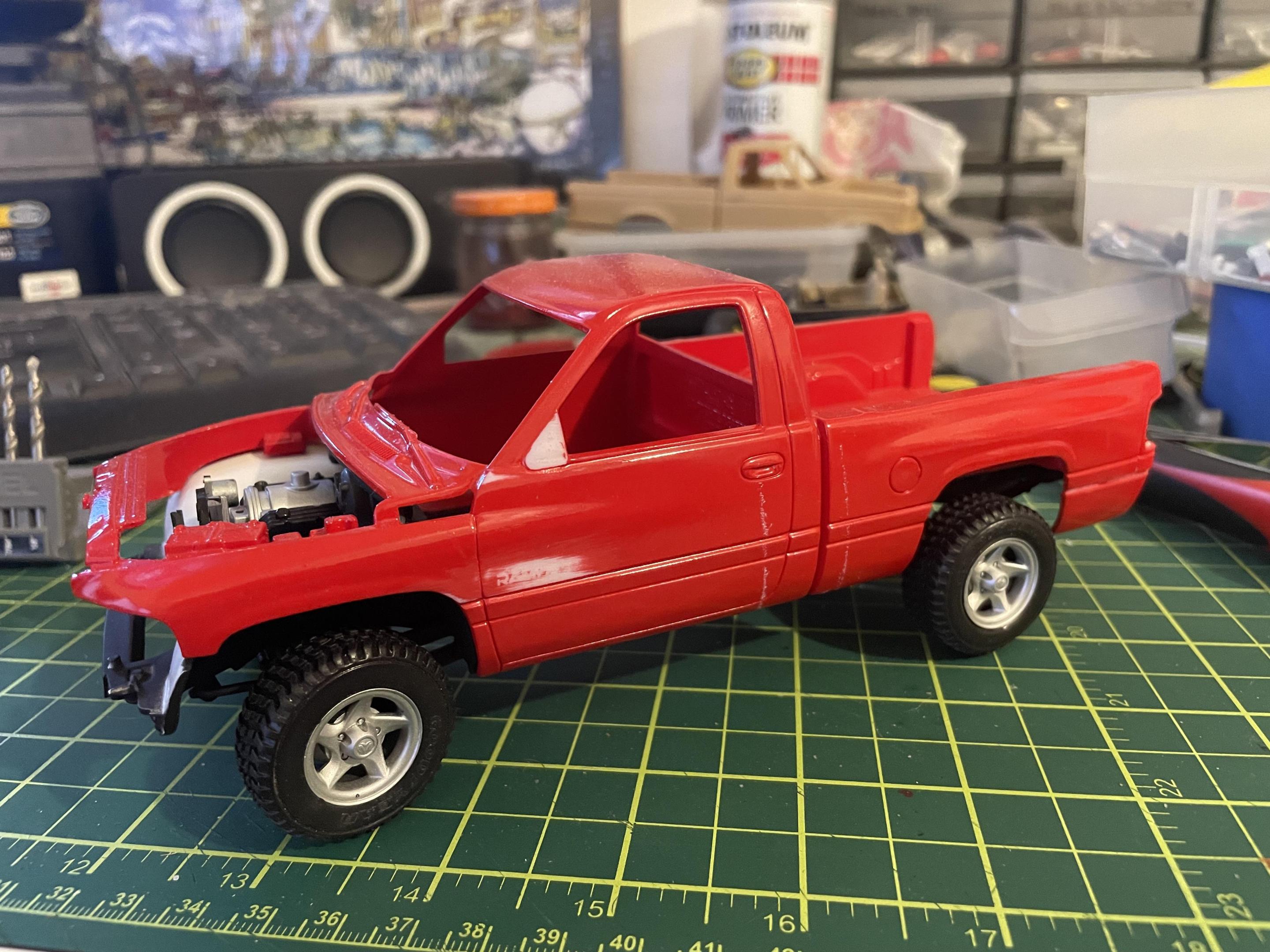Thanks! Here is the completed chassis assembly as well as the stance with the body in place. As for color, as you can see on the inner fenders i plan to go with a white body (the red is from my first iteration of the kit). The wheels and tires are from a diecast version of the Ram Sport that I have. In the last pic, you can see how well the engine fits in the engine bay!