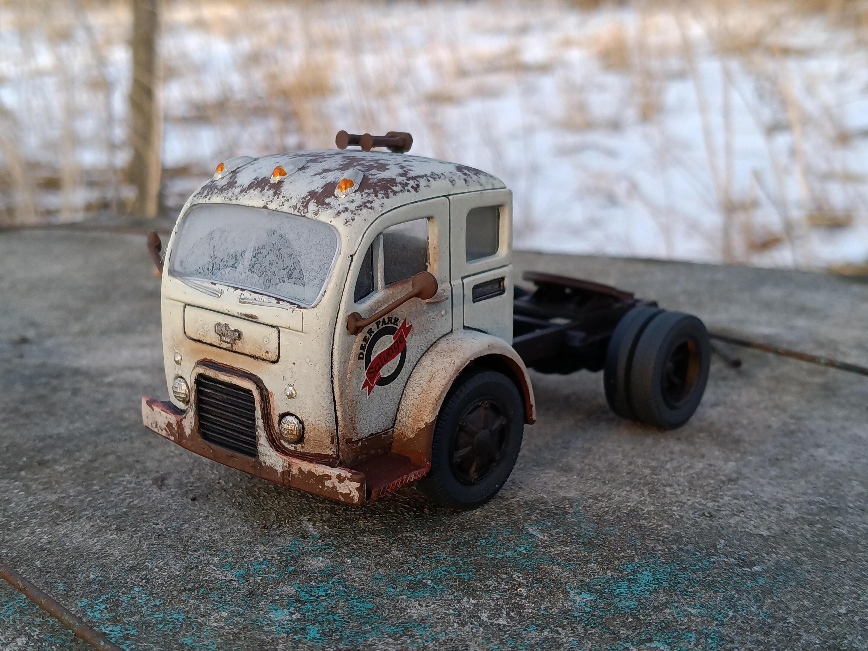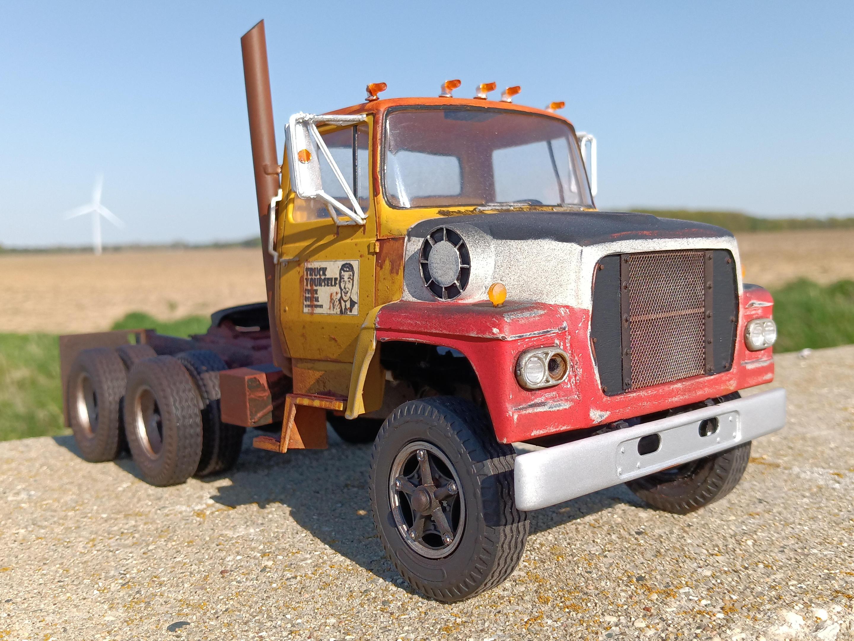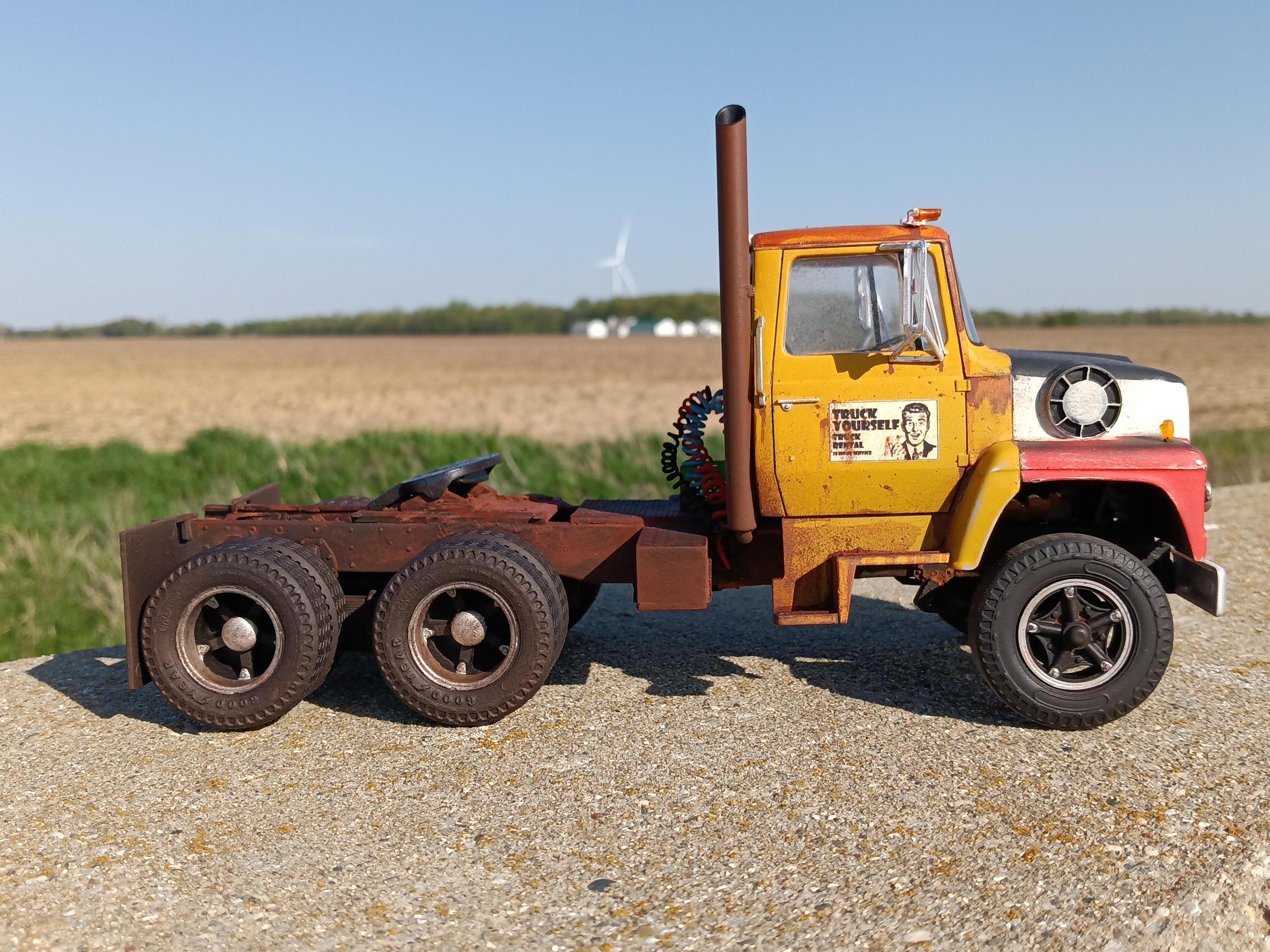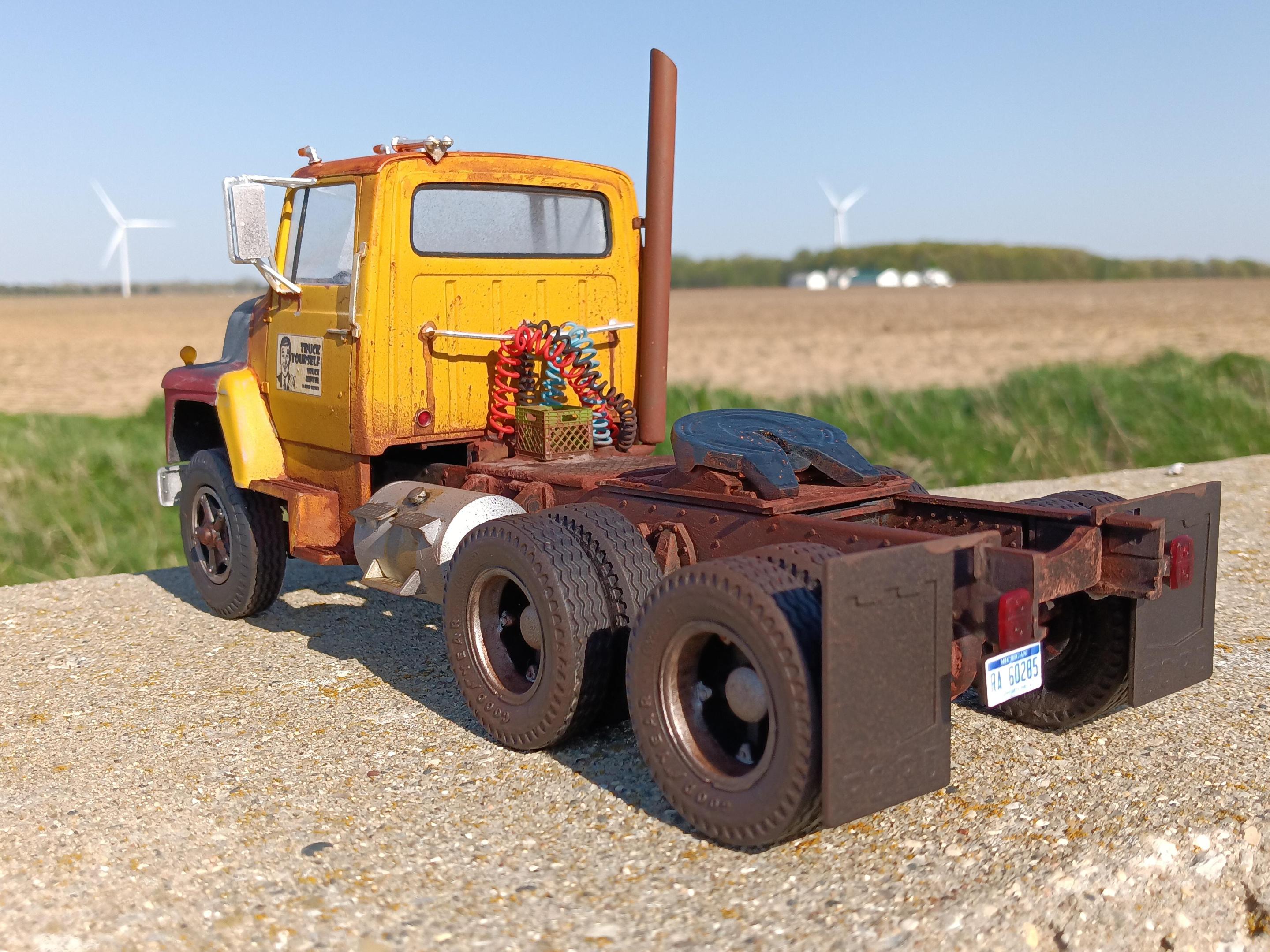 13. So... I had an incomplete AMT plow truck, a box or two of spare Louisville parts, some AITM rear wheels and tires, and some Models by Dave cab steps. I decided to combine the whole mess into one tattered tractor. The quad headlights came from a White Road Boss, I added them after seeing a junkyard Louisville that had been fitted with a similar setup. The paint scheme on the hood was inspired by a neighbor's old LNT dump truck.